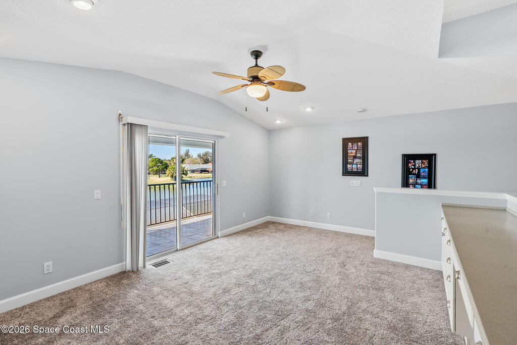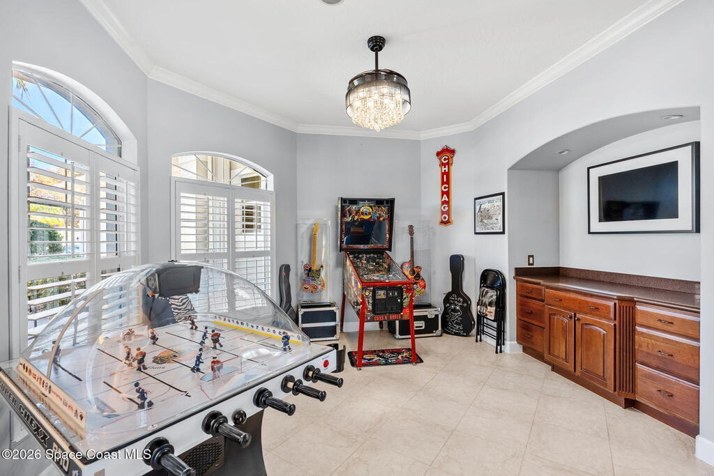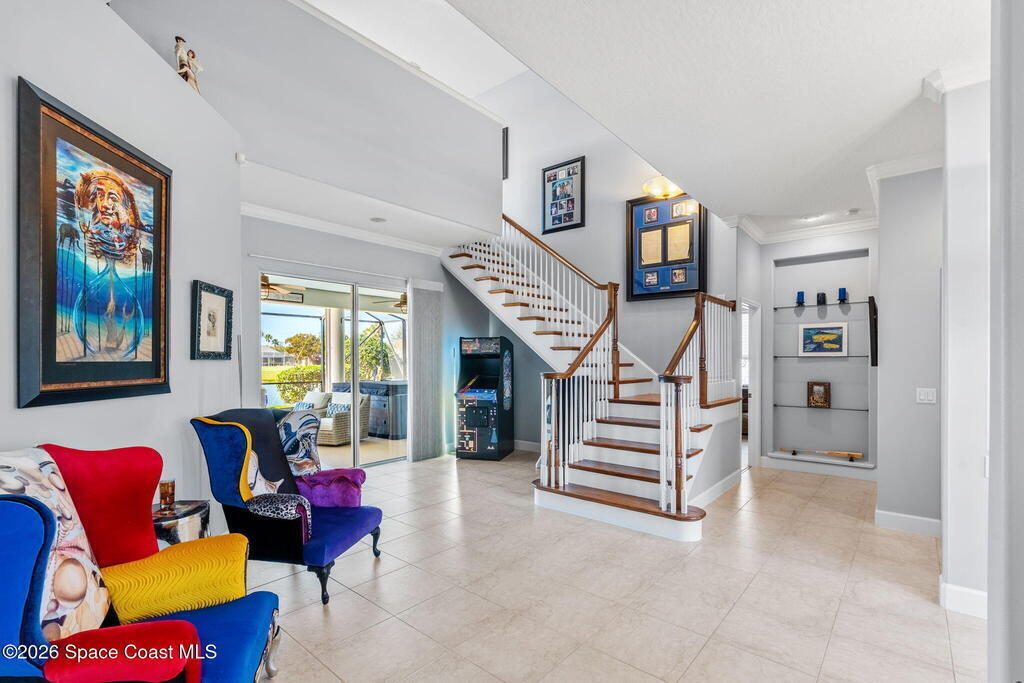 WELCOME to this STUNNING Merritt Island Golf Course Residence! A custom-built home that encompasses the best of impressive upgrades & builder touches. Tour this elegant 3 BED 2.5 BATH PLUS a private Office home that is beautifully appointed with soaring ceilings, a Chef's Kitchen, grand primary bedroom with 2 walk in closets with one transformed to a safe room. The spacious floor-plan also allows a separate upstairs OFFICE LOFT, complete with MILLION DOLLAR VIEWS from the covered balcony, perfect for the family that may be working remotely from home! The three car garage boosts oversized garage doors and a split entrance. Bask in the Florida sunshine as you swim laps in the INFINITY POOL, complete with fountains & a stone waterfall. After enjoying dinner at the summer kitchen, end the evening by relaxing by the cozy fire. Perfect proximity to NASA, the Space Coast Beaches & Orlando. This gorgeous home is not to be missed!