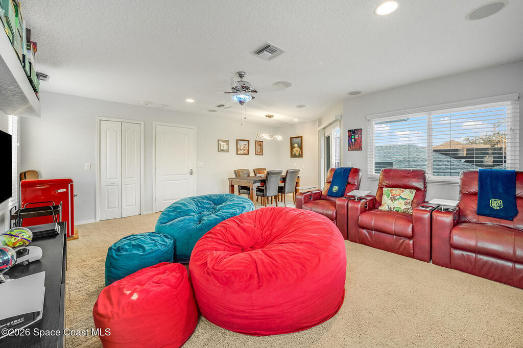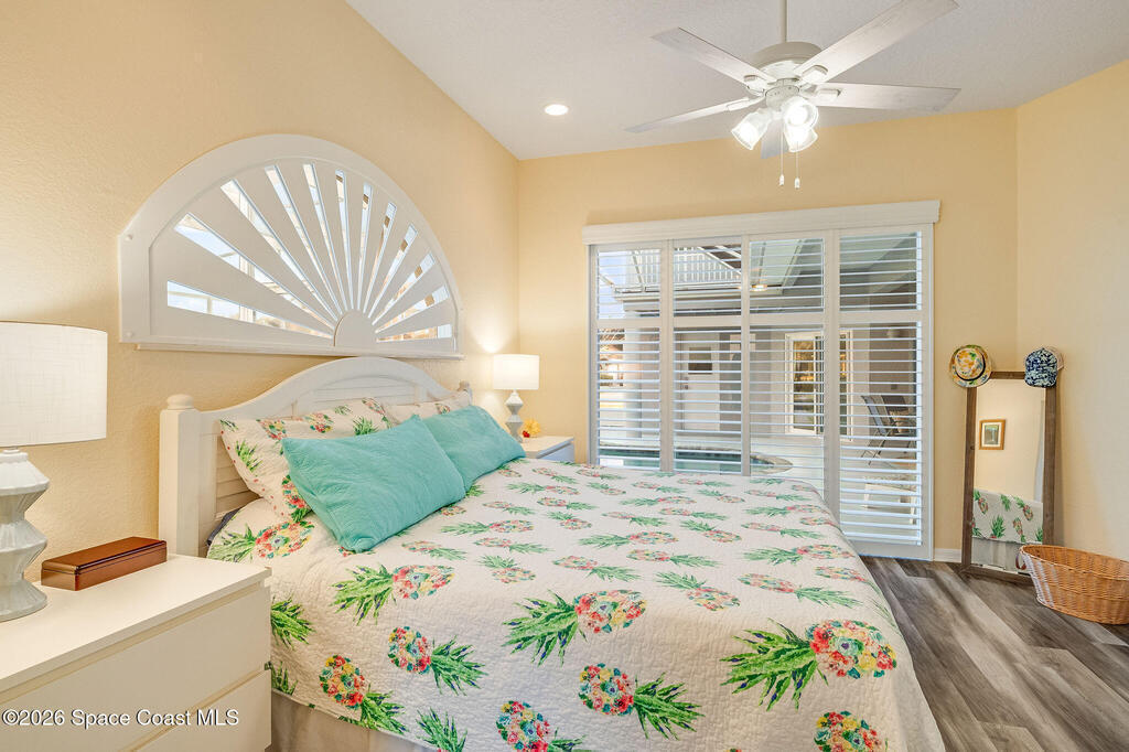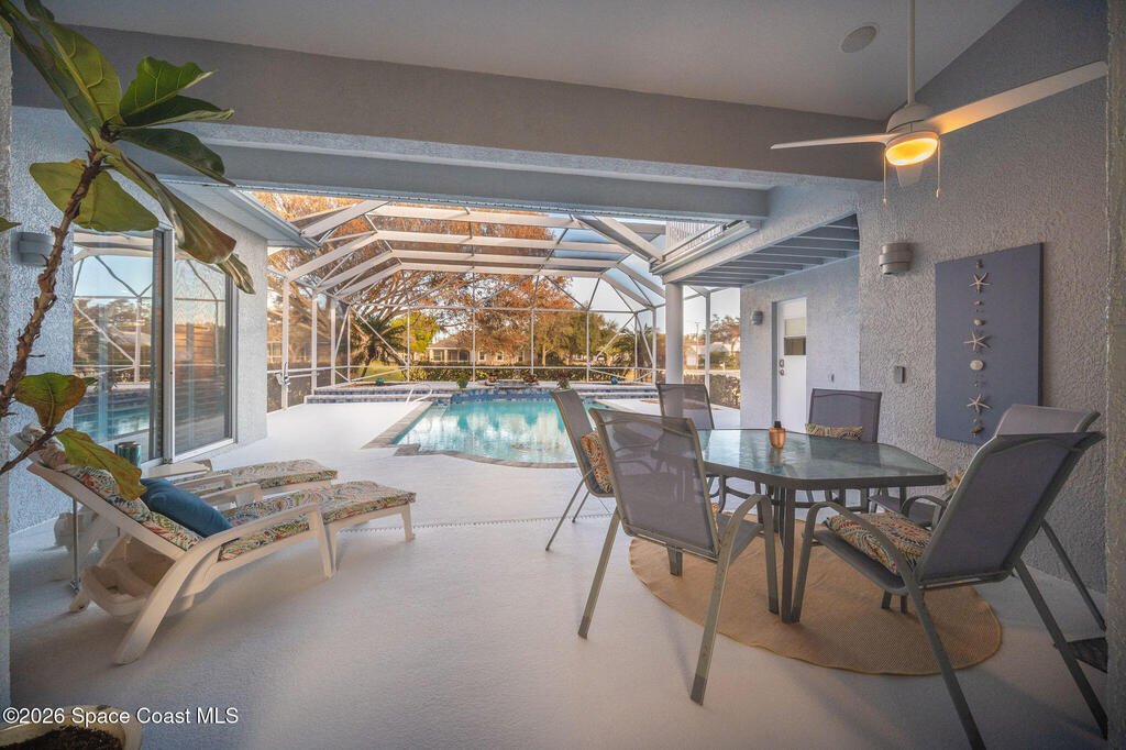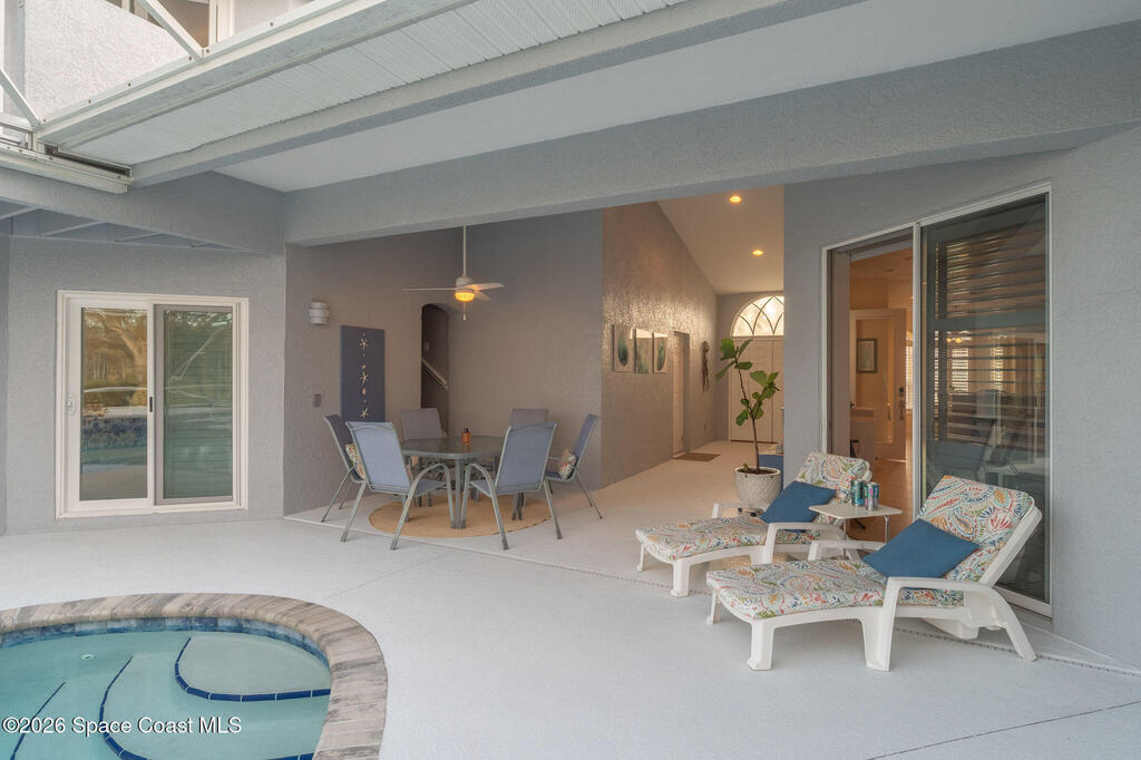 Embrace the Florida lifestyle in this light and bright 4-bedroom, plus office, 3-bath patio home featuring an open floor plan and a private courtyard-style pool that anchors the living spaces. Multiple rooms open directly to the patio, creating effortless indoor-outdoor flow. The kitchen showcases quartz countertops and generous prep space, ideal for everyday living and entertaining. The flexible layout is perfect for multi-generational living with a separate in-law suite that provides privacy for guests or extended family and a spacious bedroom or game room for hobbies or movie nights. Watch rocket launches from the balcony. Recent improvements include a resurfaced pool (2022), Roof approximately 8 years old, impact windows on the in-law suite and game room, plantation shutters, a 2020 deep irrigation well, and a new AC in 2025. Located in River Grove on the Trail with a private community dock and river access, this home offers comfort, versatility, and true Florida waterfront living.