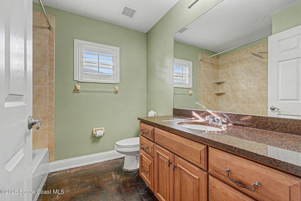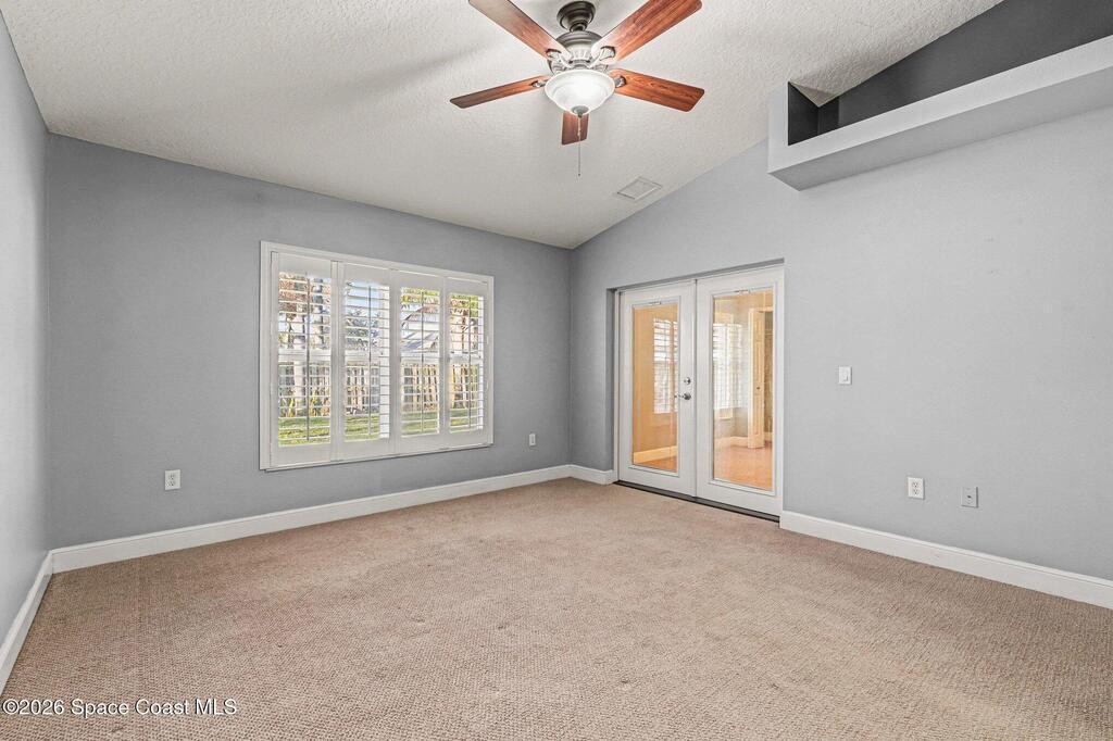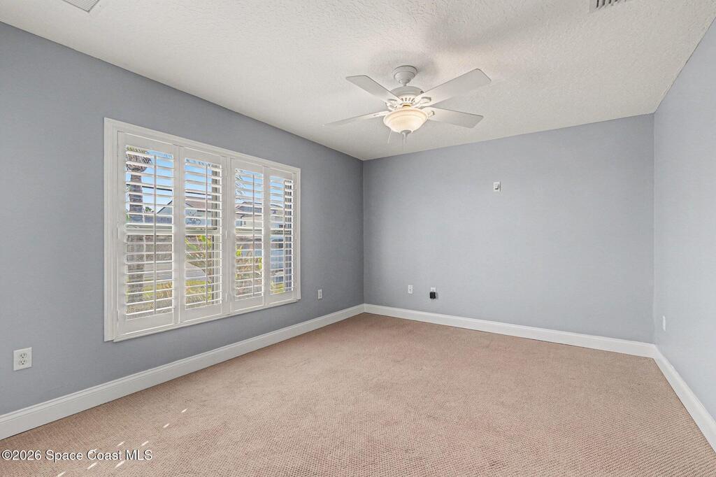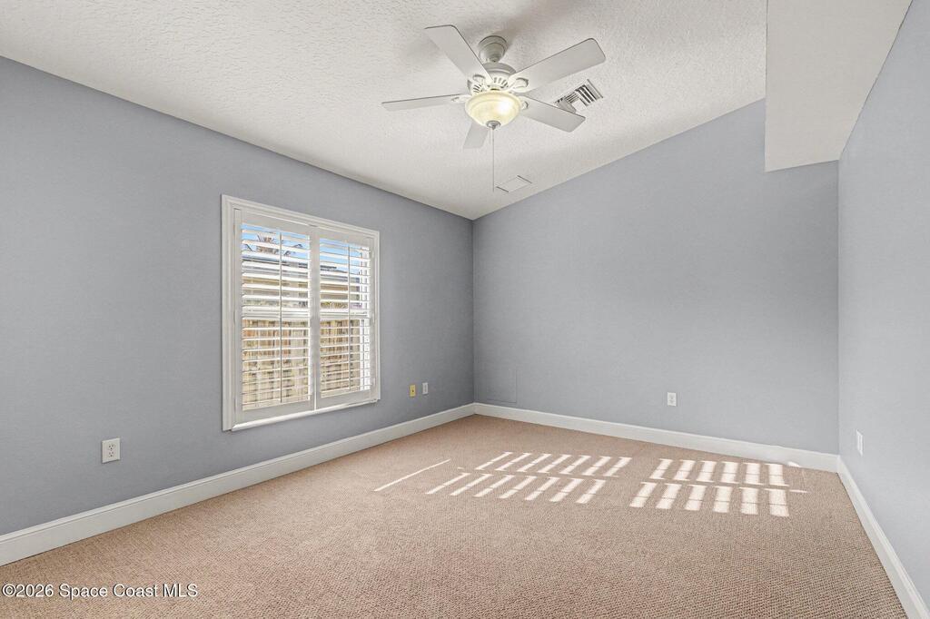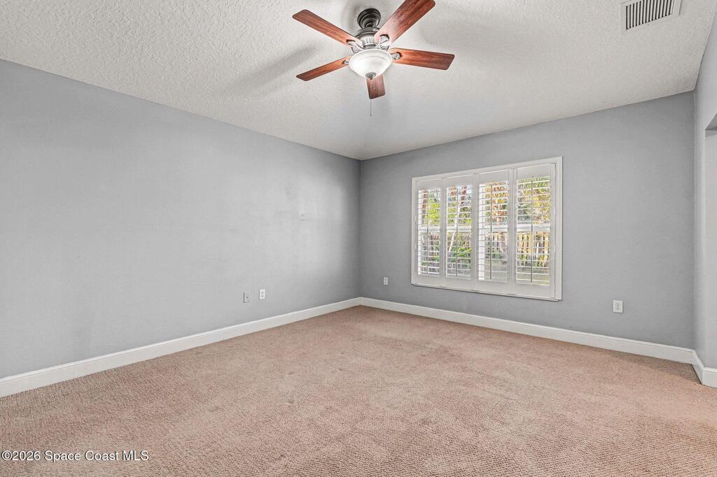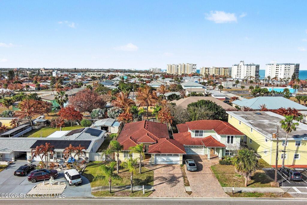 Spacious 3 bedroom, 2 bath townhome with private lot just steps from the beach, offering comfortable coastal living in a well-maintained 2006 construction. High vaulted ceilings and generous living areas create an open, airy feel, while the kitchen features granite countertops and wood cabinetry. Windows throughout include built-in wooden blinds for added style and convenience. The primary suite offers dual his-and-hers closets, an en-suite bath with a sunken tub, separate shower and vanity, plus an attached office ideal for remote work or flex space. Recent updates include 2021 HVAC, 2023 water heater. Feel secure. Built with comfort & resilience in mind, the home features a metal roof & hurricane shutters that adds peace of mind. The spacious backyard provides plenty of room for outdoor living with potential space for a future pool. No HOA. Located in desirable Satellite Beach near the ocean, shopping, dining, and local conveniences.