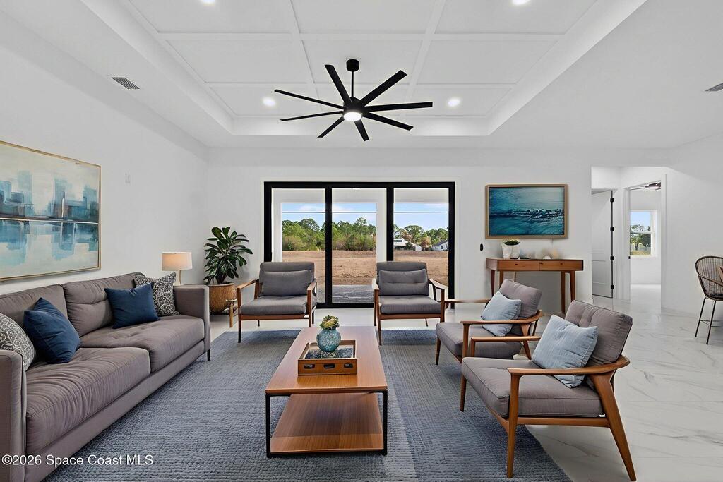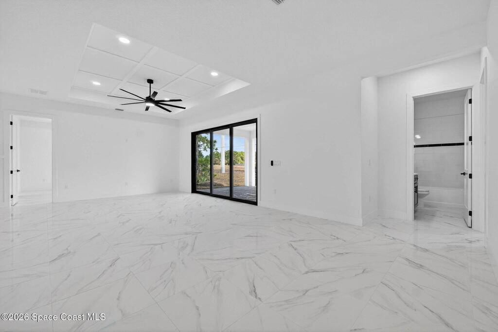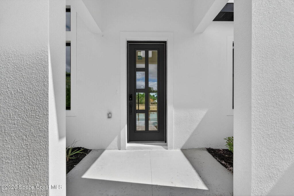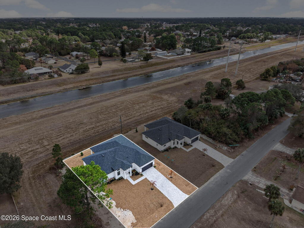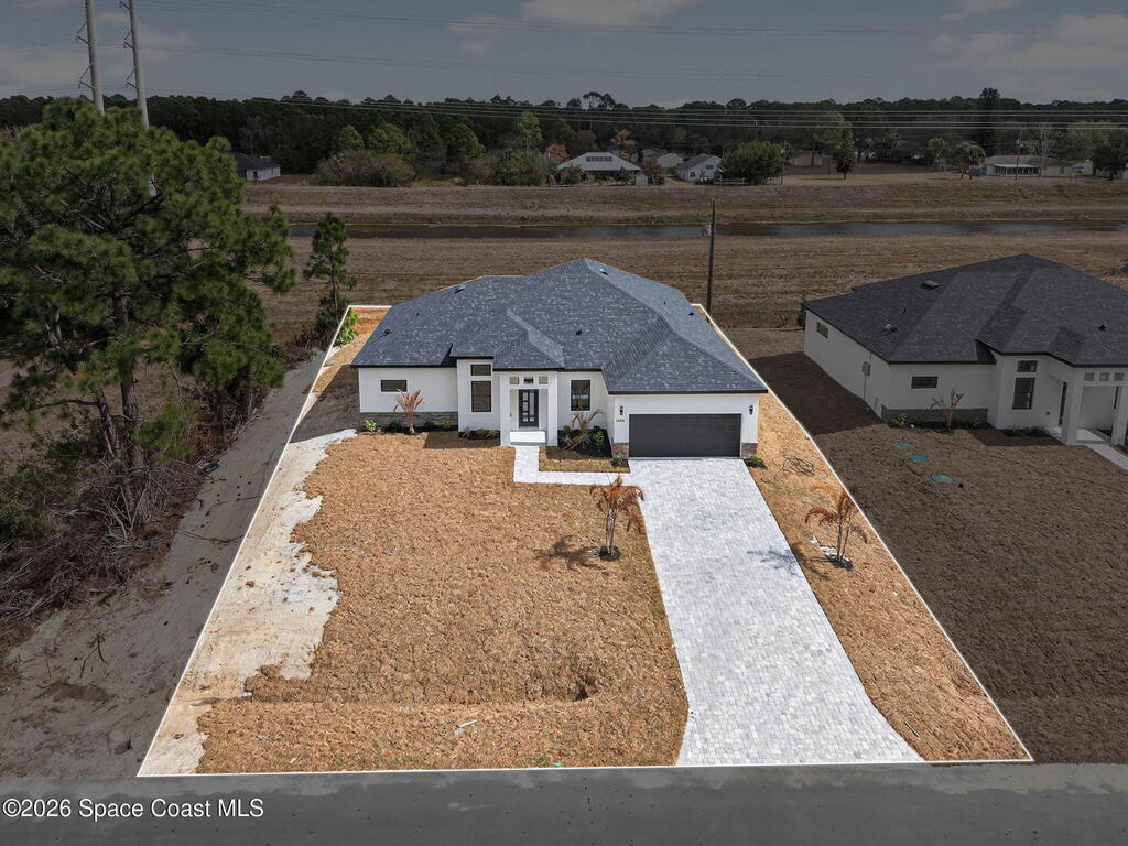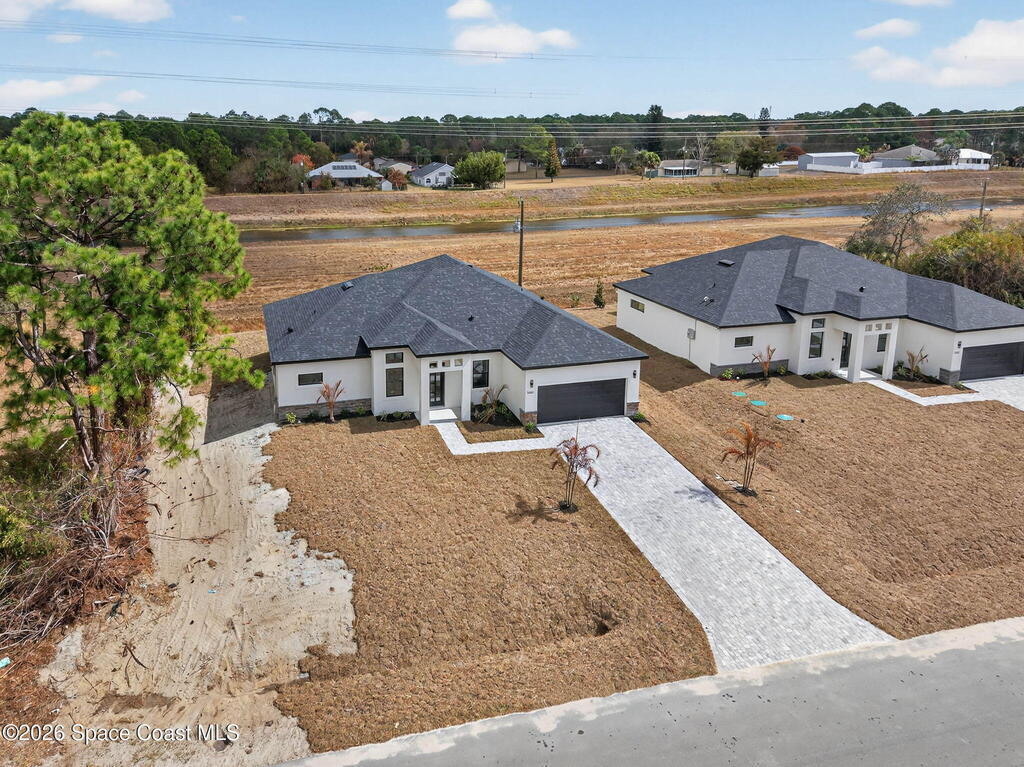 A rare canal-front new construction offering elevated modern living in Northwest Palm Bay. This 2,350 sq ft residence features true 10-foot ceilings with dramatic double tray details, creating a grand architectural presence. Designer 24'' x 24'' tile flooring flows seamlessly throughout, complementing the home's refined contemporary aesthetic.The gourmet kitchen features a wall oven and high end appliance package, ideal for entertaining and everyday living. The spa-inspired primary suite offers a freestanding soaking tub and spacious walk-in shower.Enjoy a covered patio overlooking the tranquil canal, providing privacy and a peaceful outdoor setting. Additional highlights include a luxury paver driveway, paver patio, smart lock system, Impact windows, and modern energy-efficient construction. A rare opportunity to own a thoughtfully designed canal-front residence built for comfort, prestige, and lasting value.
