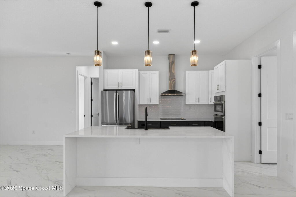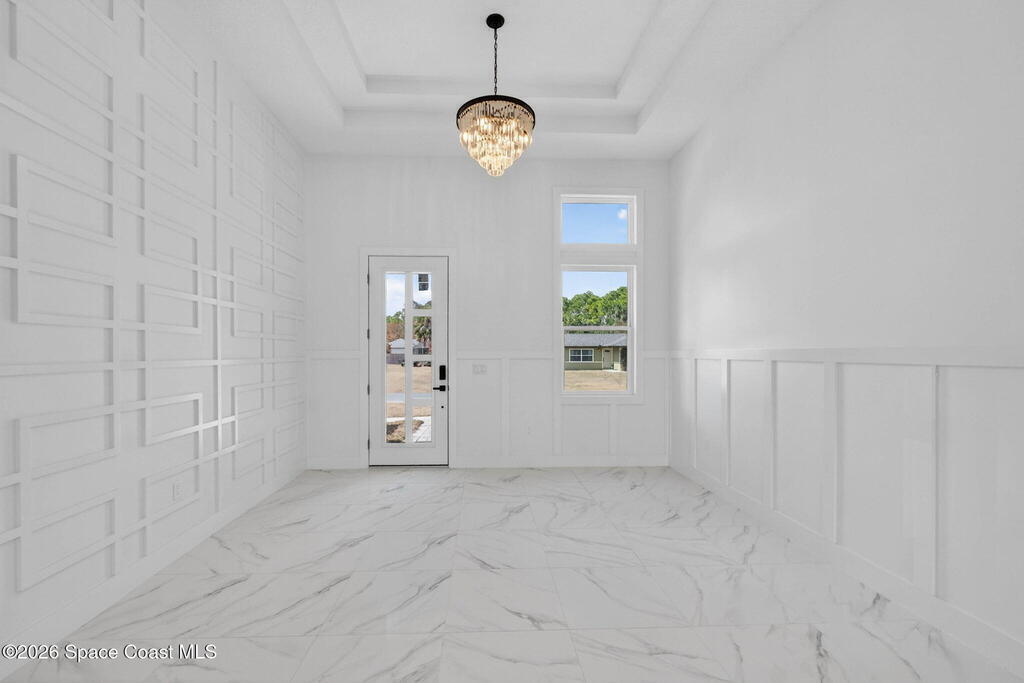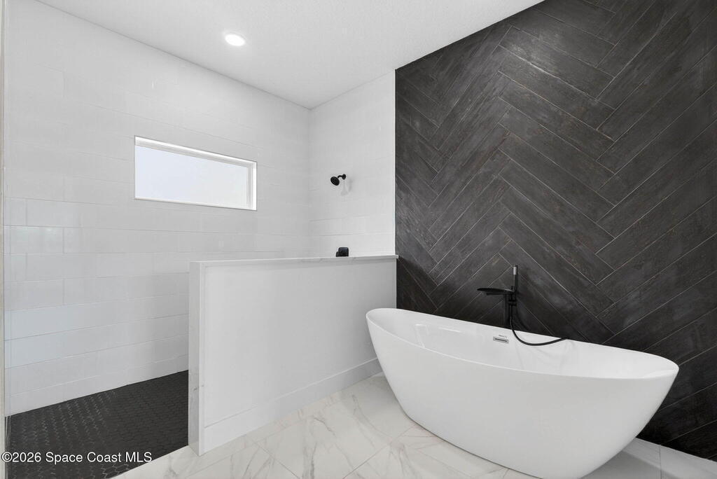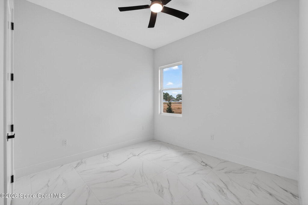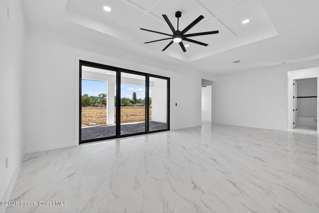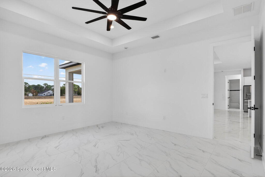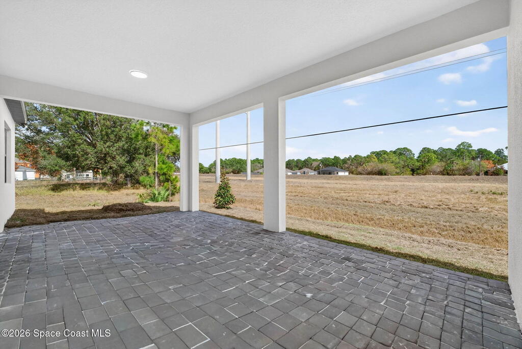A rare canal-front new construction offering elevated modern living in Northwest Palm Bay. This 2,350 sq ft residence features true 10-foot ceilings with dramatic double tray details, creating a grand architectural presence. Designer 24'' x 24'' tile flooring flows seamlessly throughout, complementing the home's refined contemporary aesthetic.The gourmet kitchen features a wall oven and high end appliance package, ideal for entertaining and everyday living. The spa-inspired primary suite offers a freestanding soaking tub and spacious walk-in shower.Enjoy a covered patio overlooking the tranquil canal, providing privacy and a peaceful outdoor setting. Additional highlights include a luxury paver driveway, paver patio, smart lock system, Impact windows, and modern energy-efficient construction. A rare opportunity to own a thoughtfully designed canal-front residence built for comfort, prestige, and lasting value.