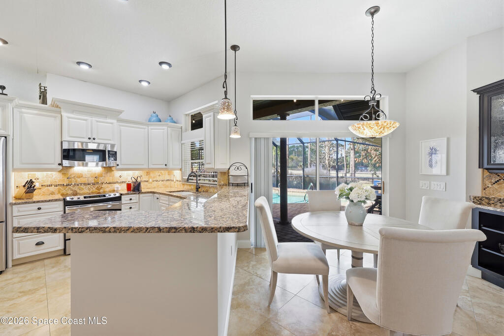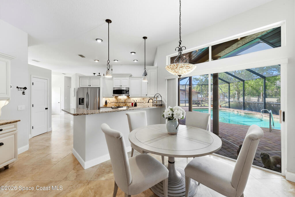This beautifully maintained 3-bedroom, 2-bath home delivers the ideal Florida lifestyle with timeless curb appeal, an inviting arched entry, and a three-car garage. Inside, you'll find a bright, open layout with neutral finishes, upgraded lighting, and spacious living areas designed for both everyday comfort and entertaining.The kitchen features white cabinetry, granite countertops, stainless appliances, and a designer tile backsplash, plus a large window overlooking the backyard retreat. The main living space is anchored by a striking fireplace and enhanced by a built-in bar/serving station. Step outside to your private oasis-- a screen-enclosed pool with paver deck and covered lanai with a warm wood ceiling, ceiling fans, and cafe lighting for year-round enjoyment. The primary suite impresses with a spa-inspired bath including a freestanding soaking tub, frameless glass shower, and an incredible custom walk-in closet A rare combination of space, style, and outdoor living.