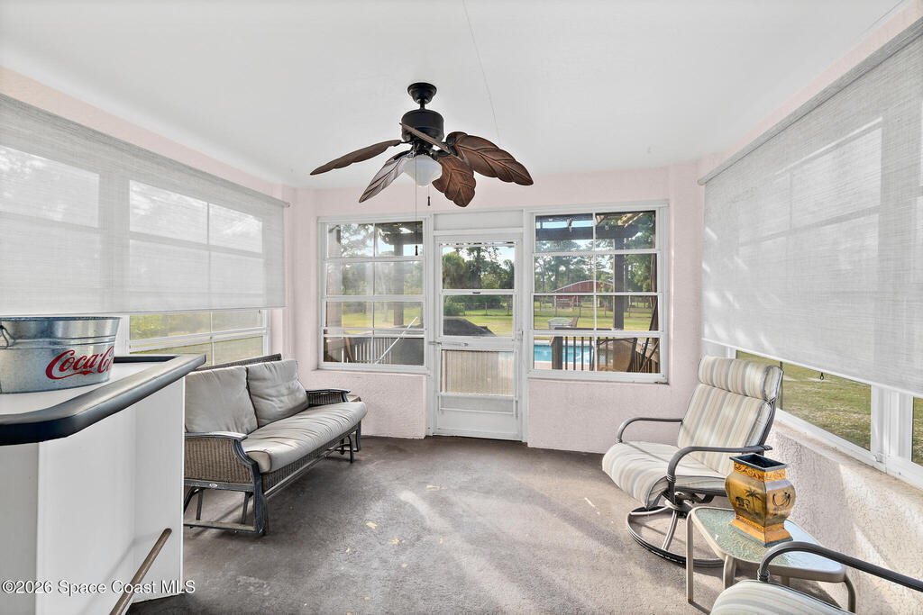 FULLY FURNISHED 4 BEDROOM 2 BATH POOL HOME ON 1 ACRE with a BONUS 12 x 24 SMALL BUNKER/ HOBBY/ MULTI USE BUILDING WITH ELECTRIC AND AIR! Home Features a Open Floor Plan with Vaulted Ceilings, Custom Plantation Shutters, Formal Dining Room,18 Inch Tile, Wood Floors, Custom Updated Master Bath and Guest Bath, Large Eat In Kitchen with Wood Cabinets and a Breakfast Bar, Nice Size Bedrooms and Large Closets, Trussed Patio with Windows, Inside Laundry Room, Custom Wood Ramp leading to the Back Yard, Plenty of Storage, Beautiful Custom Pool, Roof 2017. Great Home For Entertaining! Close to Major Highways. Beaches 20 Min Away & Orlando International Airport 30 Min Away. Move in Ready and Can Close Quickly.