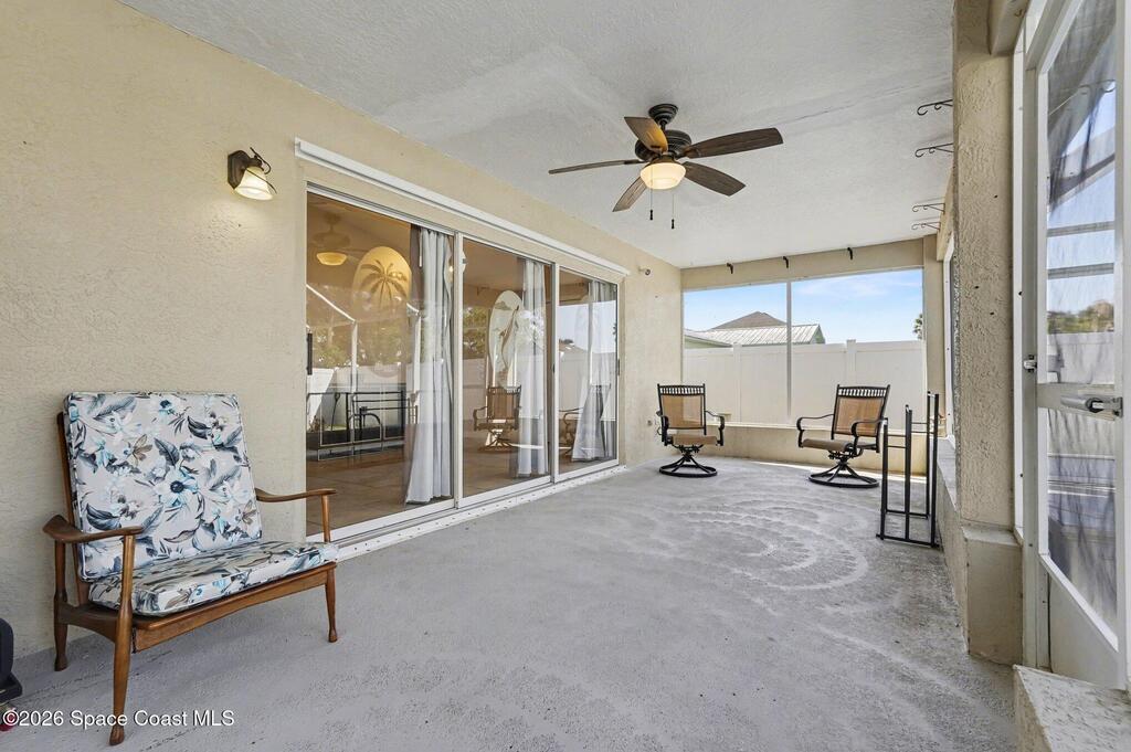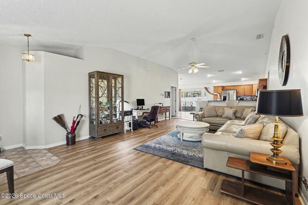 Move-in ready 3BR/2BA solar pool home in Palm Bay with extensive upgrades and energy-efficient features. Open-concept floor plan with vaulted ceilings and abundant natural light. Spacious living and dining areas ideal for entertaining. Split-bedroom layout offers private primary suite with en-suite bath; two additional bedrooms share full hall bath.Major updates include new whole-home solar system (paid off), newer metal roof (2013), newer AC (2023), newer pool heater, newer pool pump, whole-home water filtration system, and granite countertops.Enclosed four-seasons room provides additional flexible living space overlooking the screened pool oasis. Conveniently located near river and beach access, shopping, dining, and Patrick Space Force Base.Energy efficient, well maintained, and move-in ready.