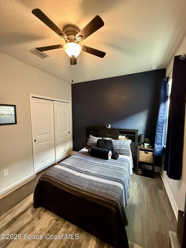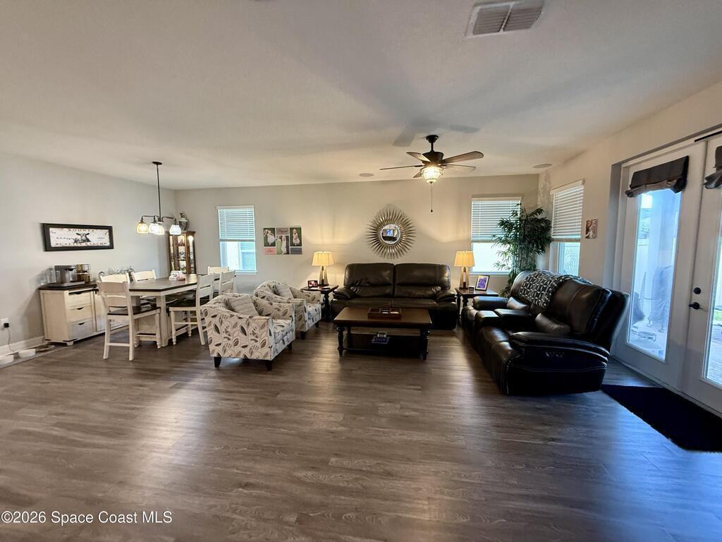Beautifully maintained 4-bedroom, 2-bath home with a 2-car garage located in desirable West Melbourne. This light and bright residence offers a spacious open floor plan, with high ceilings, and vinyl flooring throughout, designed for comfortable everyday living and easy entertaining. The kitchen overlooks the main living and dining areas, creating a seamless flow ideal for gatherings. The split-bedroom layout provides privacy for the primary suite, complete with a generous walk-in closet and ensuite bath. Enjoy indoor-outdoor living with a covered patio and private backyard space. This home is also equipped with solar panels to help with those monthly power bills. Conveniently located near top-rated schools, shopping, dining, and just minutes to I-95 and the beaches of Florida's Space Coast. A wonderful opportunity to enjoy the best of Brevard County living!