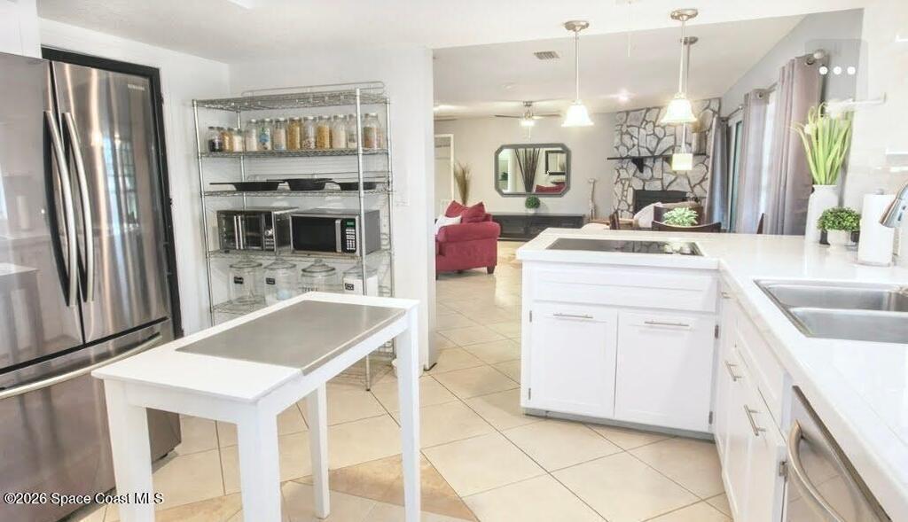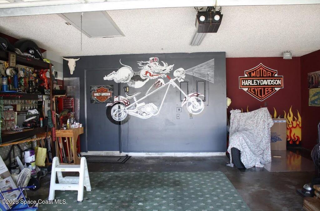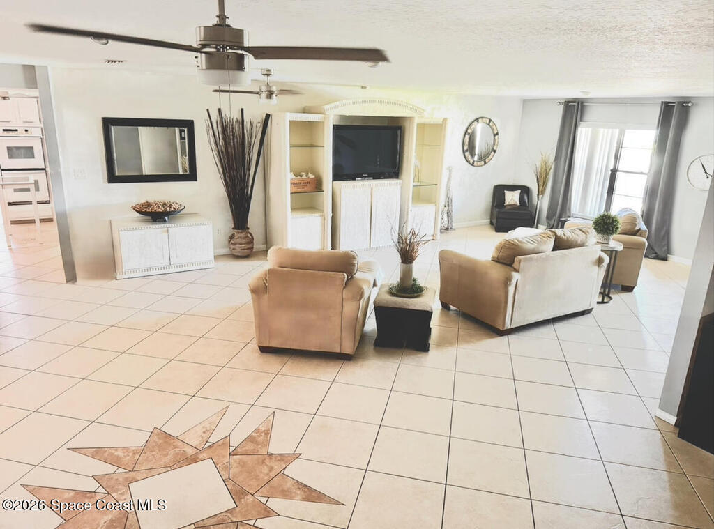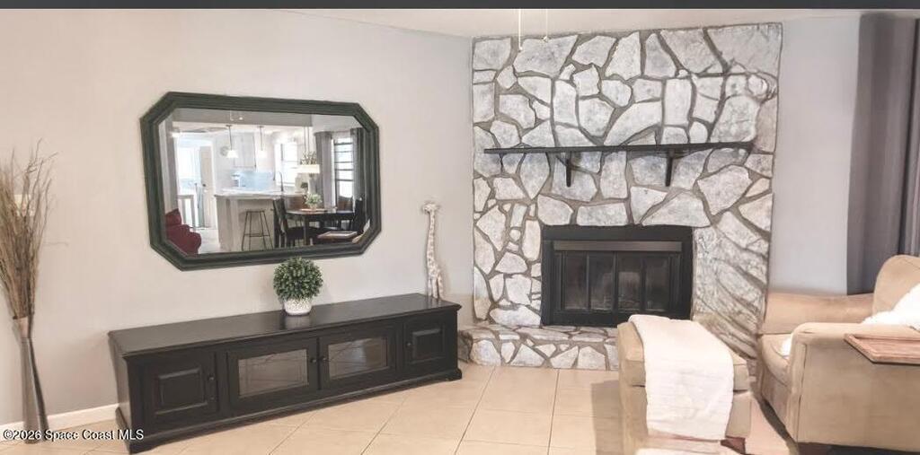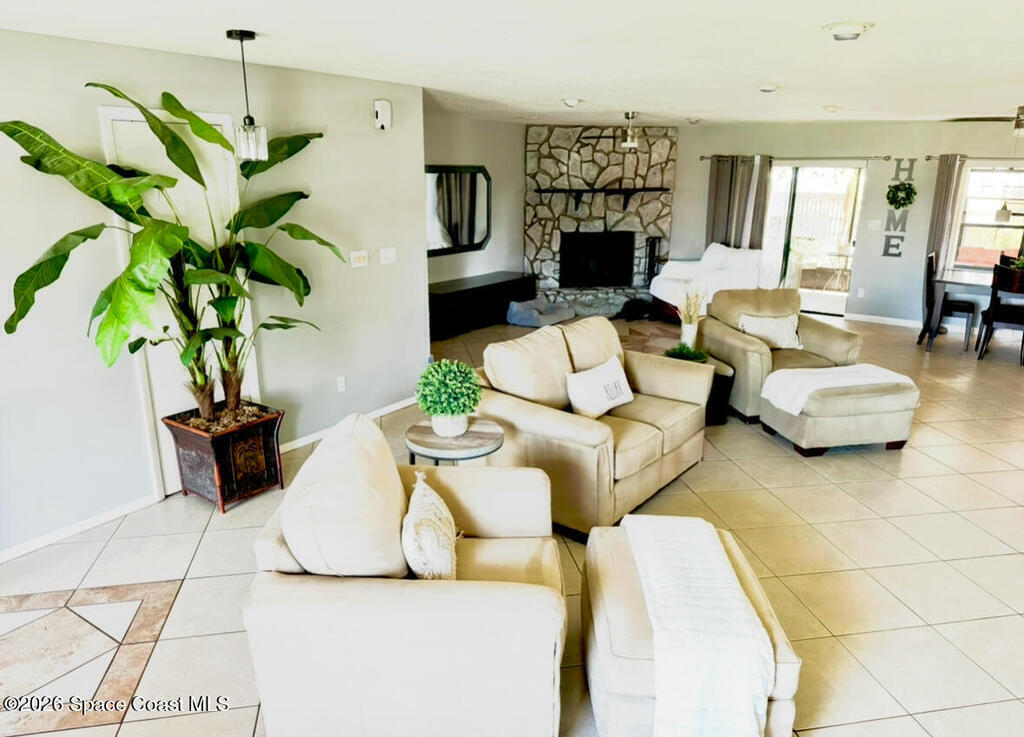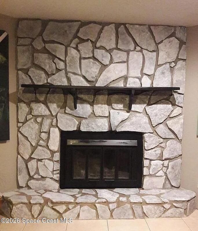 New roof coming 2026! Custom-built, CBS 3/2 beautifully designed 1,988 sq ft home, on quiet street, can walk to Indian River, dock & park. Open floor plan, many upgraded & refined finishes. Wired security system, tile flooring w/designs. Kitchen features white cabinetry, new countertops, backsplash, stainless appliances, pantry, breakfast bar & laundry rm off kitchen. Generous great rm, w/stone fireplace, flowing into an enclosed custom tiled patio-perfect for morning coffee & gatherings. Expansive backyard -an oasis for relaxing & entertaining family & friends. Privacy fence, mature palms, fruit trees (Mango, Orange, & Avocado) & shady oak trees. Private well & your own private streetlight in backyard. Irrigation sprinkler system. Oversized 2-car garage offers extra space for motorcycles, workshop, storage. Pull-down attic access.Perfectly landscaped & highly sought-after home across from Kennedy Space Center.