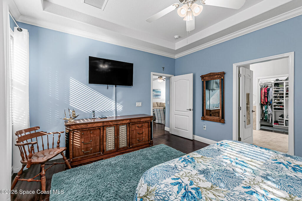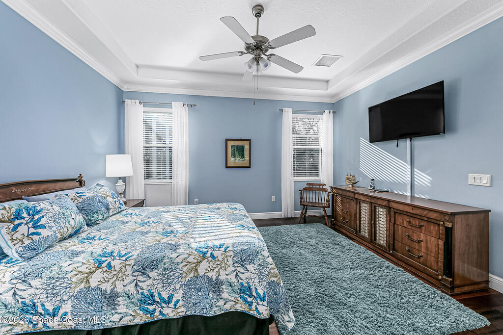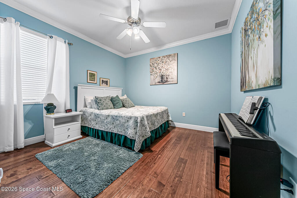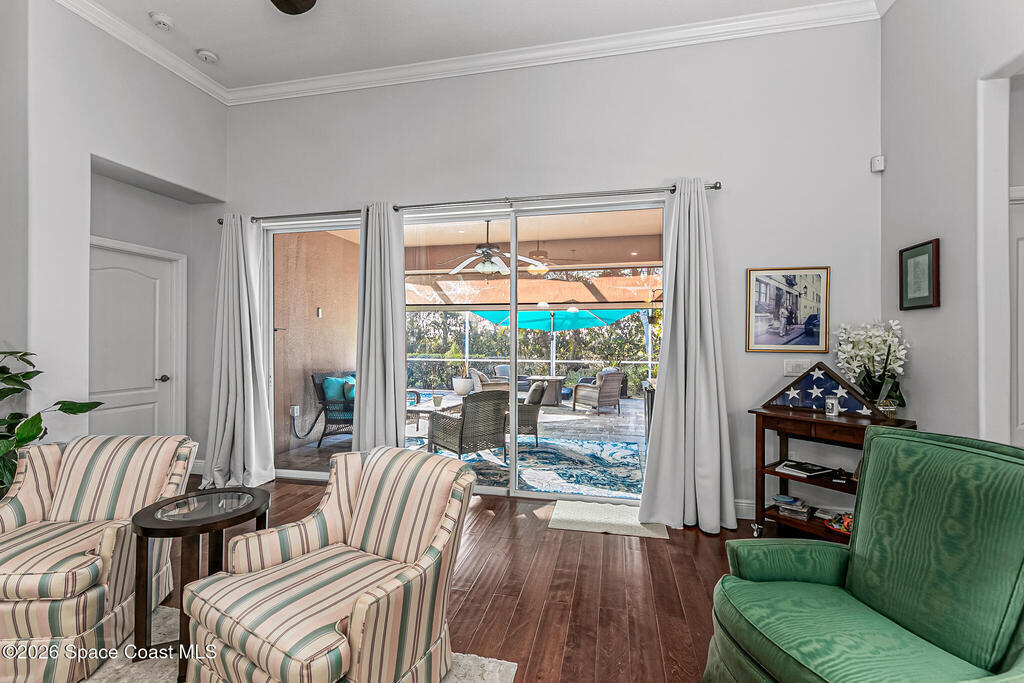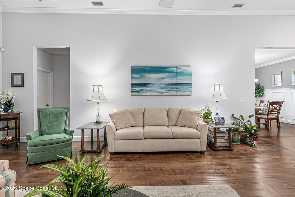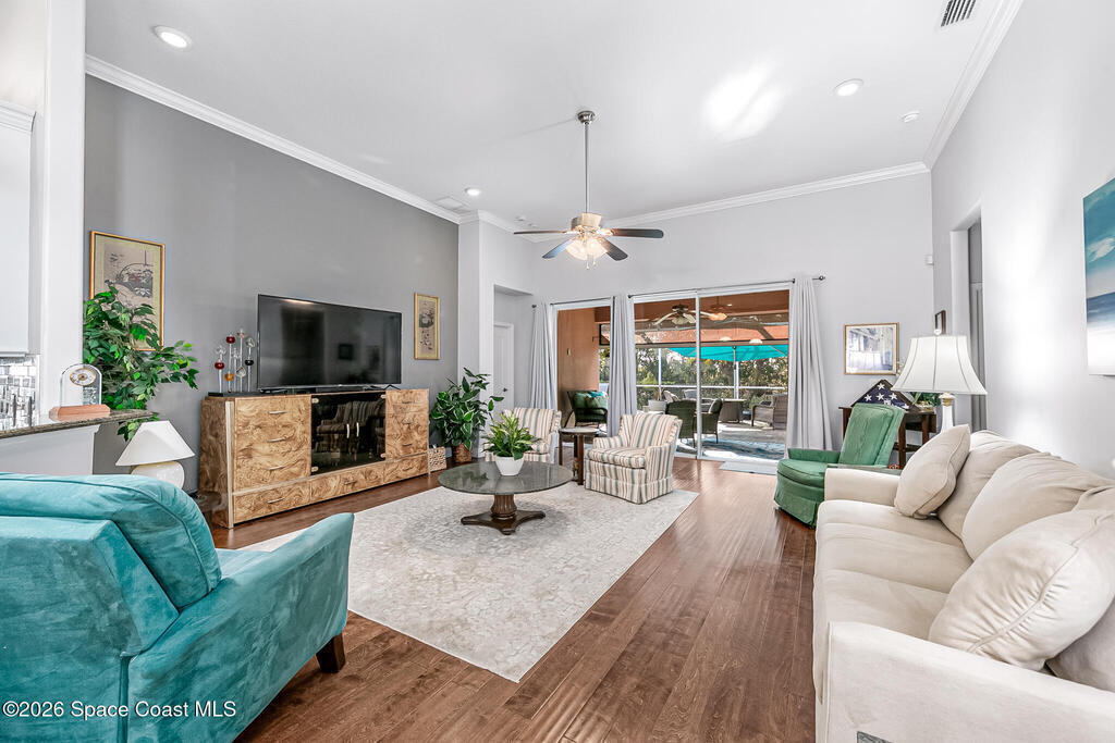 Welcome to the HEART OF VIERA'S MOST PRESTIGIOUS 55+ COMMUNITY OF HERITAGE ISLE. This Beautiful 4 bedroom 3 bath home comes with many upgrades Including an Open Floor Plan with Hardwood Floors Throughout, Upgraded Kitchen Cabinets, Whirlpool Stainless Appliances, Stainless Wine Cooler, Island with Stainless Steel Top, Crown Molding Throughout, Beautiful Primary Suite, Primary Bath has Double Sinks, Walk In Closets, Garden Jetted Tub, Walk In Shower, 3 Car Garage with Pavered Driveway, Brand New Accordion Shutters & Electric Hurricane Impact Shade on Porch. Roof (2024), AC (2020). Amenities Include: Golf, Tennis, Pool/ Spa, Basketball, Club House, Fitness Center, Shuffle Board. THEY HAVE IT ALL! Close to The Brevard Zoo, Tons of Shopping & Entertainment, short drive to I-95, less than 10 min to Beaches, 20 min to Port Canaveral Cruise Lines, 30 min to Kennedy Space Center, 45 min drive to Orlando and Theme Parks. This home is truly a must-see. DONT MISS OUT!
