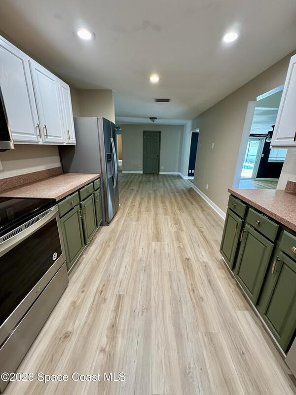 Welcome to this beautifully refreshed home in the heart of northeast Palm Bay. Single family home near Turkey Creek with no HOA, this spacious property offers the perfect blend of comfort and versatility. Step outside to your own private oasis featuring a screened-in pool, an oversized patio ideal for entertaining, and a fully fenced backyard with plenty of room to relax, play, or host gatherings. Inside, you'll love the brand-new flooring and fresh touch-up paint throughout -- with no carpet anywhere, making maintenance a breeze. Pet friendly with all breeds allowed, this home truly welcomes everyone. A standout feature is the flexible bonus room complete with a cozy fireplace and private door, perfect as a fifth bedroom, home office, or second living space. This move-in ready home offers space, style, and the Florida lifestyle you've been looking for!