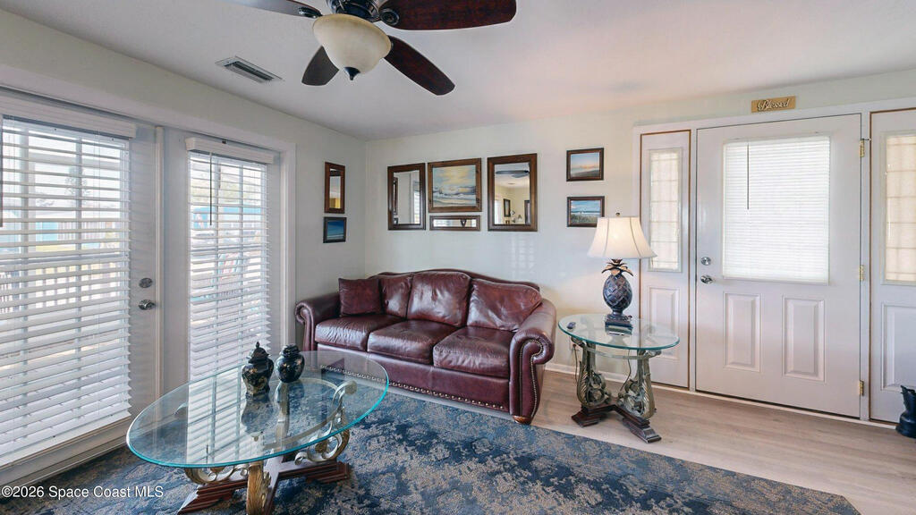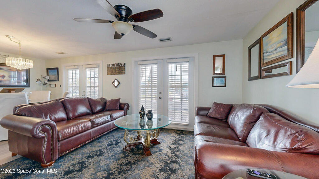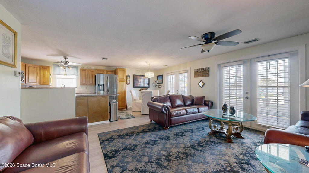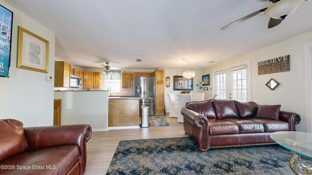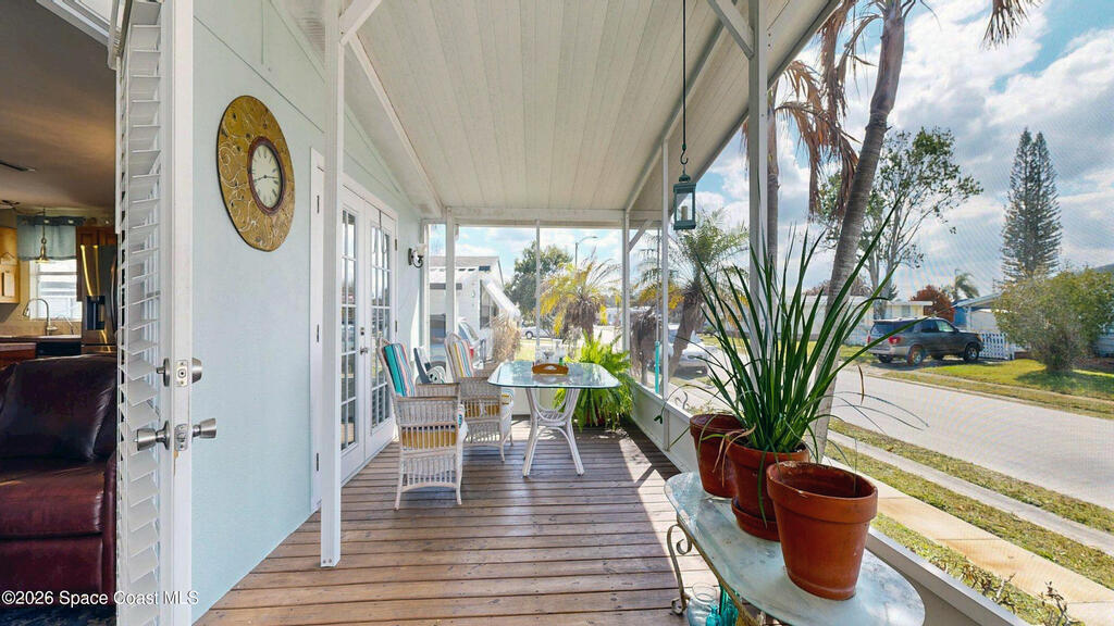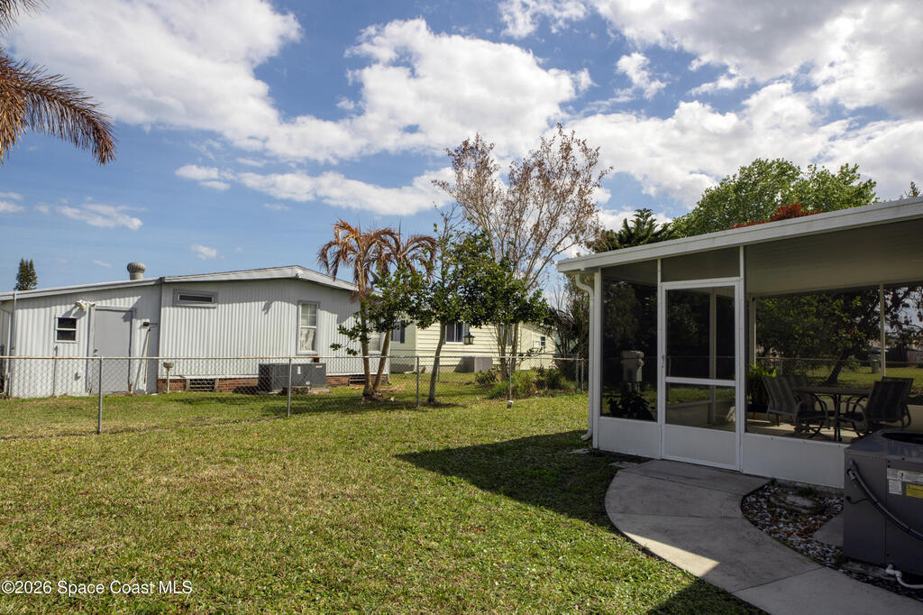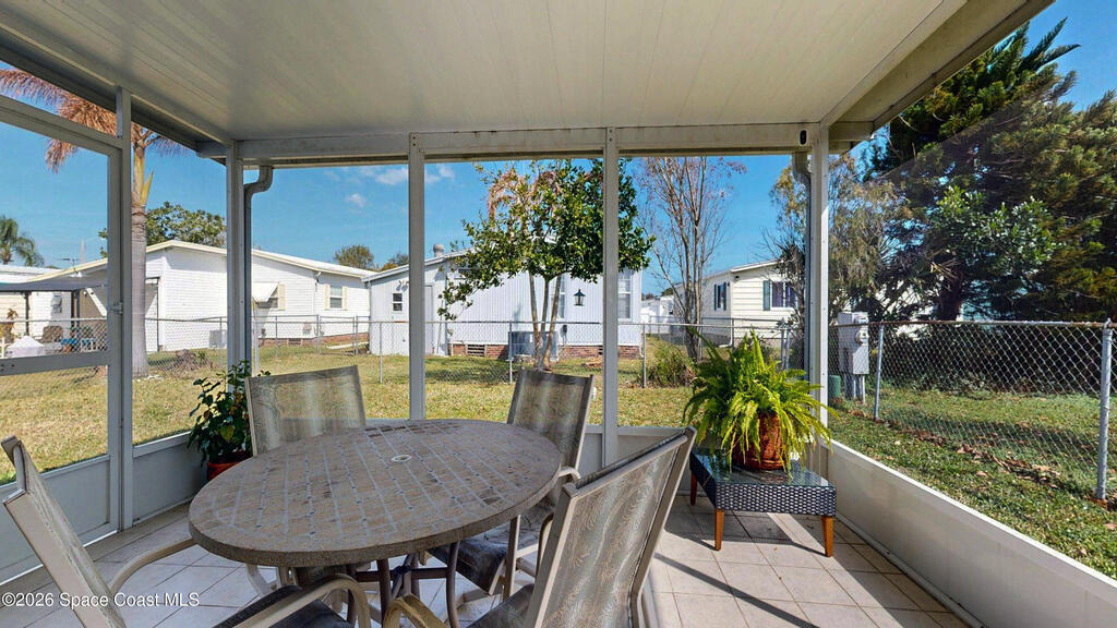 Easy Florida Living!! PALM BAY COLONY 55+ Community! HOA is VOLUNTARY and paid until Jan 2027 by Seller -- enjoy the pool and amenities! Updated 2BE, 2BA double wide home. Updated kitchen with stainless steel appliances, range with double oven and maple cabinets. Updated master and guest bath. Two French doors off screened front porch and leaded glass side door off carport. Screened back porch off master bedroom. Fenced backyard. Indoor laundry. Carport with oversized enclosed storage. New breakers in main panel. A/C 2021 with 10-year parts warranty. Water heater 2025. Updated plumbing. Workshop. Clubhouse, pickleball, pool, shuffleboard and tennis courts. Protected security by ARLO. Located in Palm Bay in beautiful Brevard County -- minutes to the beaches of Cocoa Beach and the Space Coast. Enjoy nearby waterfront dining and watch rocket launches from Kennedy Space Center light up the sky! 🌴🚀🌊 Best part? This lot is owned!!! So no monthly rent!