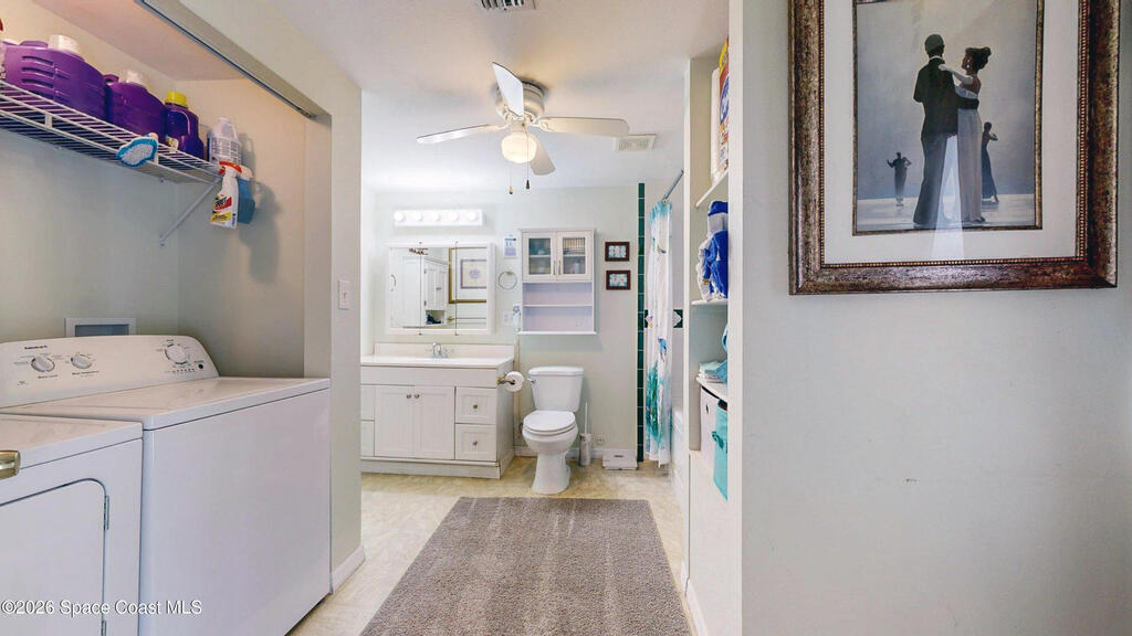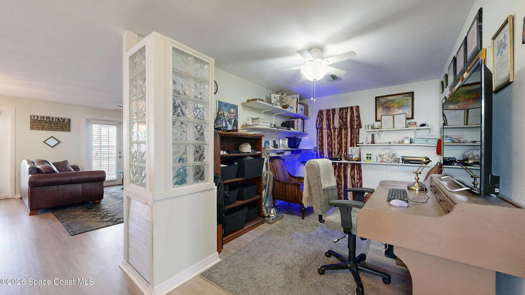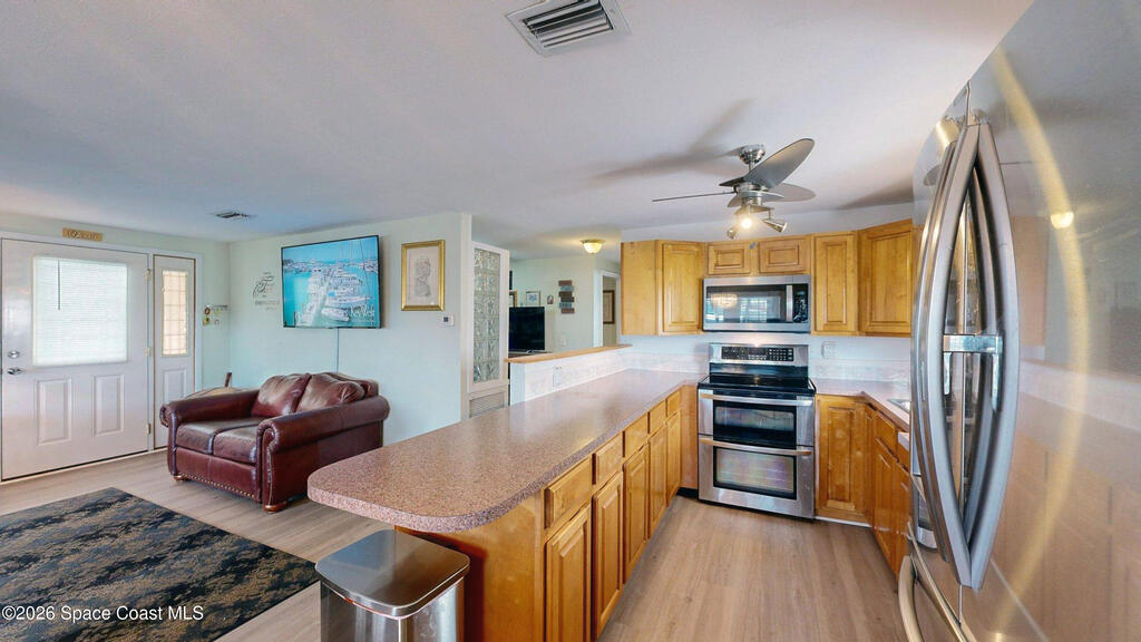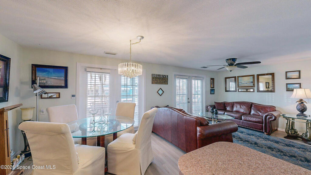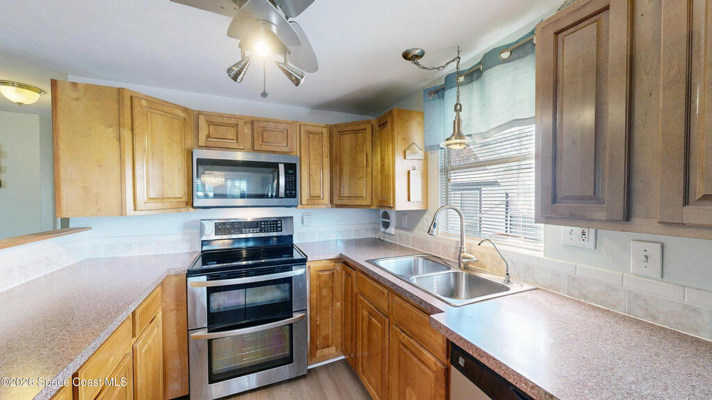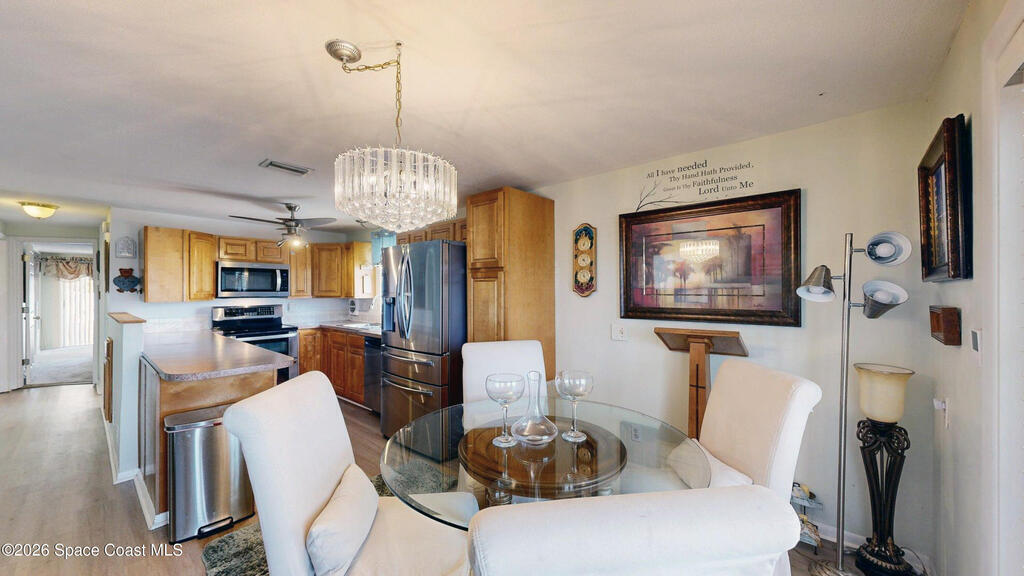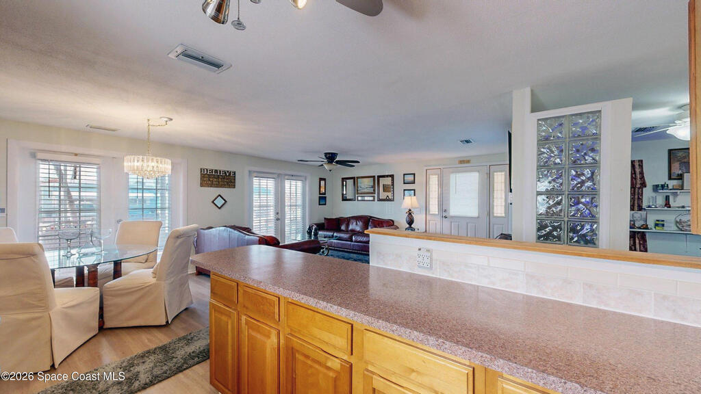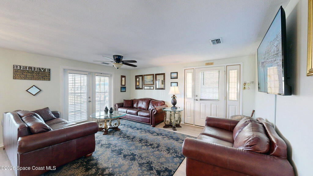 Easy Florida Living!! PALM BAY COLONY 55+ Community! HOA is VOLUNTARY and paid until Jan 2027 by Seller -- enjoy the pool and amenities! Updated 2BE, 2BA double wide home. Updated kitchen with stainless steel appliances, range with double oven and maple cabinets. Updated master and guest bath. Two French doors off screened front porch and leaded glass side door off carport. Screened back porch off master bedroom. Fenced backyard. Indoor laundry. Carport with oversized enclosed storage. New breakers in main panel. A/C 2021 with 10-year parts warranty. Water heater 2025. Updated plumbing. Workshop. Clubhouse, pickleball, pool, shuffleboard and tennis courts. Protected security by ARLO. Located in Palm Bay in beautiful Brevard County -- minutes to the beaches of Cocoa Beach and the Space Coast. Enjoy nearby waterfront dining and watch rocket launches from Kennedy Space Center light up the sky! 🌴🚀🌊 Best part? This lot is owned!!! So no monthly rent!