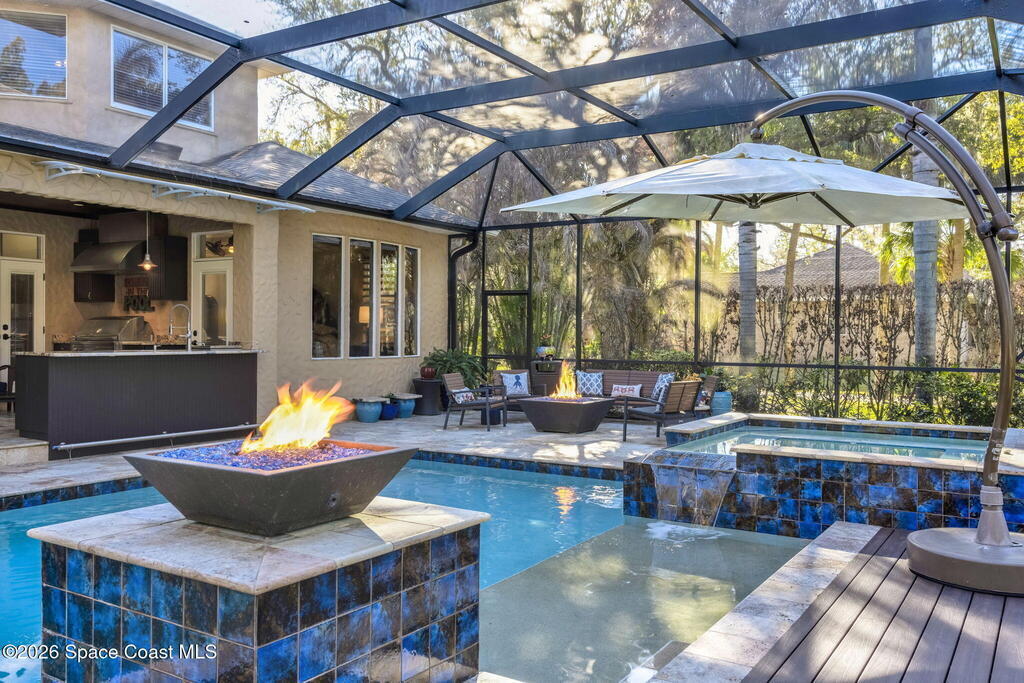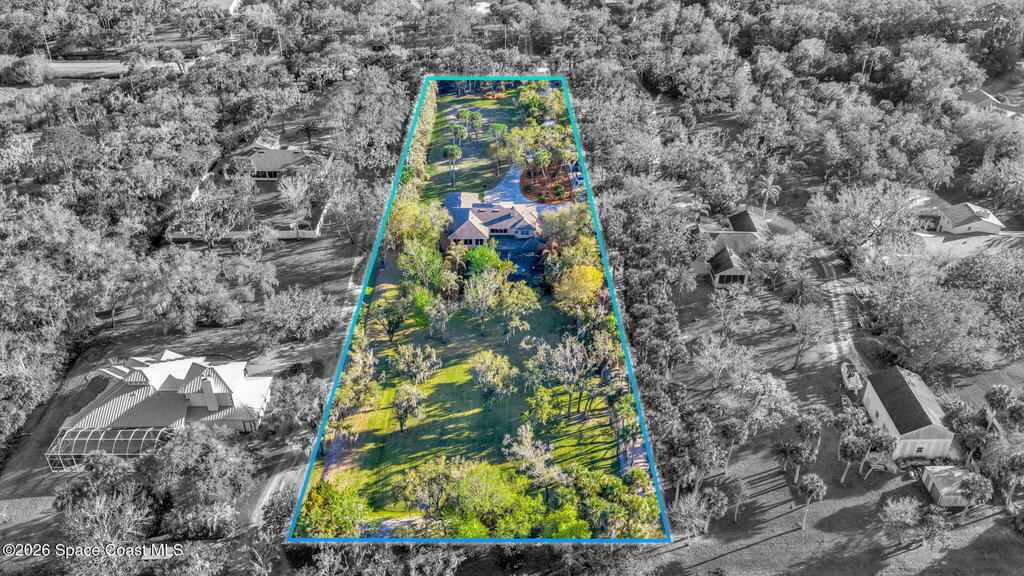 Welcome to this exceptional luxury estate in highly desirable North Merritt Island, offering over two private acres of beautifully maintained, private grounds. This impressive two-story residence features 5 spacious bedrooms, 4 full bathrooms, plus a dedicated office, soaring vaulted ceilings, expansive windows that flood the home with natural light, and custom built-ins that add both character and function. A beautiful fireplace anchors the main living area.The expansive primary retreat is a true sanctuary, offering generous proportions, a spa-inspired bath with a soaking tub, walk-in shower, dual vanities, and an oversized walk-in closet. Step outside to your own resort-style oasis featuring a modern pool and spa, dramatic fire bowl accents, and a fully equipped summer kitchen perfect for hosting unforgettable evenings. The three-car garage with EV charging, hurricane shutters. Lush landscaping, and unmatched privacy complete this rare opportunity to own an estate in Merritt Island.