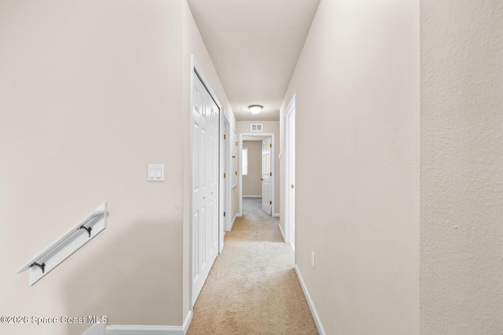 Move-in ready 3-bedroom, 2.5-bathroom townhouse in the highly desirable Meadow Pointe community. Roof 2023 and AC 2018. This townhome offers just under 1,500 square feet of living space. The kitchen features a large island, solid wood cabinets, and ample storage, seamlessly flowing into the dining and living areas. Laminate flooring runs throughout the lower level, while the upstairs features carpet with tile in the bathrooms and laundry room.The spacious primary suite includes two large walk-in closets and an en-suite bathroom with a double sink. The laundry room is conveniently located upstairs, and the washer and dryer are included! Additional features include an attached one-car garage and storm shutters for added protection.The community offers a sparkling pool, and the HOA covers cable, internet, lawn care, exterior building maintenance, roof replacement, common area insurance, and pest control. Located just minutes from shopping, restaurants and other local amenities.