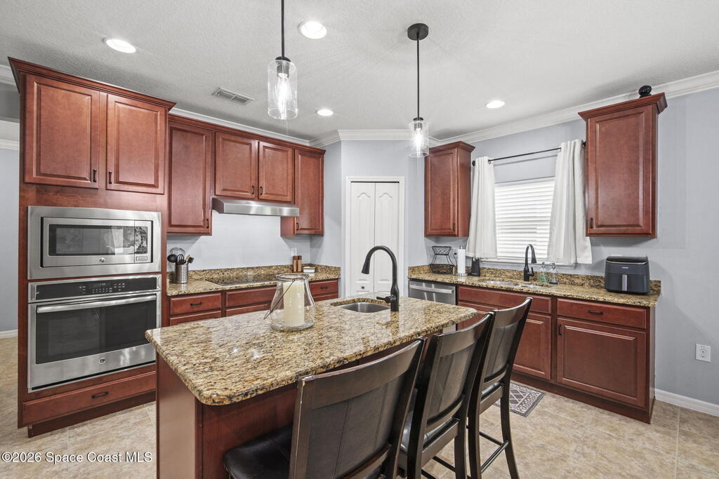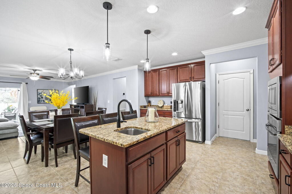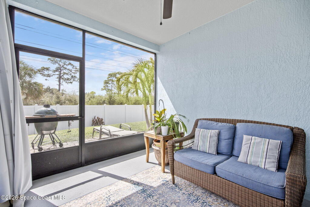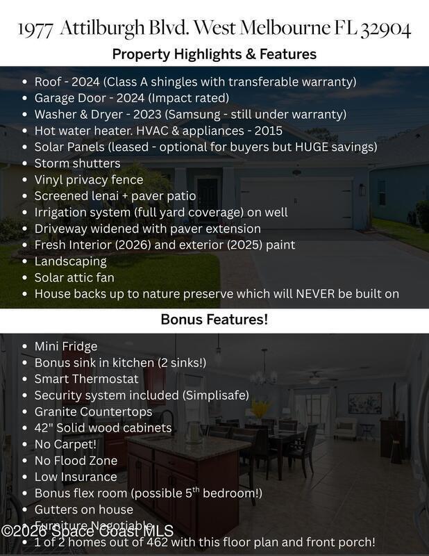 Built in 2015 and beautifully maintained by the original owners, this family-friendly West Melbourne home offers the space and flexibility today's buyers dream of. With 4 full bedrooms plus a bonus room (perfect for a playroom, office, gym, or 5th bedroom) the layout fits every stage of life. One of only 2 in the community with this unique floor plan, elevation, and inviting front porch, it truly stands out. Recent updates include a 2024 roof (Class-A shingles under warranty), 2024 impact-rated garage door, 2025 interior/exterior paint, and 2023 Samsung washer and dryer. Concrete block construction, hurricane panels, no flood zone for lower insurance, full yard irrigation on a well, vinyl privacy fence, and leased solar panels (with buyer option to keep or remove) keep electric bills near-zero. Incredible location in a safe community, close to trails, shopping, dining, and the best that Melbourne offers. Schedule a showing before its gone! Message Sam Boyd with any questions.