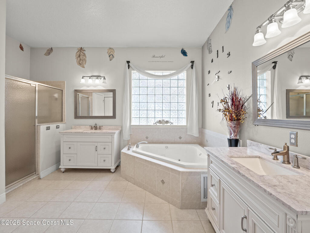 Rare find! Custom built, this home sits on .64 acres and offers 4 bdrms + office & 3 baths with a spacious, flexible layout. Inside find 10 ft ceilings, 18-inch tile floors, and expansive living areas, including a formal dining room, separate living room, and large family room. The custom gourmet kitchen opens to a bright breakfast nook with budded windows overlooking the oversized porch, perfect for gatherings and everyday relaxation. The split floor plan provides privacy, and the convenient pool bath access leads to the fenced backyard, offering space to design your dream outdoor retreat. The oversized primary suite features his & hers closets, jetted tub, glass-enclosed shower, dual sinks & separate vanities. Additional highlights include a 3-car garage and generously sized rooms throughout. Ideally located near St. Johns Heritage Pkwy with quick access to Northrop Grumman, L3Harris, I-95, and just minutes from the new Publix, banks, specialty shops & Heritage High School.