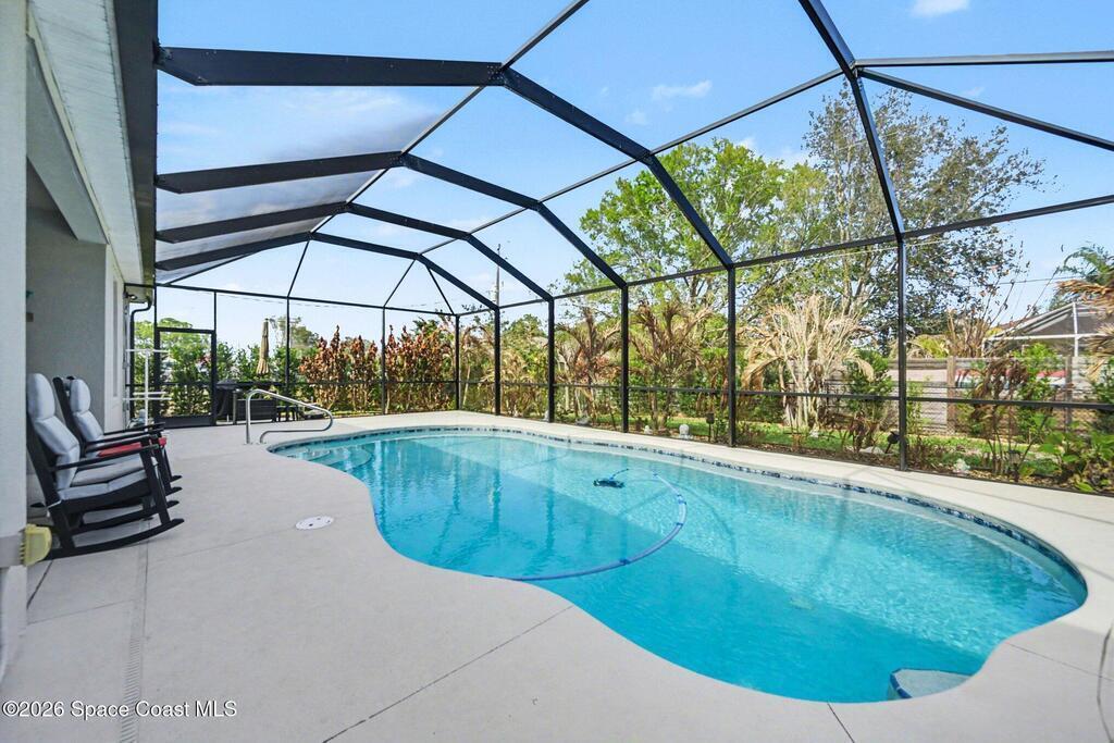 Beautiful Saltwater Pool Home on a Quiet Street! This lovely 3-bedroom, 2-bath home features an open floor plan perfect for comfortable living and entertaining. Throughout the home you'll find wood laminate flooring with no carpet, creating a seamless and low-maintenance living space. The spacious kitchen boasts granite counters, 42inch cabinets, pantry and breakfast bar. The primary suite offers his and her walk-in closets, double sinks, and separate toilet room. Both bathrooms showcase granite countertops and tiled showers for a clean, modern look. Enjoy your private screen-enclosed pool, heated with solar panels for year-round enjoyment. Step outside to a fenced backyard with an irrigation system ideal for gardening and keeping your lawn green year round. This home combines efficiency with convenience, all tucked away on a quiet street with City water, a septic system and hurricane shutters. A must see!