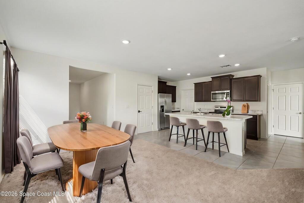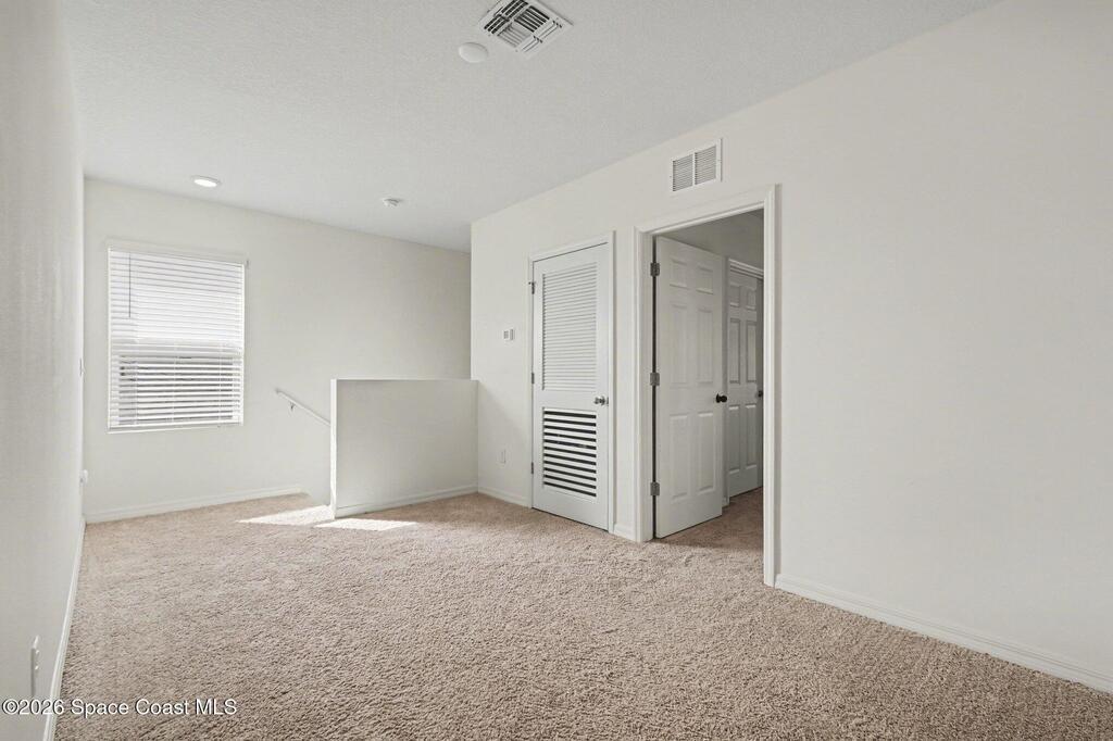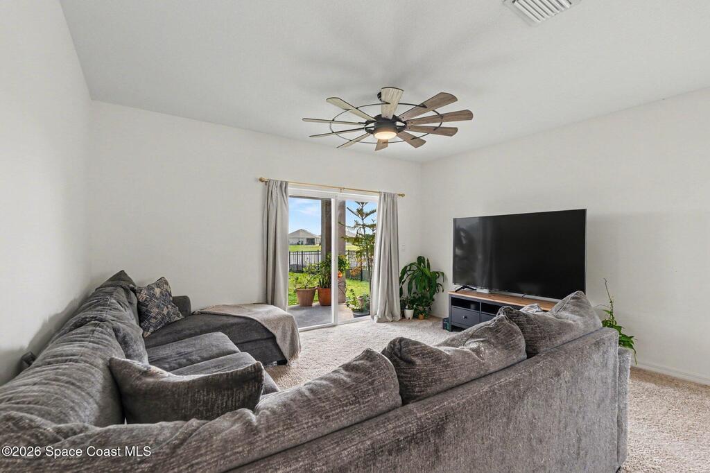 Welcome to your lakefront home in Harvest Landing--where space, flexibility, and location come together. This 5-bedroom, 3-bath home offers a highly desirable layout with a first-floor bedroom and full bath, perfect for guests or multi-generational living. Built with solid concrete block construction, the open-concept design features a bright kitchen overlooking expansive living and dining areas ideal for gatherings. Upstairs, the oversized primary suite easily fits a king bed and includes a walk-in closet and double vanity bath. Three additional bedrooms provide room for everyone. Step outside and unwind with peaceful water views from your backyard. Smart Home features, ceiling fans, washer and dryer included, plus gutters already in place. Enjoy a community pool, parks, and nature trail. Just minutes to I-95, beaches, Port Canaveral, Kennedy Space Center, shopping, dining, and major employers. Move-in ready and waiting.