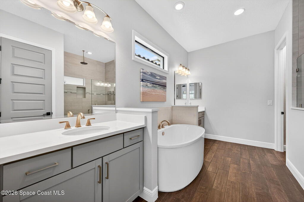 Better than new, see UPGRADE LIST! Thoughtfully designed Almeria II with Bonus room built in 2023. This 2-level courtyard home boasts 4 Bedrooms, 3 Baths, 2 Car + Golf Cart/Workshop Garage & 4086 total square footage. Downstairs master suite & dream bath equipped with double vanities, freestanding tub & enclosed, large shower. The great room w/fireplace, dining room, laundry, guest bedroom & bath are downstairs. 2 bedrooms sharing a bathroom, loft & balcony access are upstairs. All bedrooms include high end closet organizers. The gourmet kitchen delivers with upgraded quartz counters, soft close white shaker cabinets/drawers & premium appliances. Plus, a pot filler, farm style sink & pantry/coffee bar built out to maximize space & use. Big upstairs bonus room serves as a second family room & includes a Murphy Bed. Relax & extend your living space in your courtyard with privacy gates. Level 4 wood-style tile, 8 Ft grey interior doors, tankless water heater & maintenance free living too!