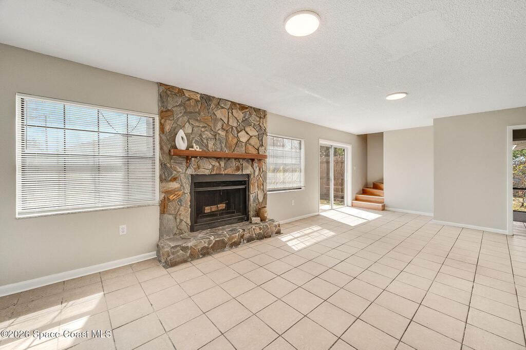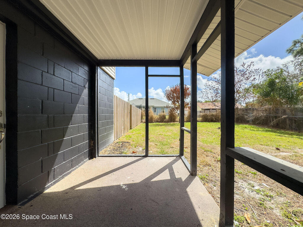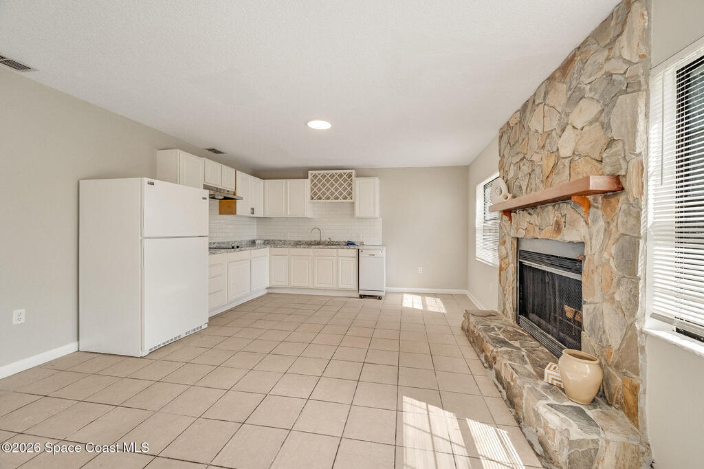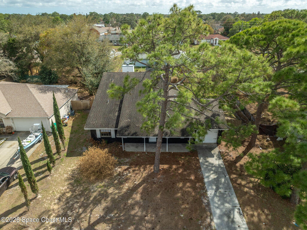 This unique 4-bedroom, 3-bath home offers 2,319 sq ft of flexible living space and a layout full of possibilities. The standout feature is a separate living apartment with its own private entrance and private backyard, ideal for multi-generational living, guests, or a private retreat. A welcoming open front porch adds charm and the perfect spot to relax. The main home features a bright white kitchen with butcher block countertops, an indoor laundry, and sliding doors that open to the outdoors. The apartment offers a spacious living and kitchen area with a cozy fireplace and a large upstairs bedroom, creating a comfortable and private living space. A one-car garage with a newer garage door adds convenience. Updates include roof (2015), HVAC (2014), water heater (2014), and sliding doors (2015). Centrally located in Port St. John with easy access to highways, shopping, dining, and area employers. This is a must-see for yourself!