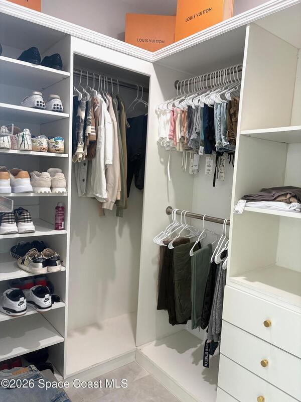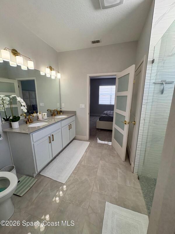 Welcome to one of the most upgraded 4-bedroom homes in SW Palm Bay! This high-quality, energy-efficient home is designed to produce more energy than it consumes with its solar panel system. Interior upgrades include quartz countertops, ceramic glossy tile flooring, crown molding, Energy Star stainless steel appliances, gold faucets and hardware, smart home features, security cameras, stone accent walls, zebra window treatments, and an electric fireplace. The primary suite features a fully customized walk-in closet and a luxurious shower with double shower heads. Step outside to a spectacular oversized gazebo equipped with a separate Wi-Fi, refrigerator, freezer, sink, bar seating, fan, granite countertop, and privacy curtains--perfect for entertaining. The fully paved and fenced backyard expands the outdoor living space, while the oversized glass front door and glass pantry door add a modern touch.
