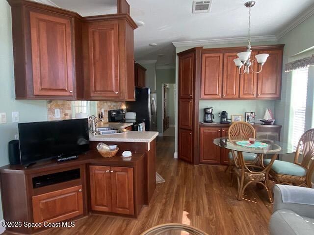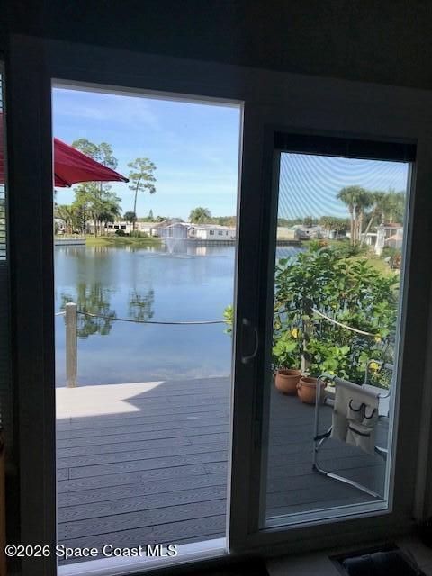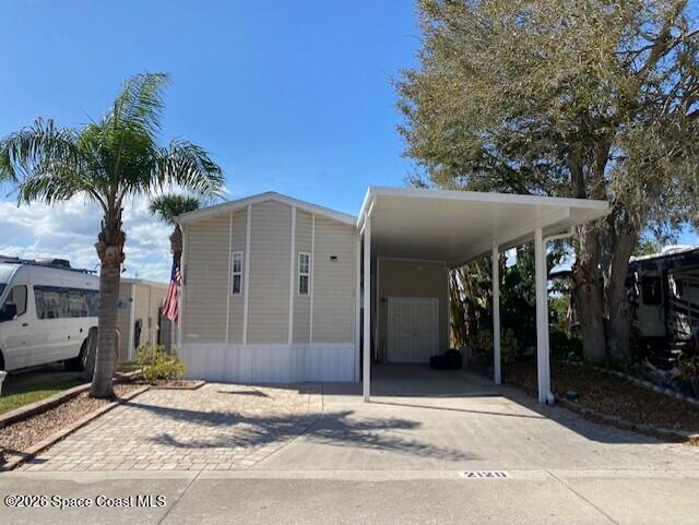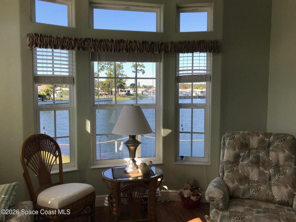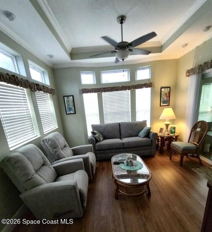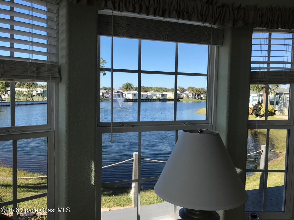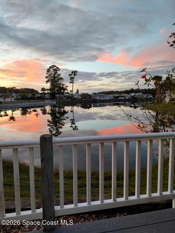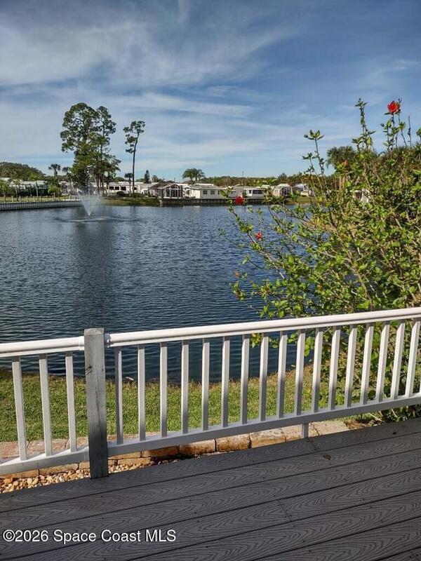 Fully upgraded and modern park model with bonus room and extra half bath, covered parking and composite deck overlooking the lake! Shows like new, AC in 2025, and furnishings included to make it easy to start enjoying as your winter retreat or full time residence. Extra pavers provide additional parking. There is room under the covered parking for a class B motorhome or your vehicle. New landscaping and located on dead end street. This active 55+ community has clubhouse, heated pool, newly surfaced pickleball/tennis and activities. Executive golf course on property and watch rocket launches from your from yard! Close to airports, beaches, theme parks, shopping and restaurants.