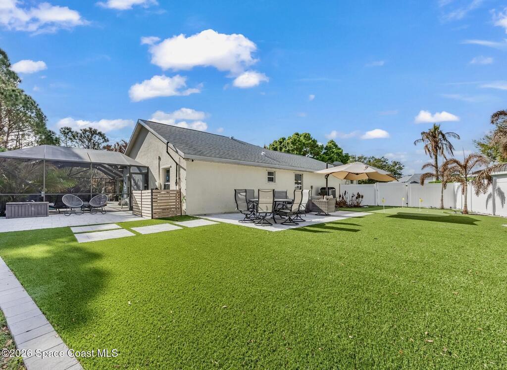 Beautiful 3-bedroom, 2-bath split floor plan pool home located on a cul-de-sac in the desirable Oak Grove community, backing up to a private preserve for added privacy and peaceful views. Situated on a spacious .31-acre lot, this property offers plenty of room to enjoy both indoor and outdoor living. Major updates include a 2024 roof and 2022 AC. The home features an updated kitchen with granite countertops, new bathroom vanities, and a functional layout perfect for everyday living and entertaining. Step outside to a screened-in inground pool and a fully updated backyard featuring a high-quality AstroTurf putting green, two paver patios, and LED landscape lighting throughout. The Oak Grove community also offers a playground for children, and the home is centrally located to everything Melbourne has to offer and within a highly desirable school district. A perfect combination of location, privacy, and upgrades