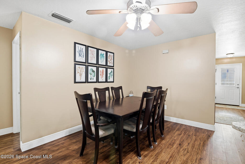 Tucked away on a private lot with a peaceful canal backdrop, this beautifully updated home offers the perfect blend of comfort, style, and space in desirable SE Palm Bay. Situated on nearly a quarter-acre, the property boasts a huge fully fenced backyard with plenty of room for your RV, boat, or future outdoor additions.Step inside and you'll immediately appreciate the exceptional open floor plan enhanced by vaulted ceilings, creating an airy and welcoming feel throughout the home. Elegant luxury vinyl plank flooring flows through the main living areas, complemented by coordinating laminate in the primary suite - no carpet anywhere, and finished with 6'' baseboards for a polished look.This thoughtfully designed home features 3 bedrooms and 2 beautifully updated bathrooms, along with a spacious flex room off the primary suite - ideal as a home office, nursery, fitness space, or private sitting room. The primary suite includes a walk-in closet and an updated ensuite bath with a newer