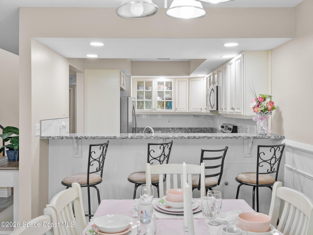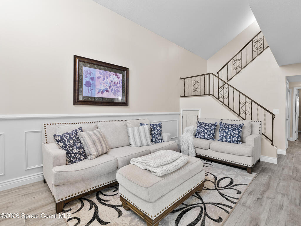 Beautifully maintained 3-bedroom, 3-bathroom townhome located in a quiet community with a peaceful park-like setting. This home features a private courtyard entrance and a spacious living area highlighted by a stunning staircase that creates an elegant focal point in the living room. The floorplan includes one bedroom and full bathroom on the 1st floor, perfect for guess or flexible living arrangements. The primary suite features a private balcony overlooking a well-maintained green space, offering a peaceful place to relax. a bright Florida room, or flex space provides additional living space perfect for enjoying natural light year-round. This home provides easy access to I-95, Orlando Airport, Port Canaveral, and the beautiful Space Coast beaches, along with nearby shopping, dining and entertainment. A wonderful combination of comfort, convenience, and location. Don't miss this opportunity to enjoy Space Coast living in a tranquil and well-maintained community.