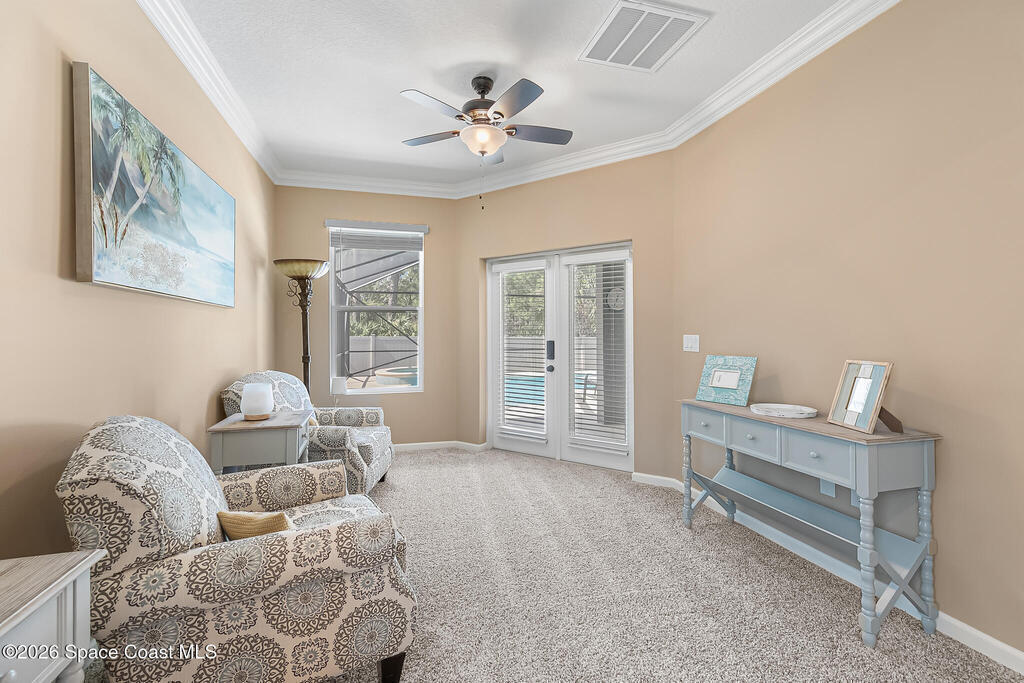 Like-new beautiful 4-bedroom, 3-bath home with a 3-car garage in the desirable Bayside Lakes Stonebriar community backing to a peaceful preserve. This spacious floor plan includes a sitting room and dedicated office, offering flexibility for work or relaxation. The kitchen opens to the main living area and all kitchen appliances remain. Interior features include crown moulding in the living areas, office, and primary bedroom, cordless blinds, ceiling fans, new carpet, fresh interior paint, and a smart thermostat. Enjoy outdoor living with a screened pool and spa with heat pump and a freshly painted pool patio. The property also features a paver driveway, vinyl fencing, fresh exterior paint, and new exterior door hardware. Additional upgrades include an 8-camera digital video system, electronic deadbolts, city water and sewer, and a dedicated sprinkler well and pump. Energy-efficient 12kW solar system with two Tesla batteries provides added efficiency and backup power.