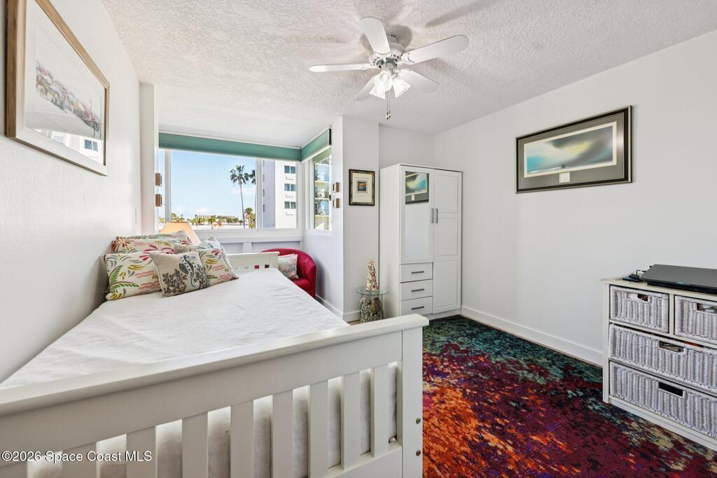 Coastal living awaits in this oceanfront 2-bedroom, 2-bath condo in the desirable Twin Towers Condo. This 912 sq ft residence features a bright open floor plan where the living and dining areas flow together, filled with natural light. The kitchen offers stainless steel appliances along with ample cabinet and counter space. The primary bedroom provides a spacious retreat with an additional nook ideal for a reading space or home office. The primary bathroom features a glass-tiled walk-in shower, while the second bathroom includes a recently refinished bathtub. Both bathrooms were fully remodeled in 2022. Each floor of the building has a convenient laundry room for residents. Major updates include impact windows and electric shutters (2022), a new electrical panel with upgraded GFI outlets (2022), tankless water heater (2022), and upgraded lighting and ceiling fans. This unit also comes with a private deeded carport parking space, providing added convenience.