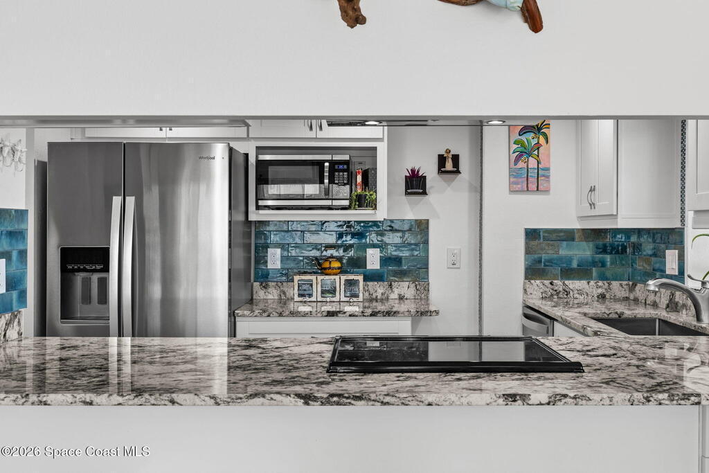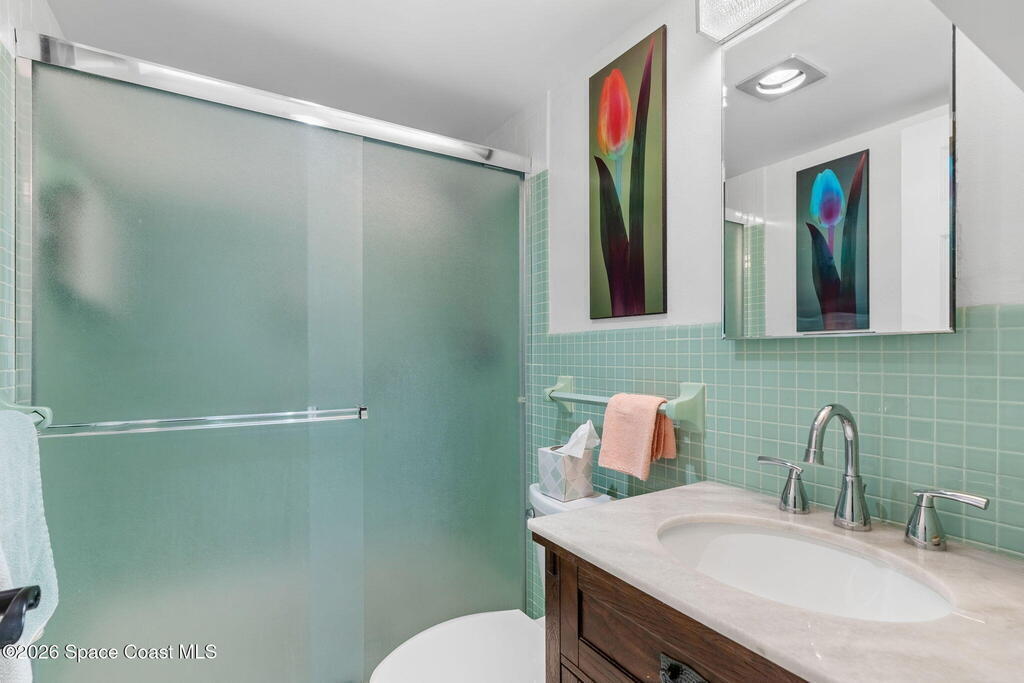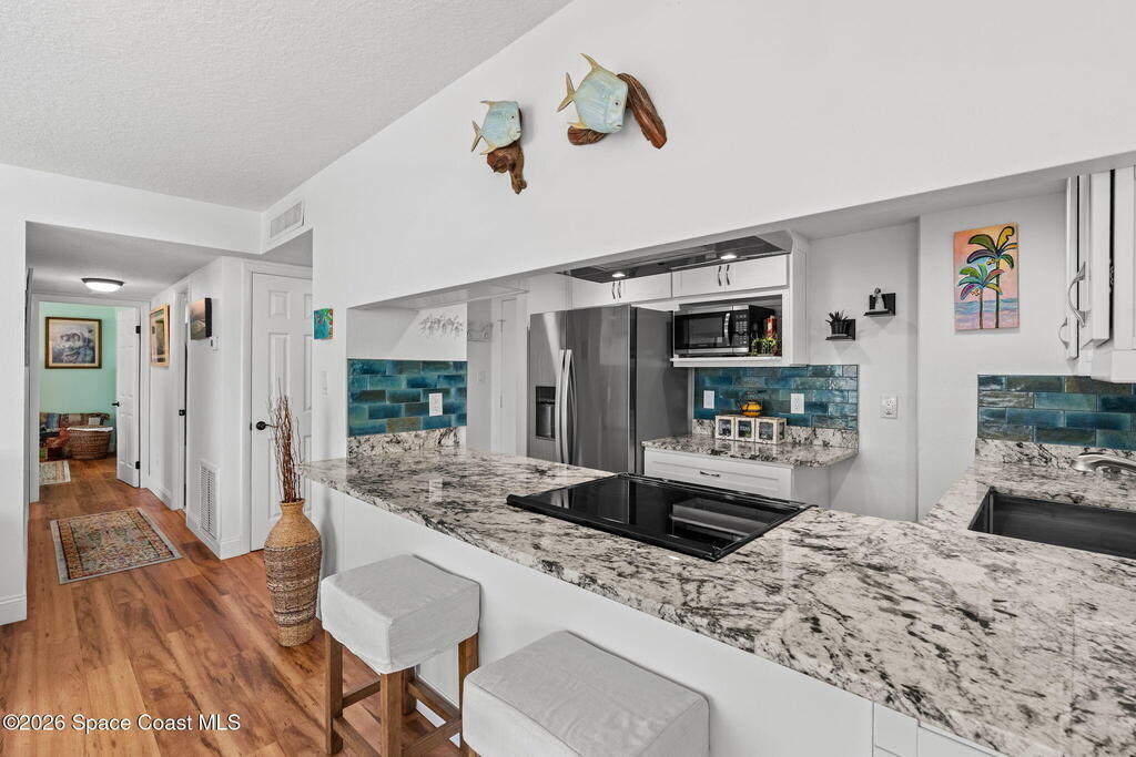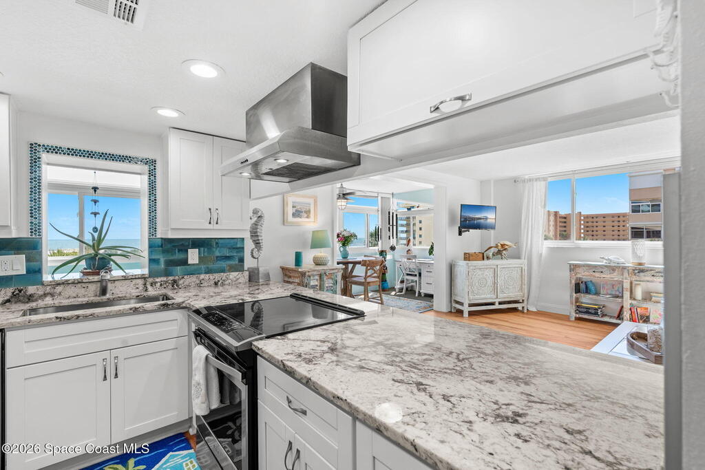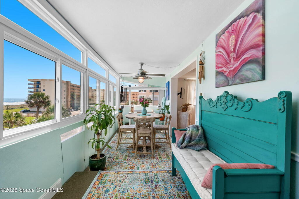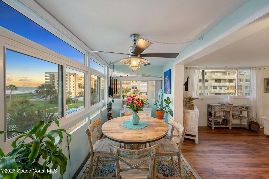 4TH FLOOR 2/2 BEACHFRONT BEAUTY!!! One of only 12 direct ocean units in the complex!20 magnificent feet of wall-to-wall, direct ocean-facing windows bring in abundant natural light and uninterrupted water views at this Cocoa Beach iconic Twin Towers condo. Originally constructed in1964 for NASA families during the height of the Space Race, it's one of the largest 2/2 units offering 1,089 sq ft of modern meets mid-century coastal living: Clean lines, expansive glass, and a layout oriented toward the Atlantic. The updated kitchen features ocean blue subway tile, stainless appliances, and gorgeous granite PLUS a pass thru window at deep farm sink offering ocean views. Pecan luxury vinyl plank blends beautifully, and the original 60's bathrooms perfectly blend old with new. Both bedrooms open to a shared side balcony with additional ocean views, creating a seamless indoor-outdoor connection and natural cross breezes.Windows like these don't stay open long. Blink...and you will miss it!