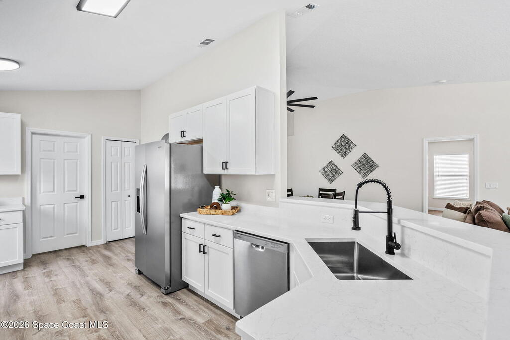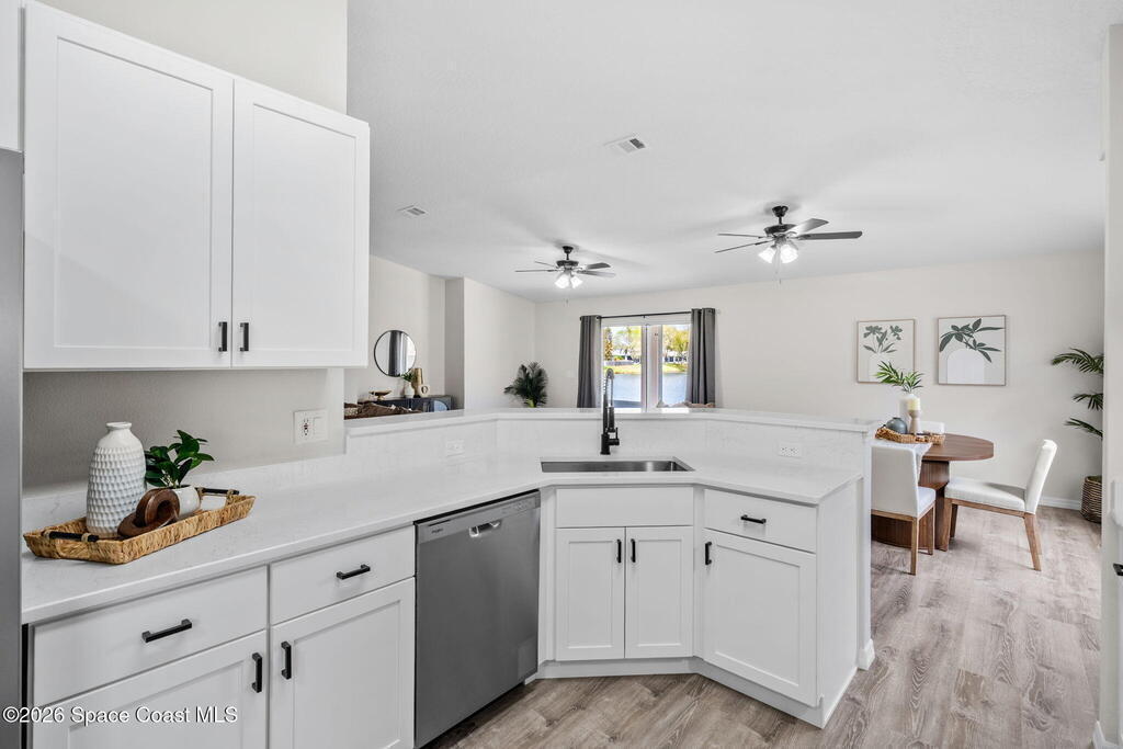 Completely renovated and move in ready, this lakefront home in Meadow Lake offers modern finishes, open living space, and beautiful water views. This gorgeous 3 bed, 2 bath home with a 2 car garage offers 1,903 sq ft and one of the best lake views in the neighborhood. Inside, everything is brand new including LifeProof waterproof luxury vinyl plank flooring, fresh interior paint, and a stunning kitchen that has never been used. The kitchen features quartz countertops, soft close shaker cabinets, Whirlpool stainless steel appliances, and a custom coffee bar. The open and versatile layout provides space for living, dining, an eat in kitchen, and a flexible area for an office, library, or play space. Both bathrooms are beautifully updated with modern vanities, mirrors, and lighting. Enjoy peaceful lake views. sunsets and rocket launches from the covered and screened patio plus an additional outdoor patio ready for grilling or relaxing. Fresh sod, Community pool, Summer is almost here!