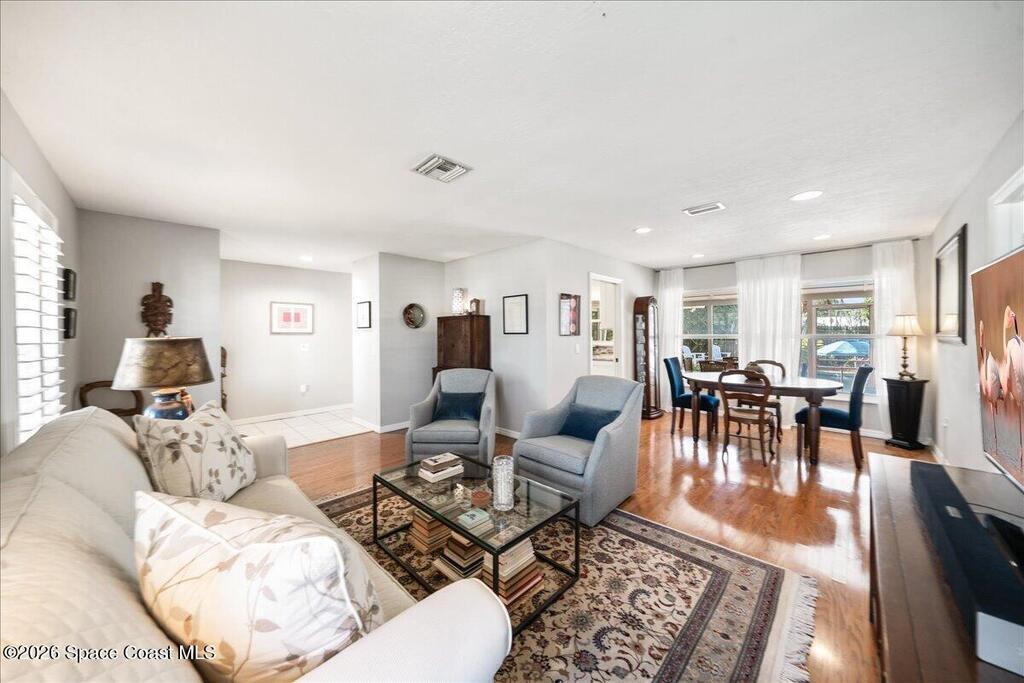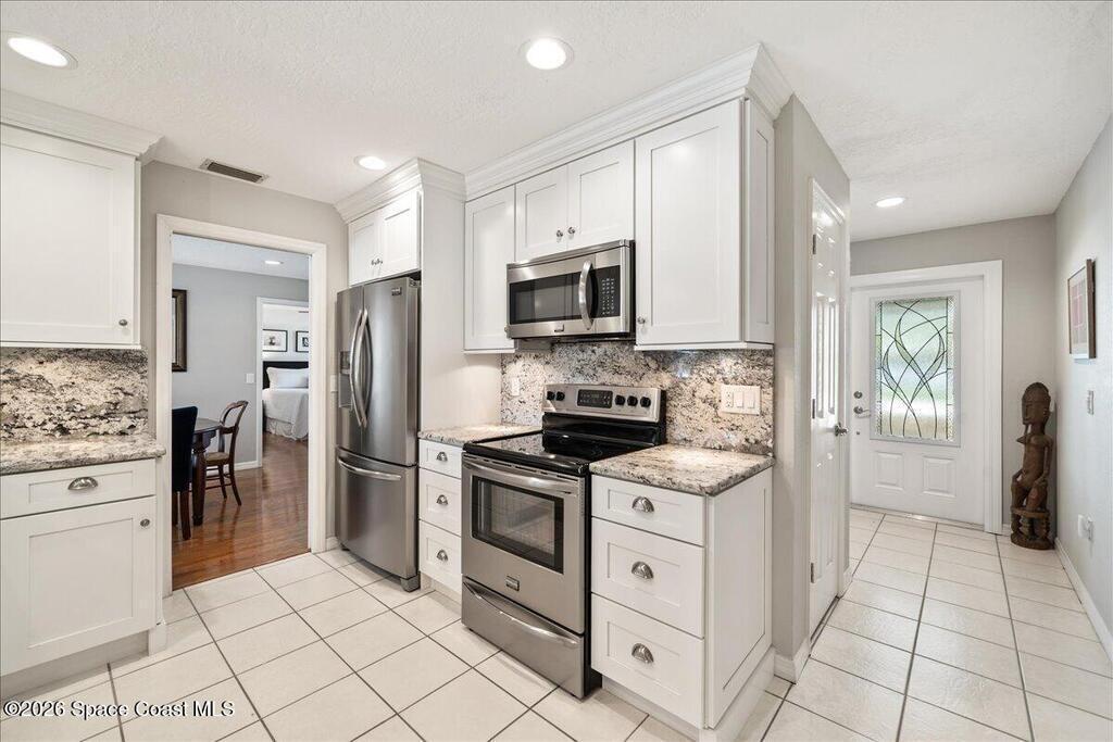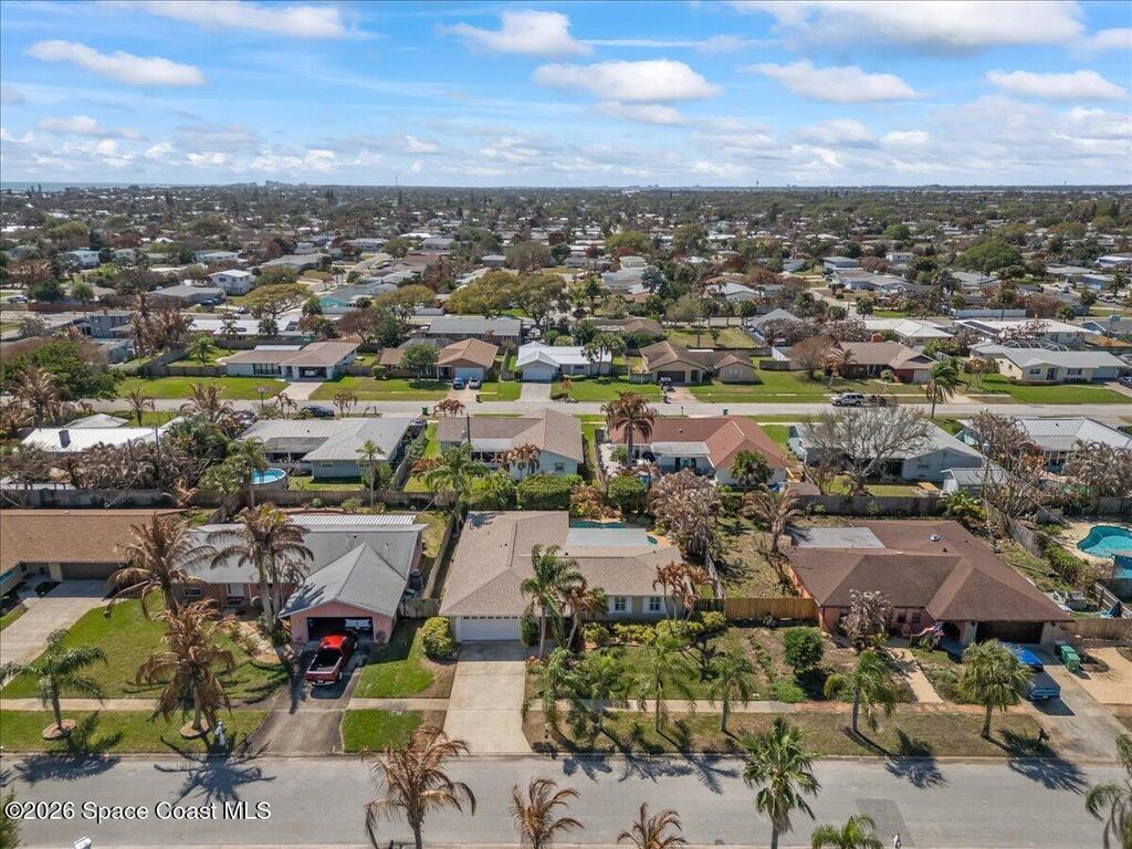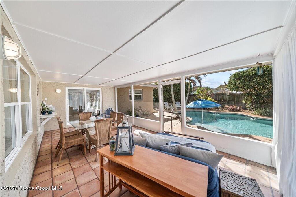 4-bedroom POOL home in Satellite Beach just 2 BLOCKS FROM THE OCEAN! This well-maintained concrete block home features IMPACT WINDOWS & DOORS throughout , 1,554 SF of living space plus a 276 SF screened porch with tile floors overlooking a fenced backyard and freeform pool w/ sitting ledge and tropical landscaping - Your Private Oasis. The oversized 2-car garage includes a storage area and washer/dryer. Major updates: new roof (2023), HVAC (2023), new AC ducts (2025), water heater (2024) and no cast iron pipes. Beautiful white kitchen with deluxe cabinetry, granite countertops & backsplash. No HOA and room to park a boat or RV beside the home. Walk, bike or take your golf cart/LSV to the public beach access just two blocks away. Convenient to Publix, pickleball and tennis clubs, 10+ restaurants, coffee cafes, boutiques, farmer's market, top-rated schools, and major employers (Patrick Space Force, SpaceX, KSC, L3Harris, Northrop Grumman), with easy access to Pineda Causeway/404 and I-95