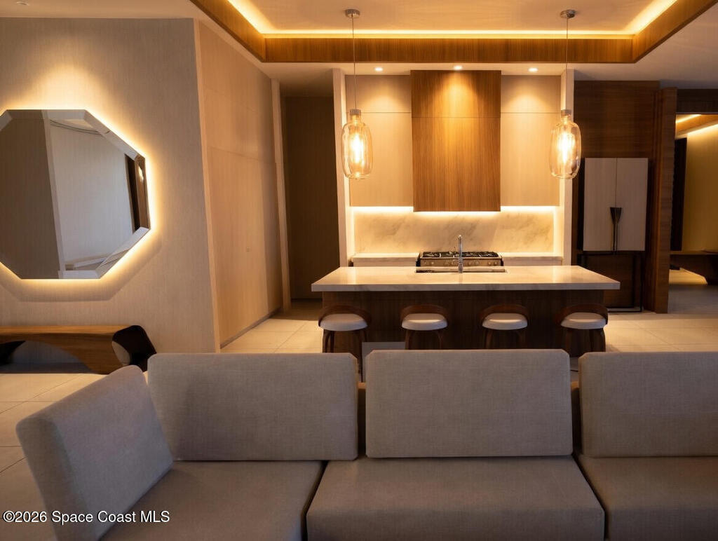 This extraordinary brand-new luxury waterfront estate sits along the prestigious S. Tropical Trail on Florida's Space Coast, offering rare river to river deep water frontage. Elevated on a natural coquina bluff at 10ft, it delivers sweeping Indian River views to the front and Banana River vistas to the rear-perfect for sunrise and sunset experiences daily. The sophisticated two story open concept design features a dramatic 10' pivot entry door, expansive walls of impact glass framing the water while giving you the safety and security of the most modern building codes in this new home. Soaring tray ceilings create a feel of elegance and airy ambiance. The gourmet kitchen shines with premium Dacor appliances, Bespoke cabinetry, a large central island and hidden walk in pantry.The exquisite Madreperola quartzite countertops and full wrapping backsplash exhibit creamy beige tones with soft pearlescent undertones for timeless opulence. A luxurious first floor primary suite