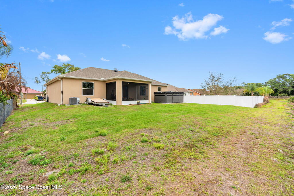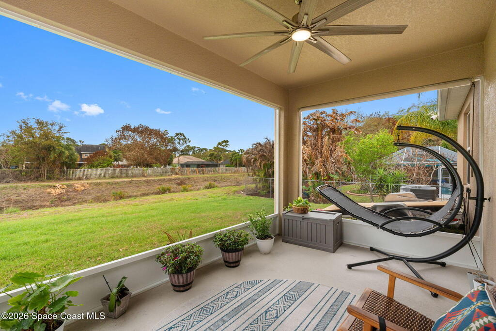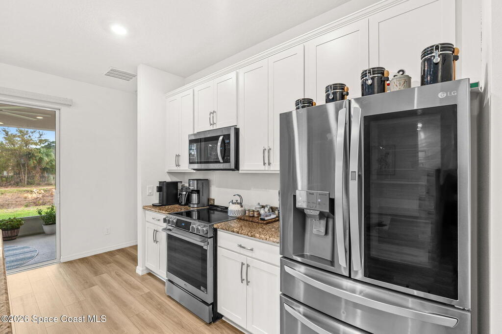 Built in 2023, this beautiful upgraded Clearwater model sits on a spacious quarter acre city water lot in Bayside Lakes of Palm Bay. The open concept design creates a bright and inviting space with a large great room that flows into a stylish kitchen featuring granite countertops, a large prep island, sleek cabinetry, and upgraded LG and Whirlpool appliances including an induction stovetop with air fryer convection oven. This home stands out with luxury vinyl flooring throughout with no carpet, Low E storm windows with remote window shades, and all LED lighting. Additional upgrades include a 50 amp exterior outlet, LED air duct lights, extra electrical boxes and ceiling lights in the garage, plexiglass covered shelving, and new cabinet hardware throughout. The split bedroom layout offers privacy with a relaxing owners suite, walk in closet, and spa inspired bath. Enjoy the screened lanai overlooking a canal with no future rear neighbors. Concrete block construction and storm shutters.