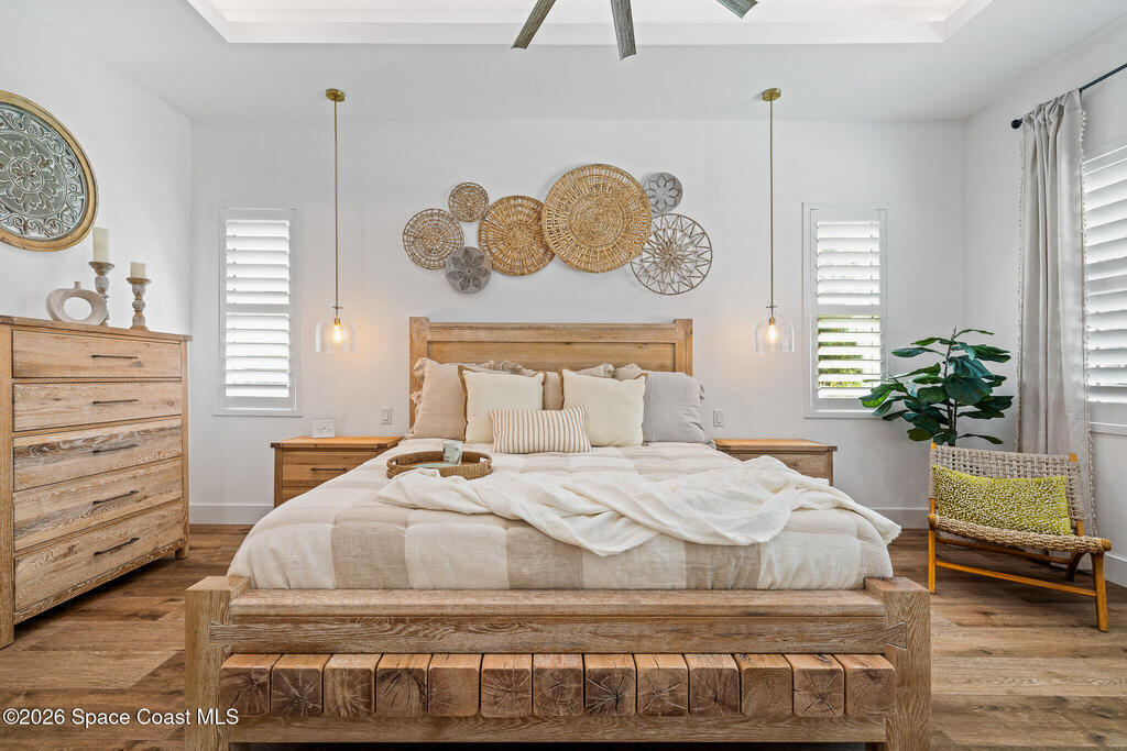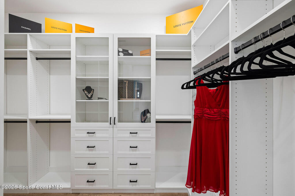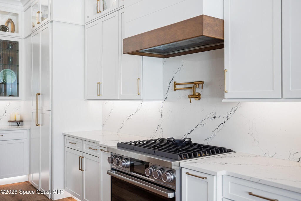 Elegant Custom Built Brand New 5 Bed, 3.5 Bath, 3 Car Home featuring an open floor plan, home office, ensuite, 10' tall sliding glass doors, Impact glass windows, Plantation shutters, large kitchen island, built in appliances, wine fridge, walk in pantry, laundry room with wall to wall storage, central vaccum system, air conditioned garage, whole home generator prewire, indoor electric fireplace, breakfast nook, summer kitchen, pool, gas buring fireplace w/ TV above on rear patio, heated inground spa, fenced rear yard overlooking a large body of water.