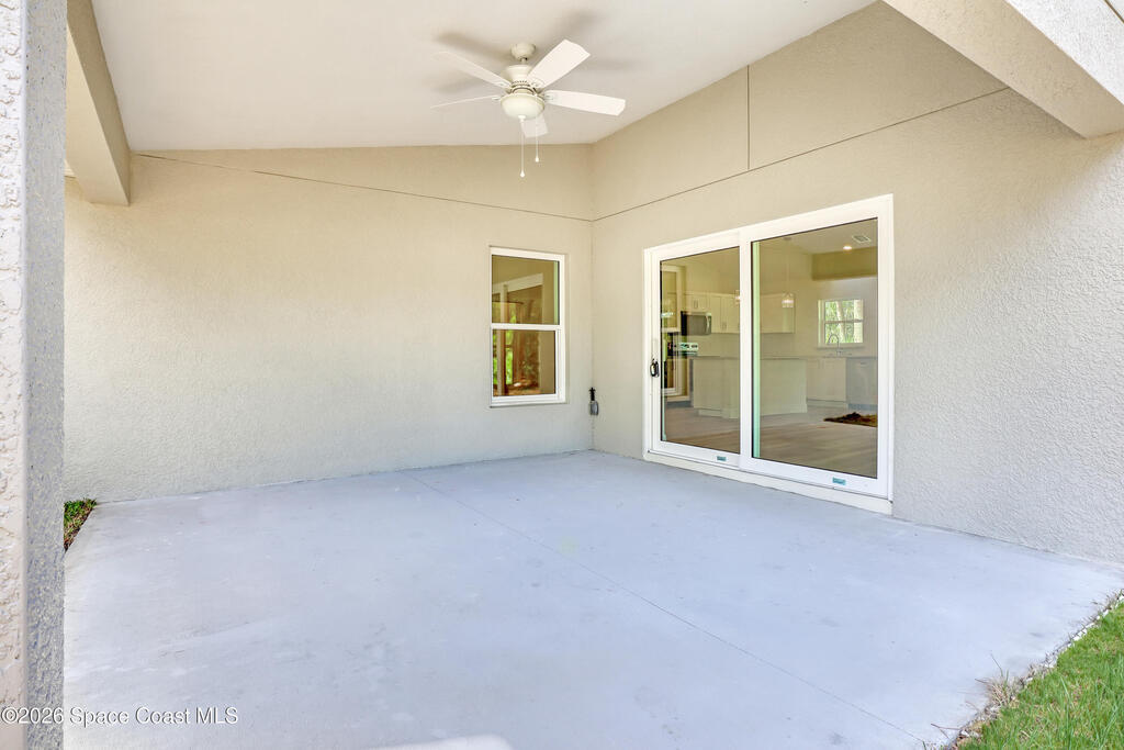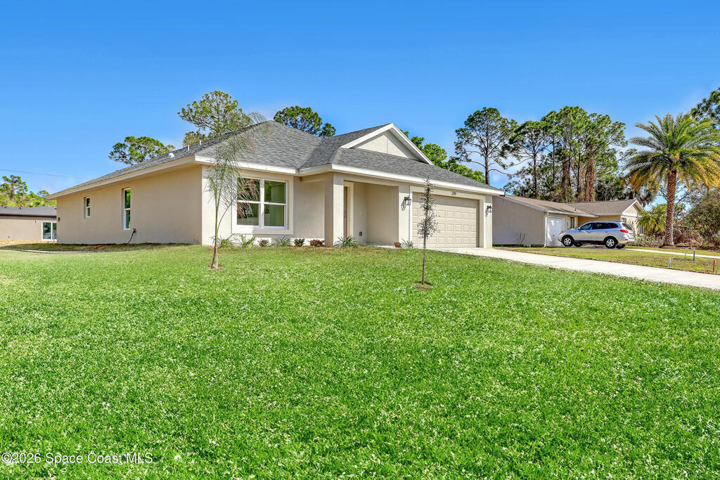 Construction Completed - New construction home with hurricane impact windows and doors and a full home water treatment system already installed. This 3 bedroom, 2 bathroom home offers 1,632 square feet under air with high cathedral ceilings that create a bright and open living space. The kitchen features granite countertops, stainless steel appliances, and luxury vinyl plank flooring throughout the home. Oversized bedrooms provide comfortable living, and the dedicated laundry room includes a washer and dryer. Enjoy the large covered rear porch and the convenience of a two car garage. Located in Palm Bay and built by a local builder, offering the peace of mind that comes from quality construction and attention to detail.