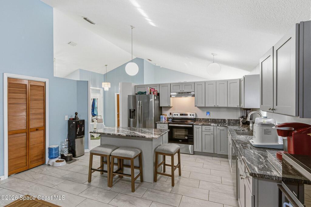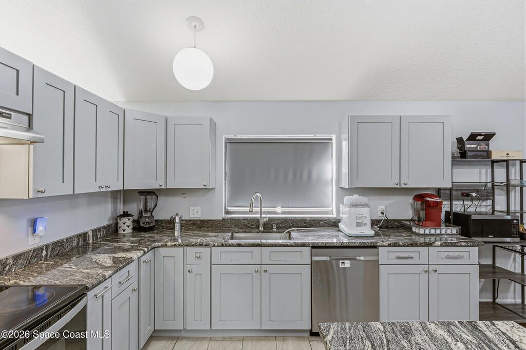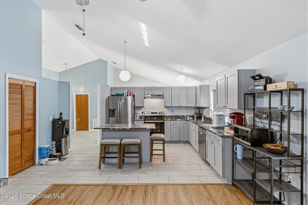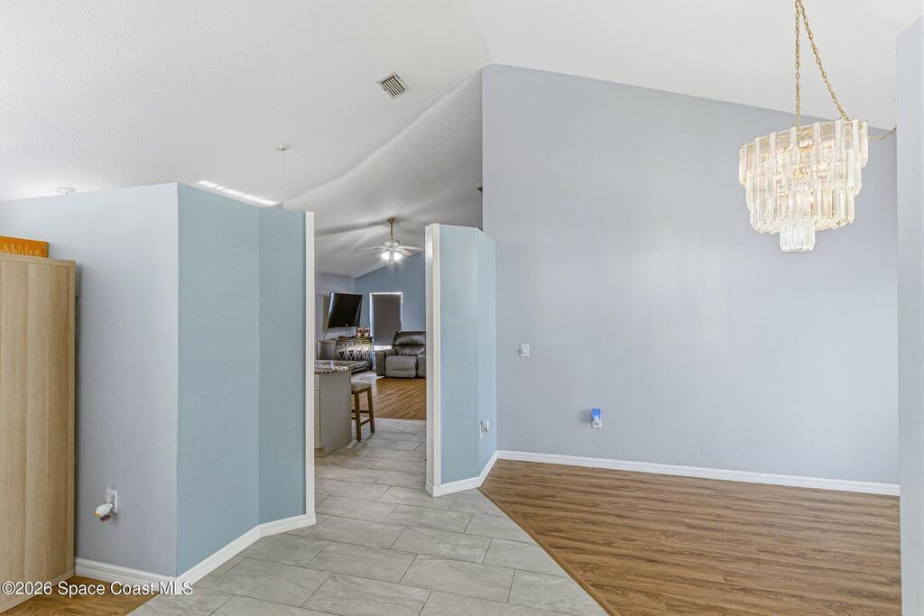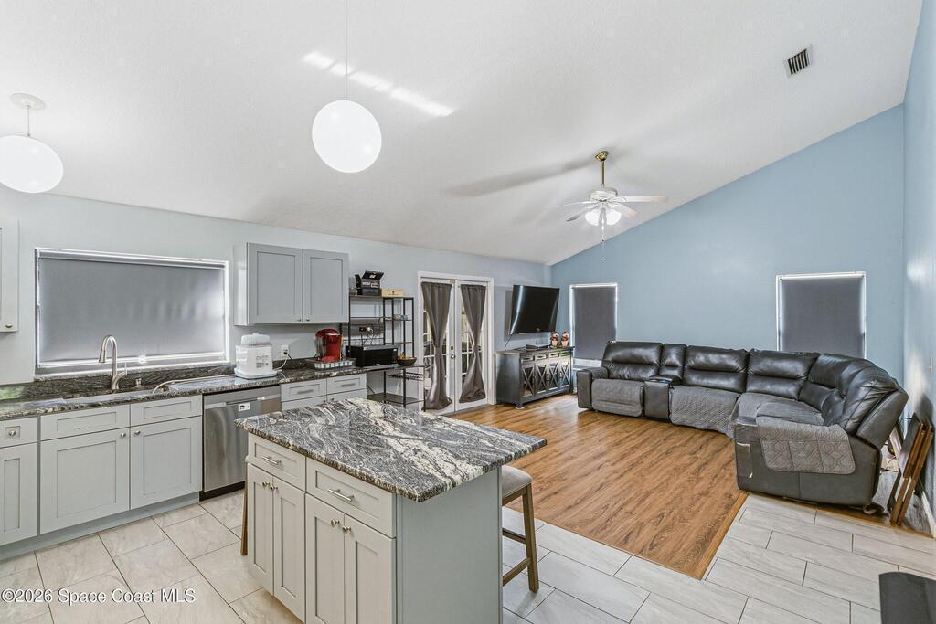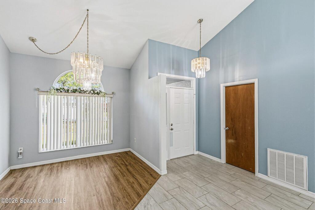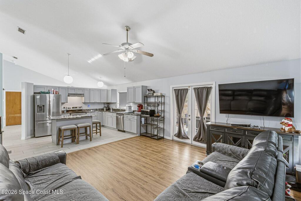 Welcome to this beautifully updated 1,700 sq. ft. home with an open floor plan and generous living spaces. Conveniently located just 15 minutes from historic Cocoa Village, 20 minutes from the beaches, and 45 minutes from Orlando's International Drive. This home has been thoughtfully improved with a 2019 roof, 2023 A/C, and 2024 water heater. The kitchen was fully updated in 2024 with new cabinets, appliances, and a stylish center island. New flooring enhances the foyer, kitchen, bathroom, and living room, while newer window treatments add a polished touch to the kitchen and living area. The guest bath was upgraded in 2024 with new cabinetry and countertops. The primary bath includes updated plumbing, an updated shower, a new bidet, double sinks, and a relaxing garden tub. Additional features include a new water softener system, new back porch screening, and a doorbell camera. Step outside to a backyard filled with fruit trees and plants, including loquat, mango, mandarin, lemon,