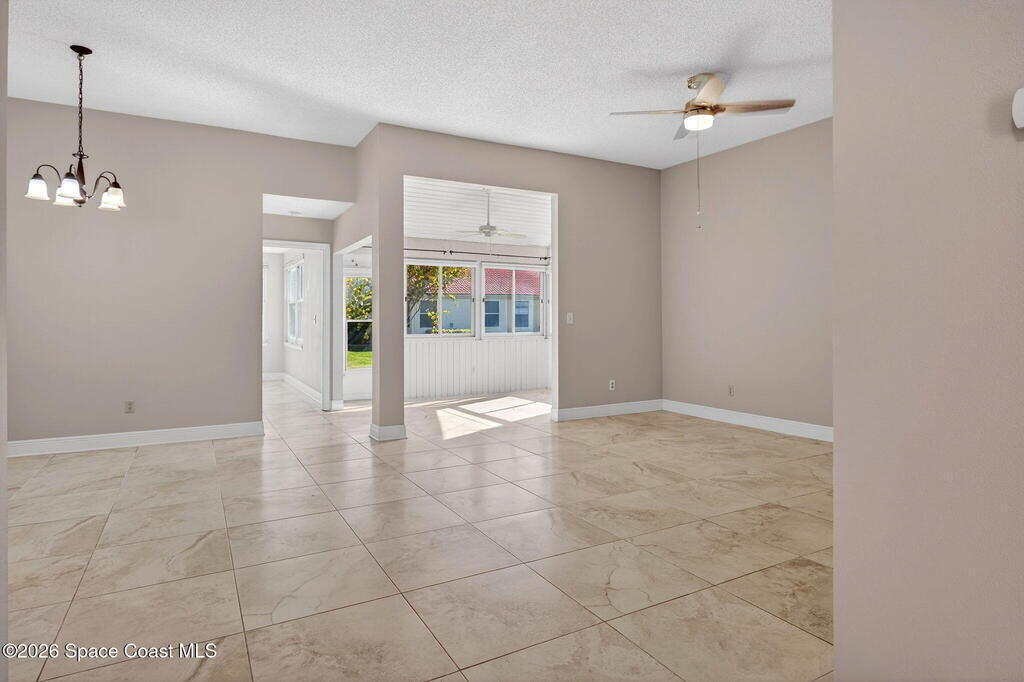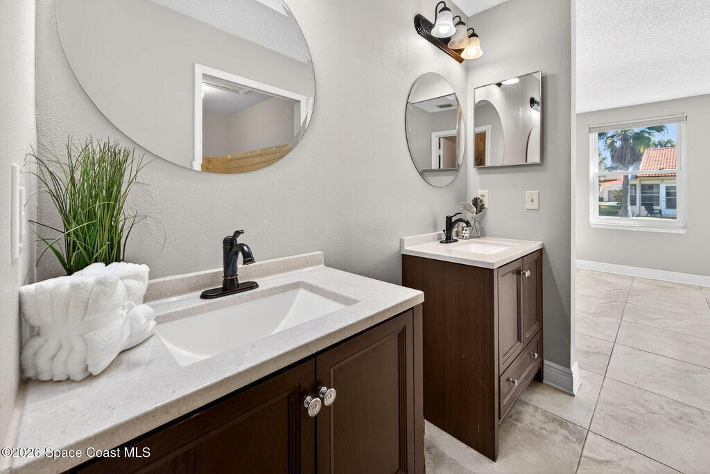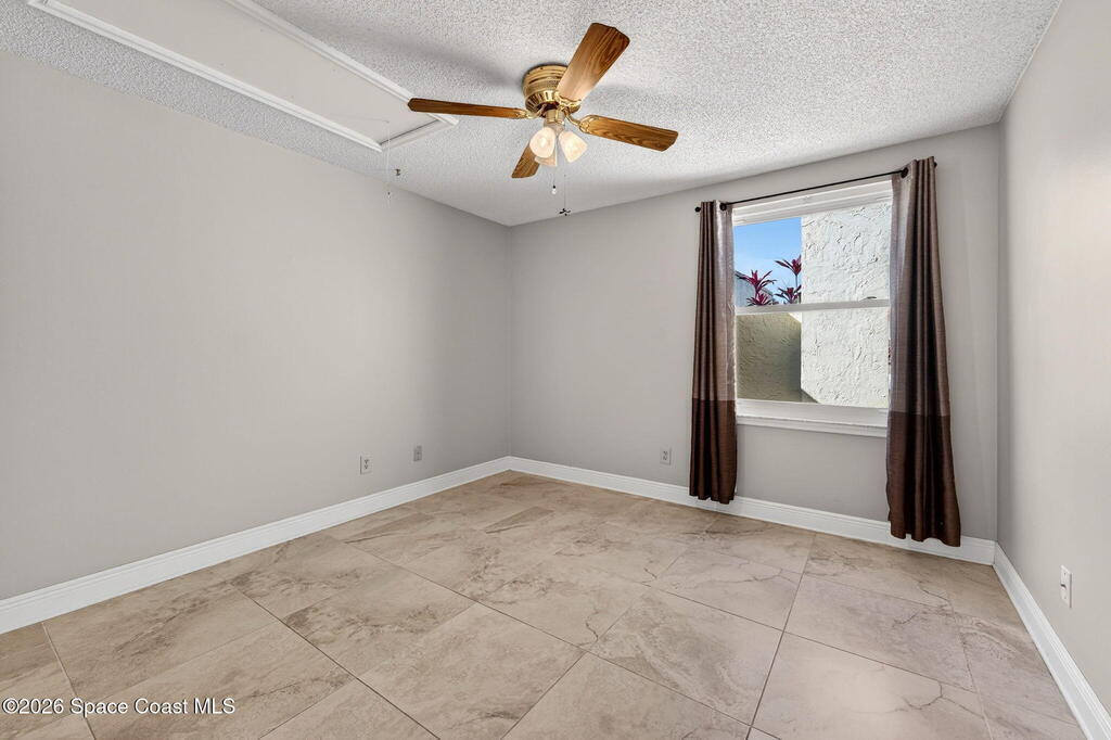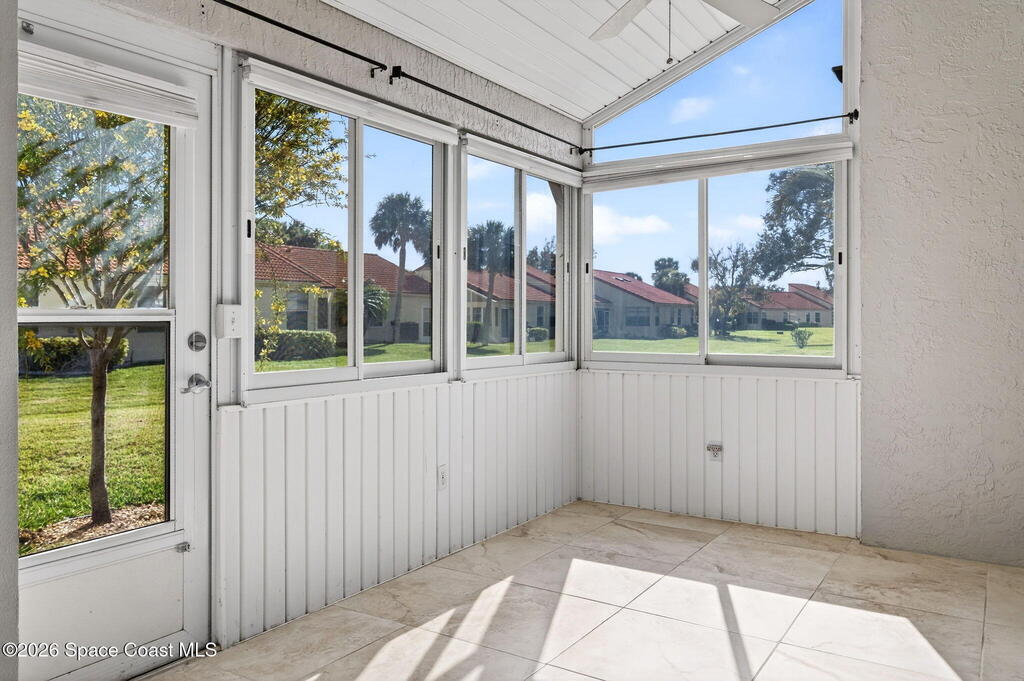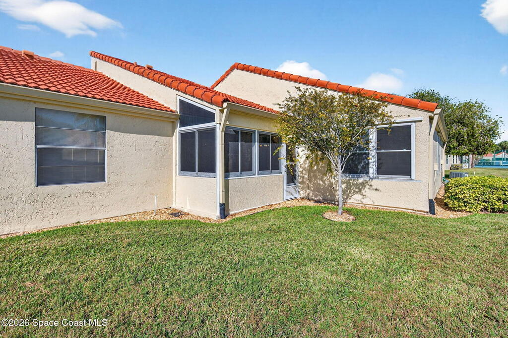 Beautifully maintained ONE-Story villa in the heart of Suntree! This light and bright 2-bedroom, 2-bath home with a 1-car garage is truly Move-In Ready! Featuring gorgeous tile flooring throughout, IMPACT WINDOWS and a spacious open living area offering both comfort and style. Enjoy an updated primary suite with double vanities, walk in shower and large walk in closet. Abundant natural light in every room. A/C 2020. Water Heater 2025. Step outside to your private screened-in courtyard -- perfect for relaxing or entertaining. Tucked away on a quiet cul-de-sac street with a short walk to the amenities area, this home offers peaceful living. Community pool, tennis courts & more. Close to golf, walking paths, shopping, Patrick Space Force Base and all major roadways. Just a short drive to the BEACH. SEE IT TODAY!