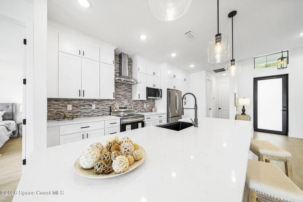 Under construction, est. completion May 2026! Pictures are of model home, colors & finishes vary, same upgrades. Luxury 4 bedroom, 3 bathroom home with a Private Guest Suite and High-End Finishes. Paid Closing Costs with builders preferred lender! Enjoy IMPACT windows & doors, wood-look porcelain tile throughout, soaring 9'4'' ceilings, and 8' interior doors. You will fall in love with the kitchen which features a waterfall quartz island, pendant lighting, ceiling-height soft-close cabinetry, pull-out spice rack & hidden trash bin, exterior vented hood and LG appliances. The spacious guest suite lives like a second primary with its own entrance, kitchenette, & full bath. The primary suite offers a spa-like retreat with a free standing tub, walk-in shower, dual vanities, and large walk-in closet. Entertain in the open living/dining area that flows to a covered patio pre-plumbed for a summer kitchen. Complete with a laundry room w/ utility sink, gutters, smart fans and light fixtures.