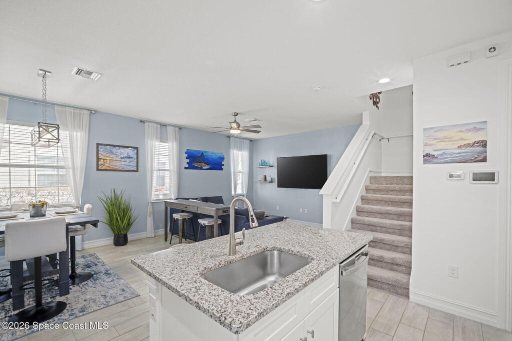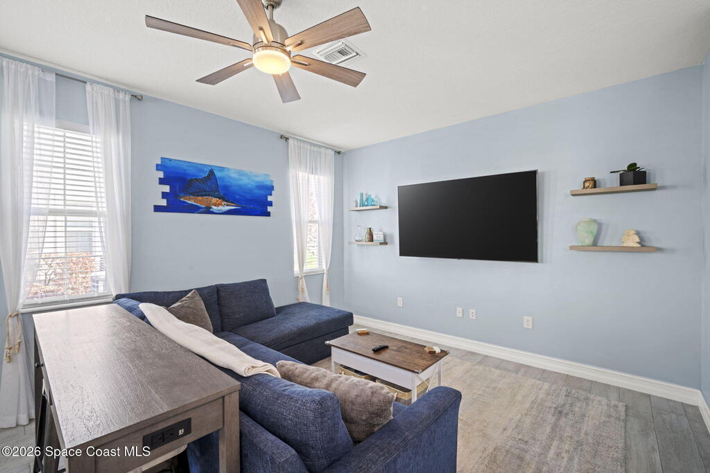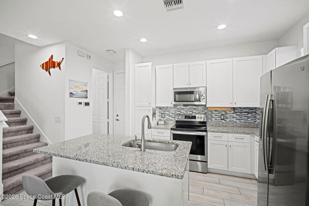 Step into easy coastal living in this nearly-new townhome tucked inside the gated community of Riverwalk of Melbourne, where every detail feels thoughtfully designed for comfort, style, and everyday enjoyment.Built in 2022, this 3-bedroom, 2.5-bath home welcomes you with a light-filled open layout and a calming palette inspired by the coast. Sunlight pours through generous windows, dancing across beautiful wood-look tile floors and creating a space that feels both fresh and inviting from the moment you walk in.The heart of the home, in the kitchen, is where mornings begin and evenings come together. Featuring crisp white cabinetry, gleaming granite countertops, and sleek GE Profile appliances, it's a space that's as functional as it is beautiful. Whether you're preparing a quiet breakfast or hosting friends, everything flows effortlessly into the main living area.
