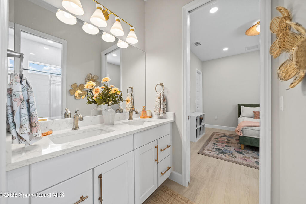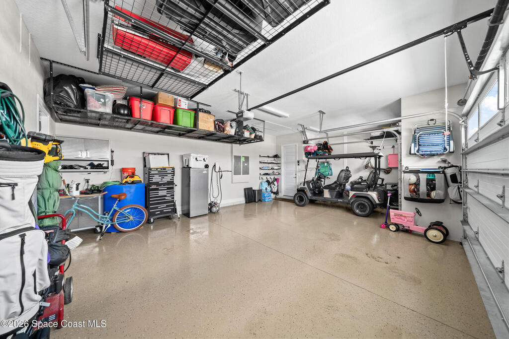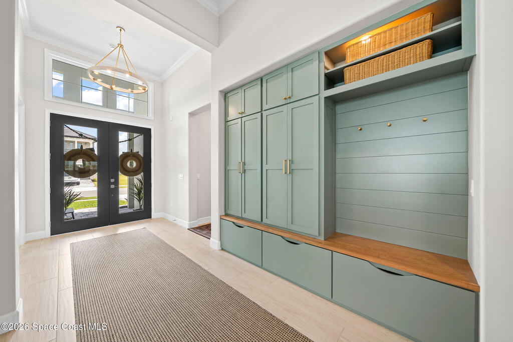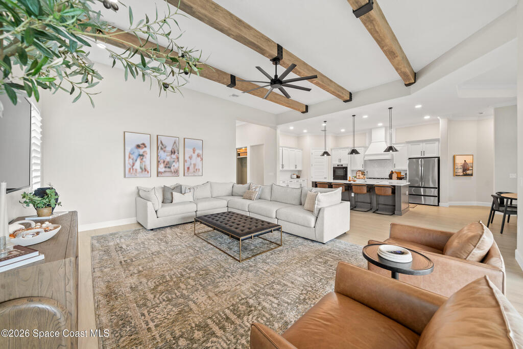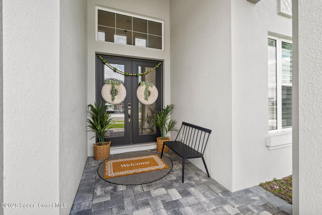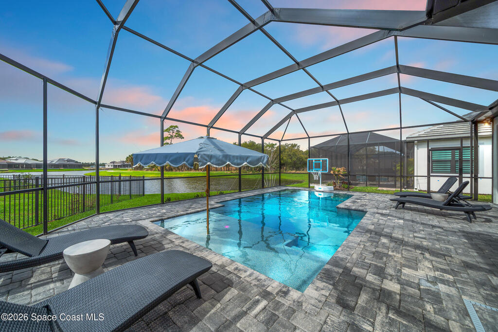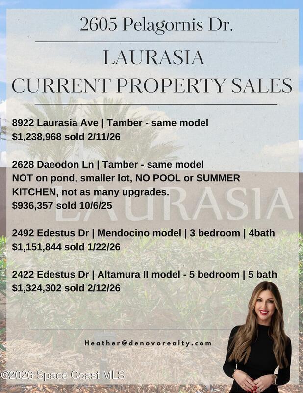 Why wait to build when you can own this stunning Tamber model in the gated community of Laurasia! Located in a highly sought-after, golf cart-friendly neighborhood just minutes from A-rated schools, this award-winning 4 bedroom, 3.5 bath home on a large corner lot, offers an exceptional open layout with an oversized bonus room & unrivaled living/entertaining space. Soaring 12-foot ceilings, wood beam accents & tile flooring create a bright, elegant ambiance throughout. A show-stopping custom entryway storage feature was just put in as an added feature! The dreamy kitchen features gas appliances, quartz countertops & premium finishes, seamlessly flowing into the main living areas. Natural light pours in through the expansive slider and impact windows. The primary suite offers both a soaking tub and luxury shower for relaxing. Step out back to your private oasis with a saltwater pool and fully equipped summer kitchen. Close to shopping, dining and endless entertainment!