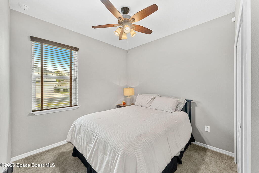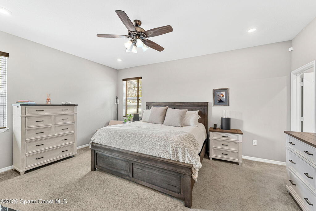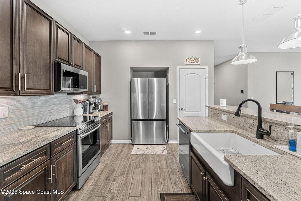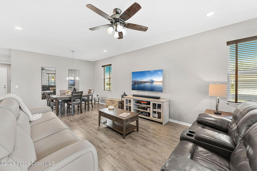 Completed in 2018 this Energy Star-rated residence reflects intentional upgrades & meticulous upkeep throughout. Wood-look tile defines the main living areas, while upgraded porcelain tile enhances walkways & baths beneath 9-ft ceilings & expanded LED lighting, including added accents at the media wall & primary suite. The kitchen showcases upgraded Samsung appliances, professionally sealed granite, an extended breakfast bar & taller smoke-tone cabinetry, w/ reimagined storage featuring deeper shelving, enhanced pantry capacity & a double-hang primary closet system. Both baths offer upgraded shower enclosures & improved drawer storage. Comfort is reinforced by ceiling fans in every bedroom & living space, a higher SEER HVAC system w/ upgraded venting, return air improvements & MERV 11 filtration. Feel spoiled w/ water-efficient fixtures, a 2-ft garage extension w/ lifetime epoxy flooring, full gutters, added hose bib, security lighting & a pre-wired patio.