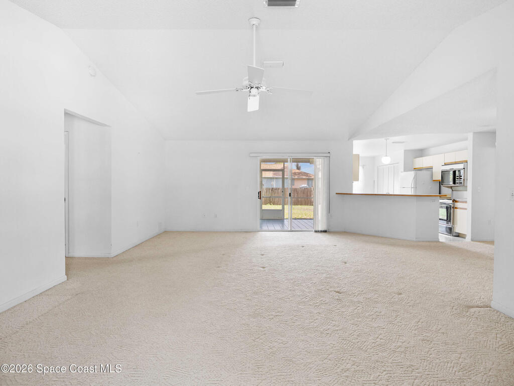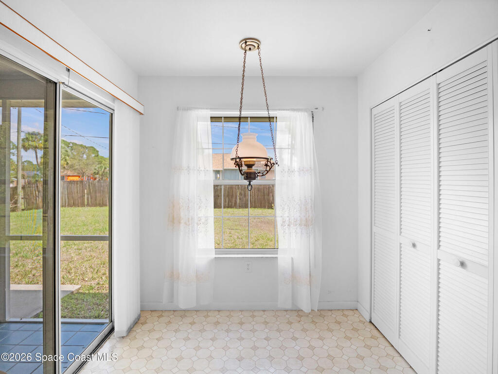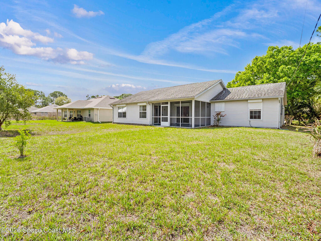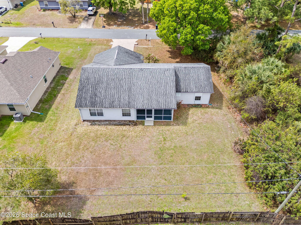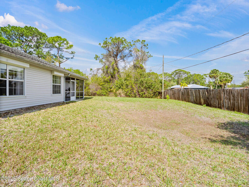 This home offers a warm, inviting feel with a layout designed for easy, comfortable living. The main living and dining areas flow into an open kitchen with abundant counter space, a breakfast bar, an eat-in nook, and a large pantry, creating a practical space for cooking and gathering. The split floor plan provides privacy, with a primary suite featuring a walk-in closet and an updated bath. High ceilings and generous windows fill the home with natural light. Step out to the screened porch overlooking a large fenced backyard with room for pets, gardening, play areas, or future outdoor additions. Additional highlights include a newer AC unit, a slightly older roof, indoor laundry, and a two-car garage. Thoughtfully maintained and move-in ready, this home sits in a quiet SE Palm Bay neighborhood close to schools, shopping, I-95, and the Bayside Lakes corridor--offering a comfortable blend of space, convenience, and relaxed Florida living