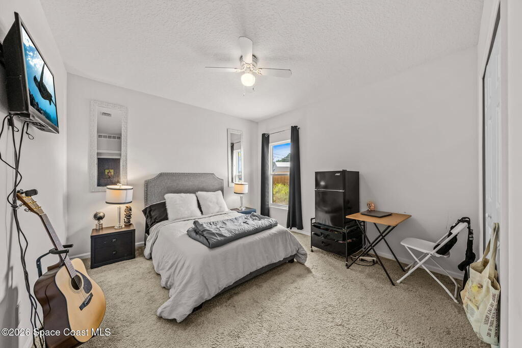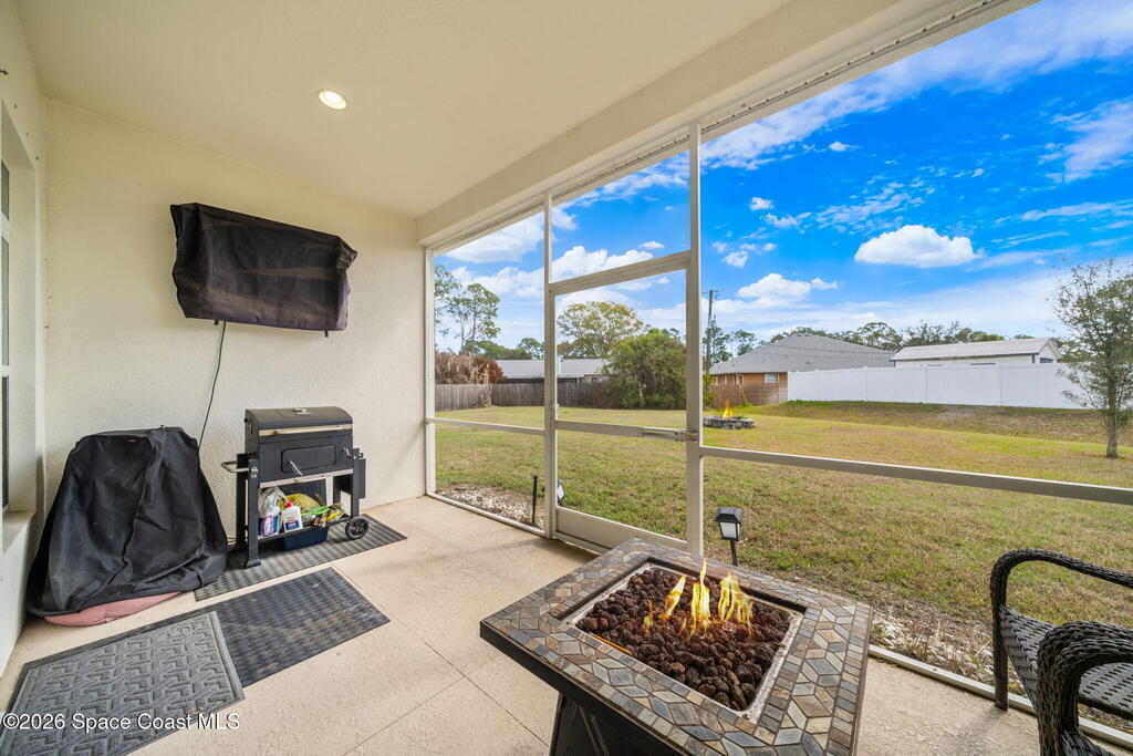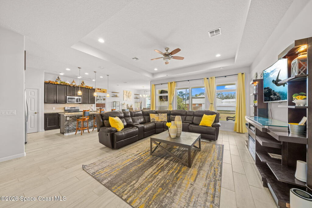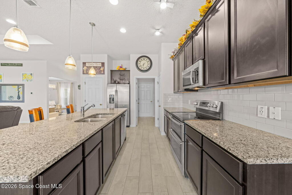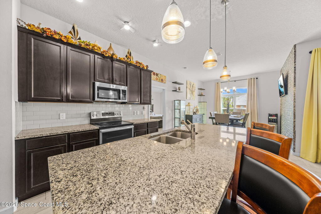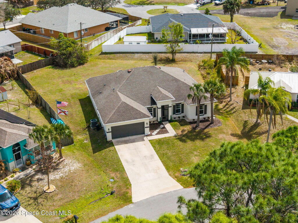 Built in 2019, this well-maintained concrete block home offers modern construction and a desirable location in SE Palm Bay, just minutes from the new Shops of Cypress Bay and everyday conveniences. Connected to city water, the home combines comfort, efficiency, and functionality.Inside, you'll find a bright open floor plan featuring 9'4'' ceilings, tiled living areas, and abundant natural light throughout the main living spaces. The kitchen is designed for both style and practicality, showcasing granite countertops, 42'' cabinets, stainless steel appliances, and a classic subway tile backsplash, all overlooking the main living and dining areas -- perfect for entertaining or everyday living.The spacious primary suite features double sinks, a separate water closet, and a large walk-in closet. A split-bedroom layout provides added privacy, with three additional bedrooms and a shared full bath located on the opposite side of the home.