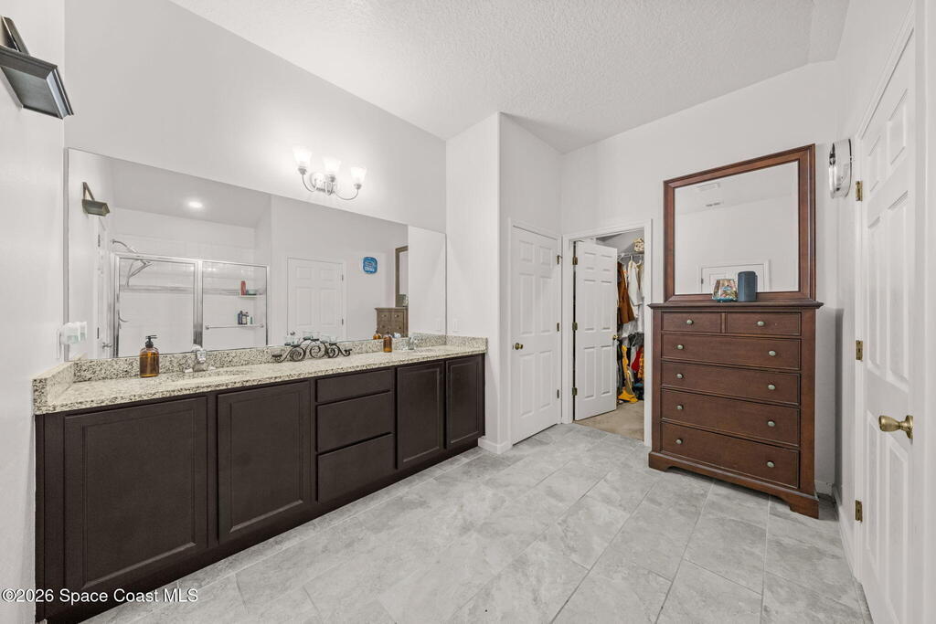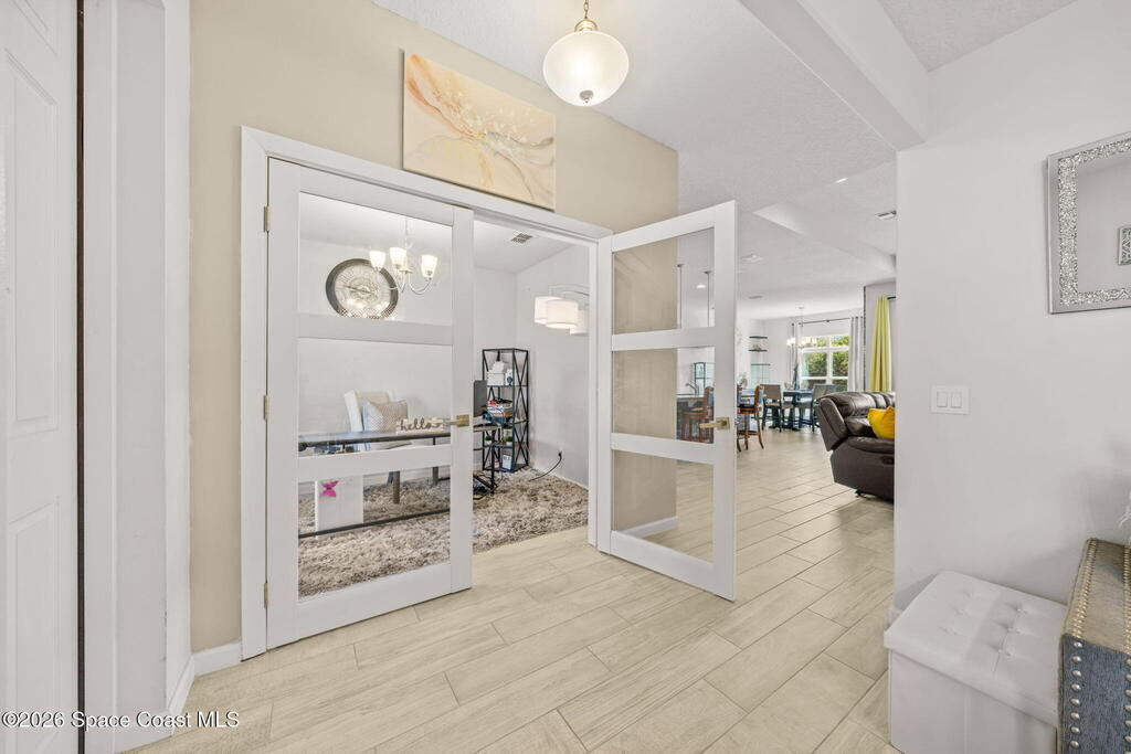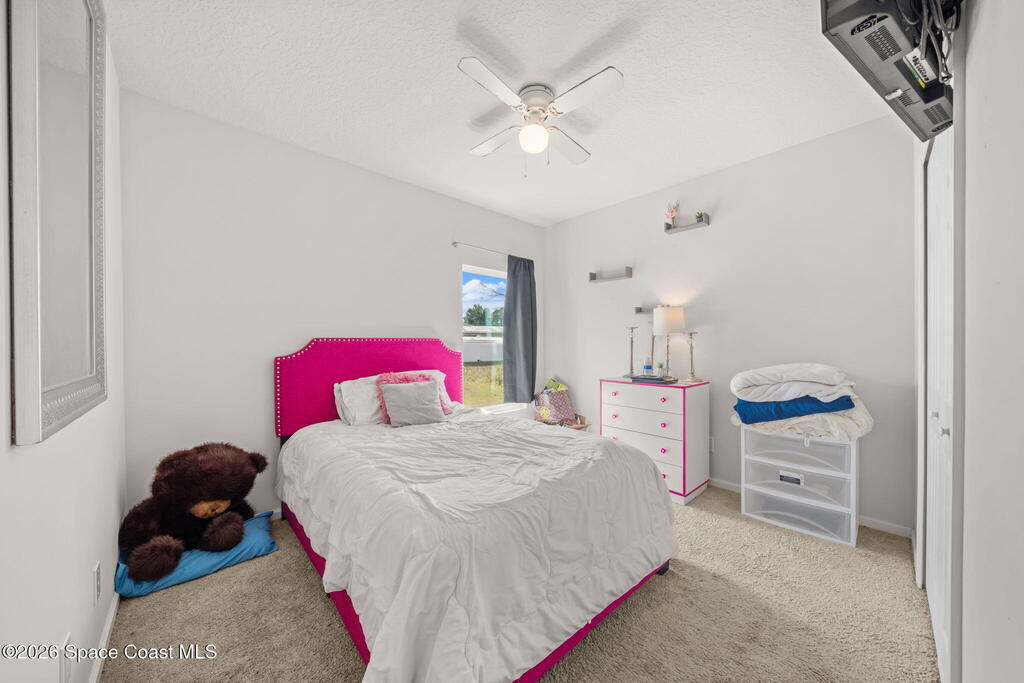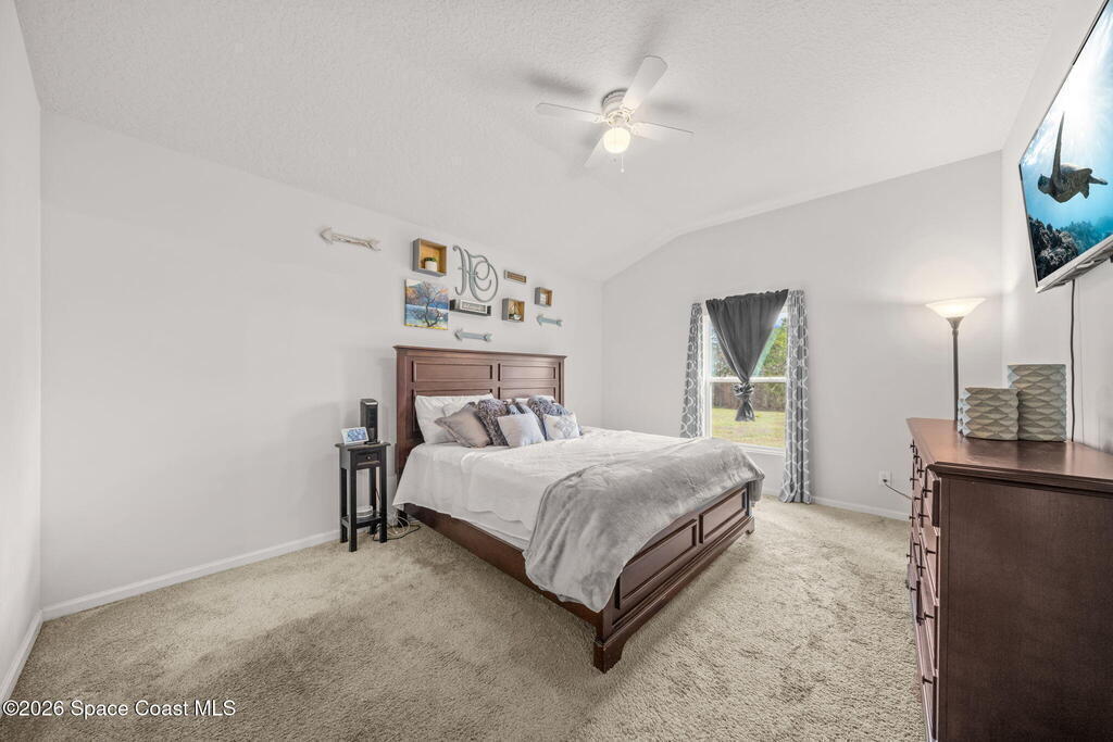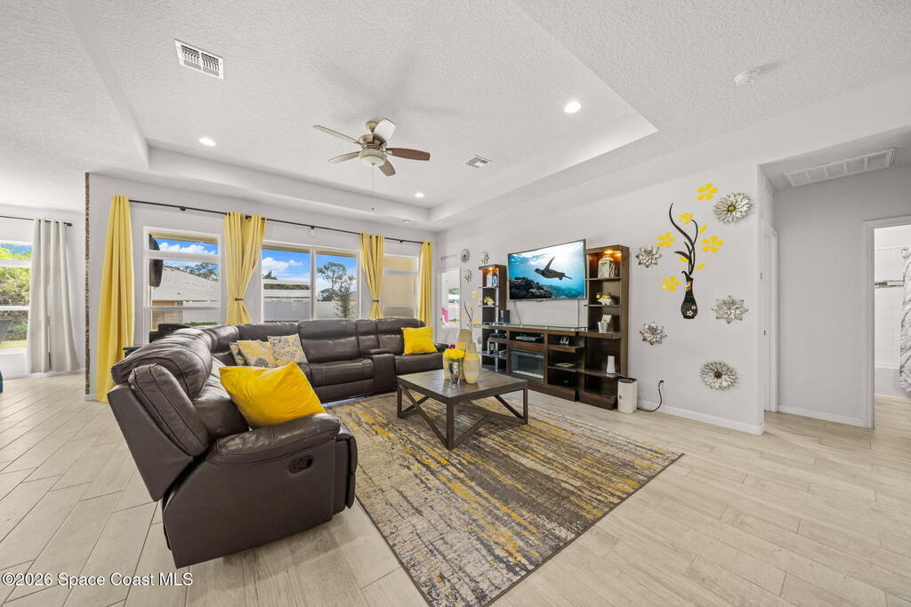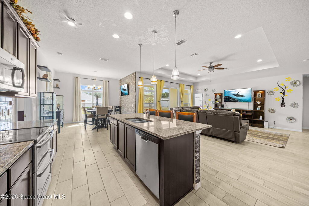 Built in 2019, this well-maintained concrete block home offers modern construction and a desirable location in SE Palm Bay, just minutes from the new Shops of Cypress Bay and everyday conveniences. Connected to city water, the home combines comfort, efficiency, and functionality.Inside, you'll find a bright open floor plan featuring 9'4'' ceilings, tiled living areas, and abundant natural light throughout the main living spaces. The kitchen is designed for both style and practicality, showcasing granite countertops, 42'' cabinets, stainless steel appliances, and a classic subway tile backsplash, all overlooking the main living and dining areas -- perfect for entertaining or everyday living.The spacious primary suite features double sinks, a separate water closet, and a large walk-in closet. A split-bedroom layout provides added privacy, with three additional bedrooms and a shared full bath located on the opposite side of the home.