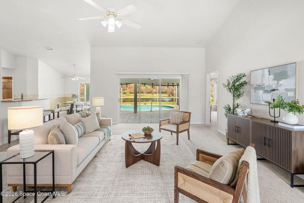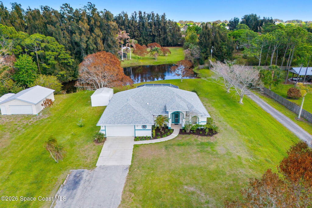 Lakefront living on a sprawling 1.27-acre lot w/mango trees! The screened pool & lanai capture peaceful lake views, creating a private backyard escape with room to spread out & enjoy. Inside, a bright open great room plan flows through triple sliders to the lanai, blending indoor & outdoor living. The kitchen shines w/stainless steel appliances, granite counters, crown-molded cabinetry, breakfast bar & breakfast nook overlooking the pool & lake, while a formal dining area adds space for gatherings. The primary suite features a tray ceiling, direct pool access, walk-in closet, jetted tub, large tiled shower & granite vanity. Two bedrooms sit across the home near the 2nd bath w/pool door, while the 4th bedroom at the front works well as an office or flex space. Oversized laundry room w/washer, dryer, sink & storage. New water heater, new pool pump & roof (2022). Separate oversized shed for riding mower, lawn equipment & extra storage.