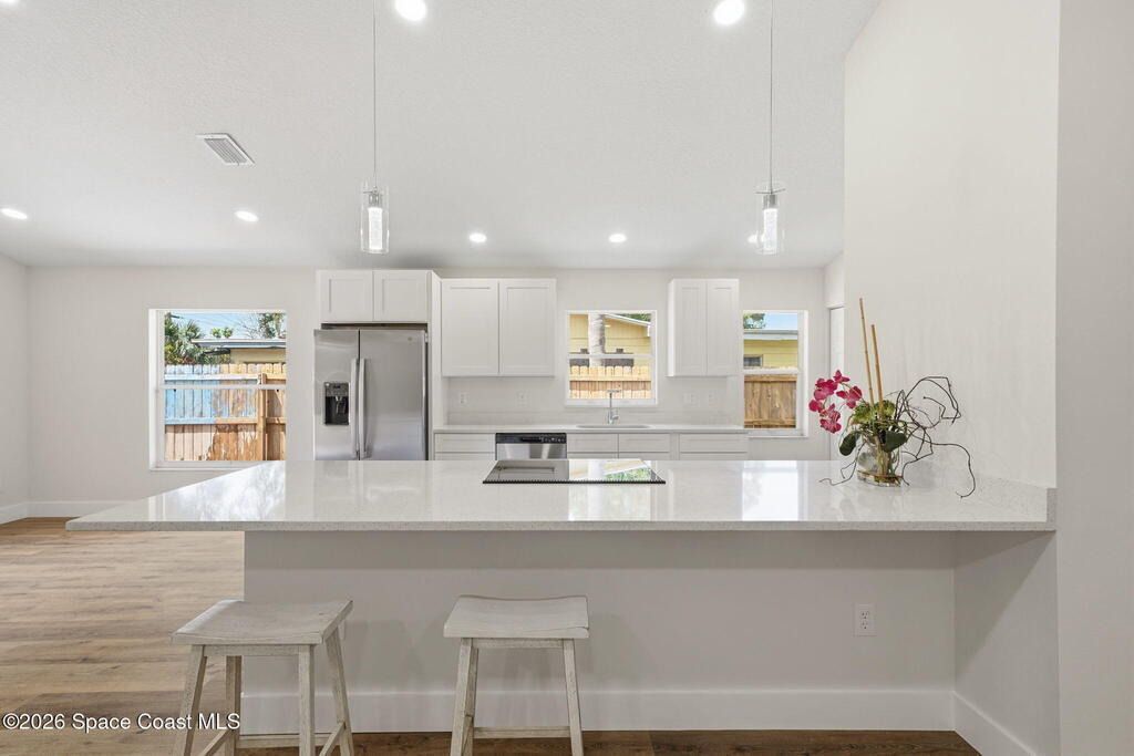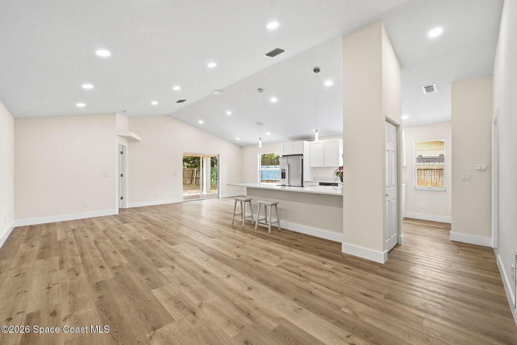Welcome to West Melbourne with NO HOA. Recently renovated, a shortened list of some major enhancements include: new roof, water heater, a/c, flooring, modern cabinets, etc...We can't wait to show off what we've been up to inside! Cathedral ceilings add to the great room, creating an open, beautiful living space. This property will be fully fenced and features a 2 car garage with a spacious driveway accommodating up to four additional vehicles. Nicely rated school systems in this area. Minutes from shopping, dining, and entertainment, approximately a 10 minute drive to the beach. It's almost ready! Some final touches in progress, you are welcome to come in, please pardon some possible dust though.