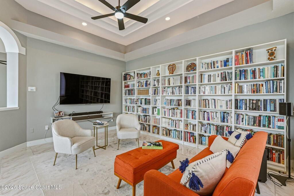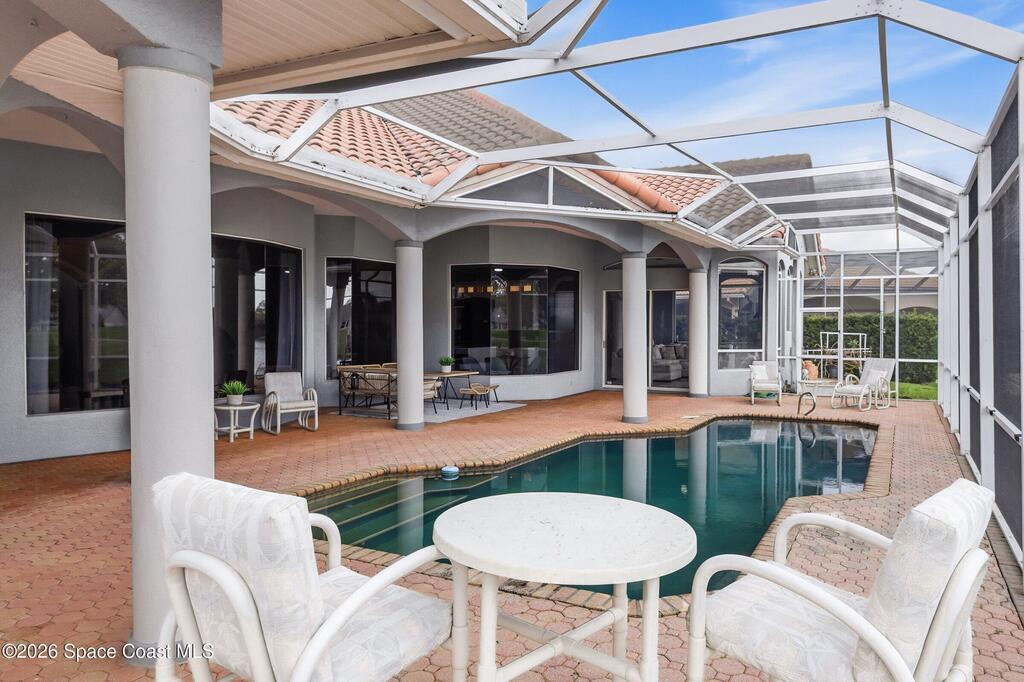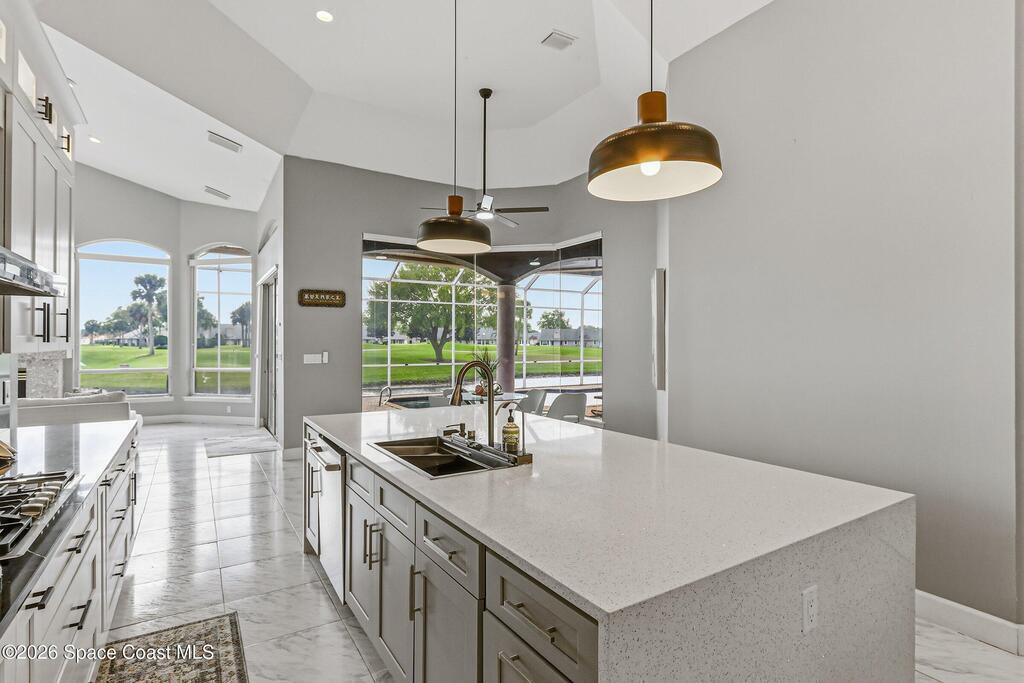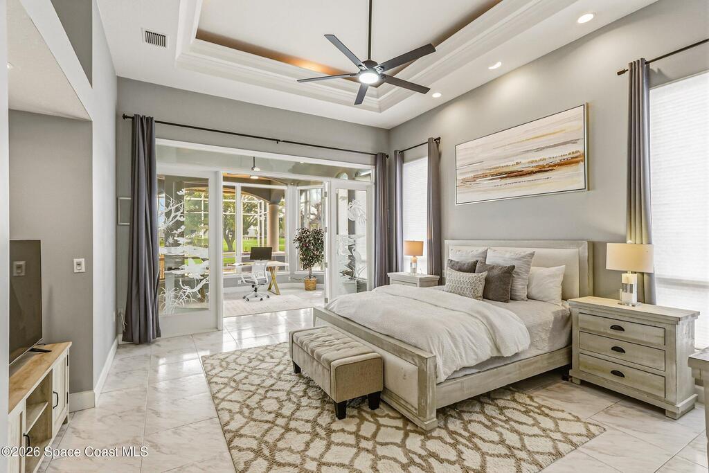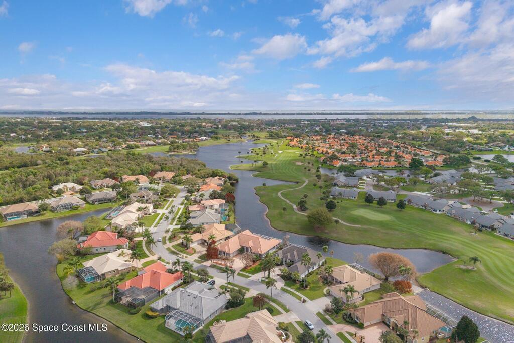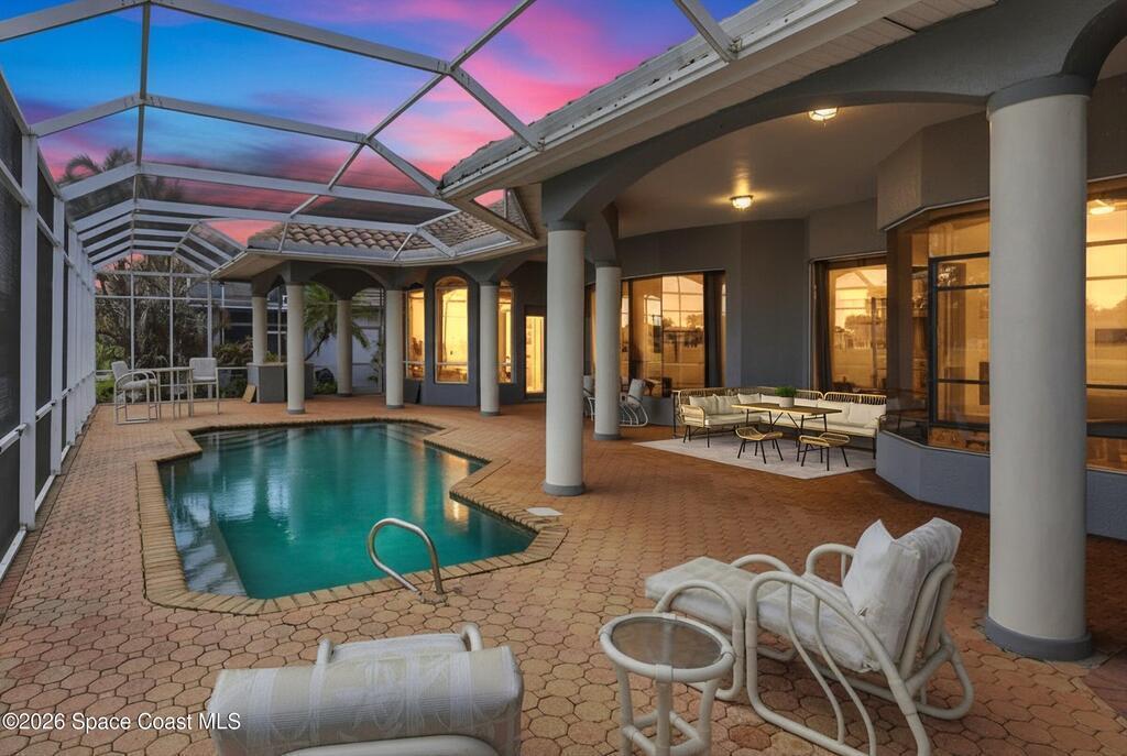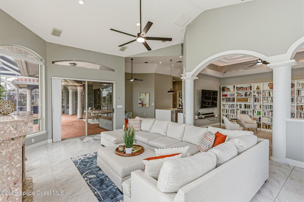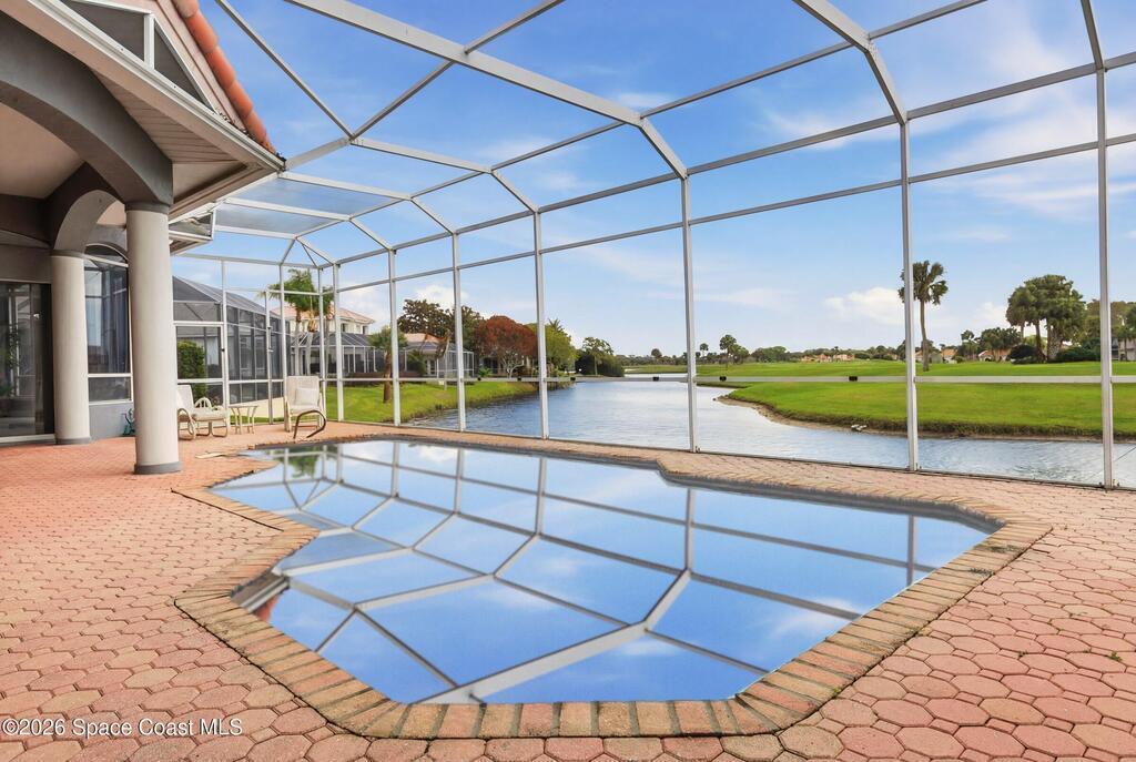 Discover an extraordinary lakefront estate in the Legends at Suntree. Offering 4,449sq ft of refined living space with sweeping golf course and lake views, this impressive 5 bedroom 3.5 bath residence blends grand scale with elegant design. Beginning with a dramatic 16' foyer and soaring 12-14' ceilings throughout accented by tray ceilings in the primary suite, living, family and dining rooms this home is designed for both sophisticated entertaining and everyday comfort. The home features a private library, media room and open living flow that captures stunning water and fairway vistas. The chef kitchen is beautifully appointed with quartz countertops a striking waterfall island and GE Cafe appliances. The luxurious primary suite offers a slipper tub, oversized walk-in shower and expansive his and hers closets. Outdoors a resort style pool and screened lanai overlook the tranquil lake and golf course scenery, completing this exceptional three-car garage estate.