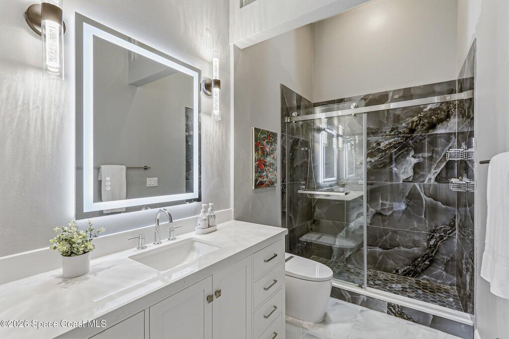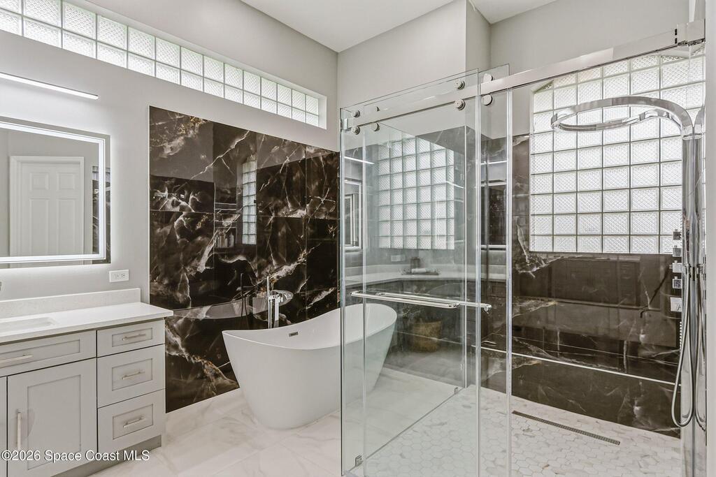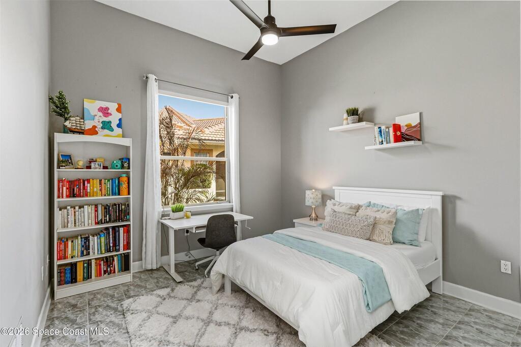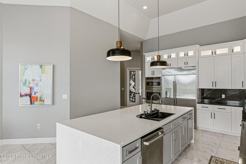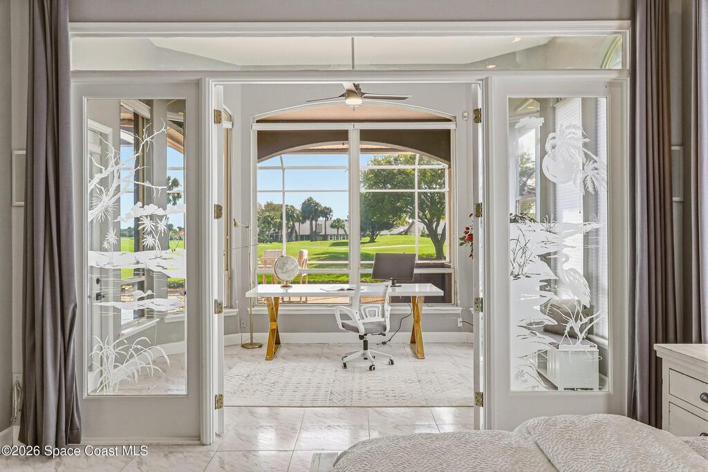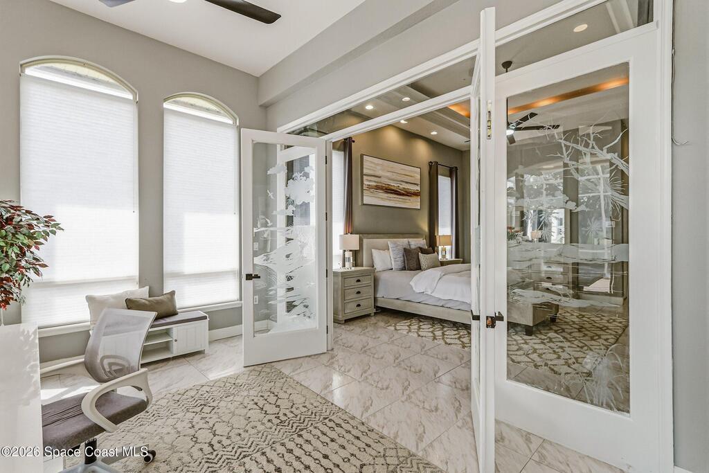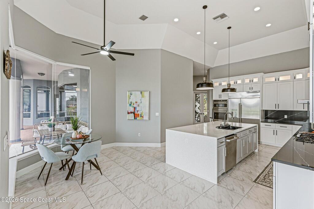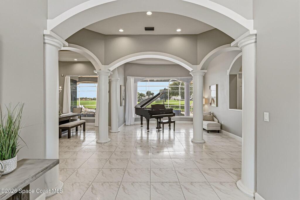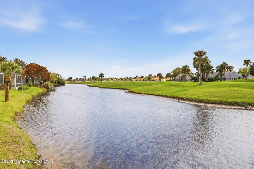 Discover an extraordinary lakefront estate in the Legends at Suntree. Offering 4,449sq ft of refined living space with sweeping golf course and lake views, this impressive 5 bedroom 3.5 bath residence blends grand scale with elegant design. Beginning with a dramatic 16' foyer and soaring 12-14' ceilings throughout accented by tray ceilings in the primary suite, living, family and dining rooms this home is designed for both sophisticated entertaining and everyday comfort. The home features a private library, media room and open living flow that captures stunning water and fairway vistas. The chef kitchen is beautifully appointed with quartz countertops a striking waterfall island and GE Cafe appliances. The luxurious primary suite offers a slipper tub, oversized walk-in shower and expansive his and hers closets. Outdoors a resort style pool and screened lanai overlook the tranquil lake and golf course scenery, completing this exceptional three-car garage estate.