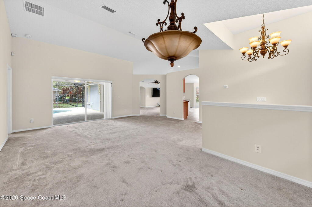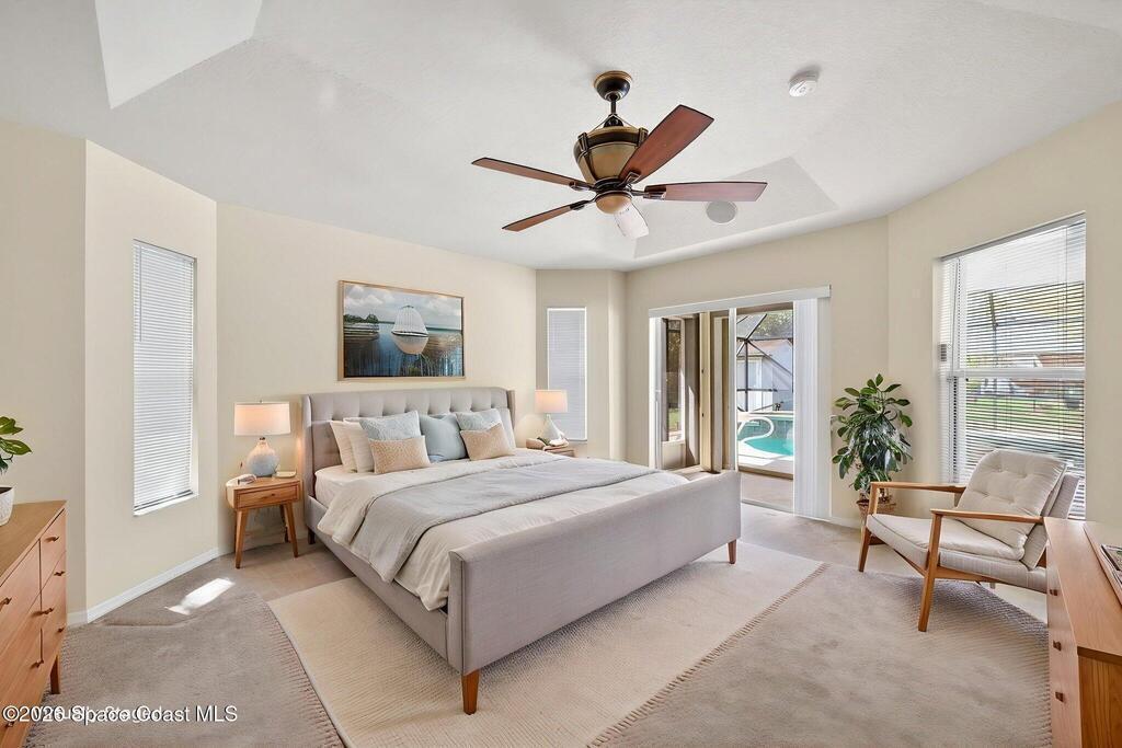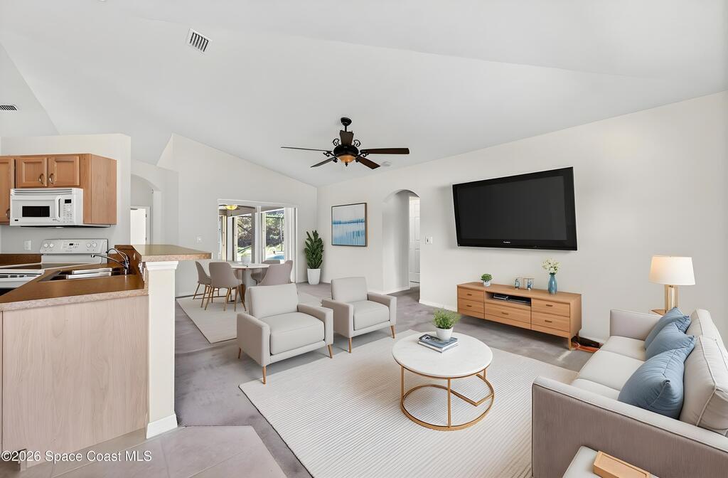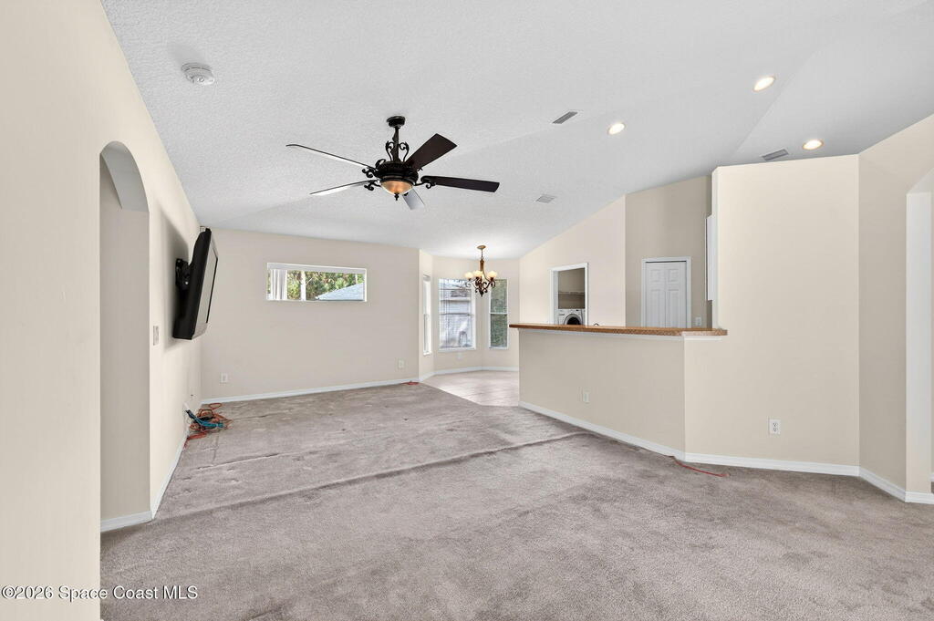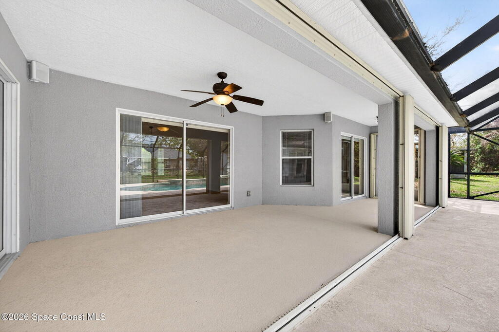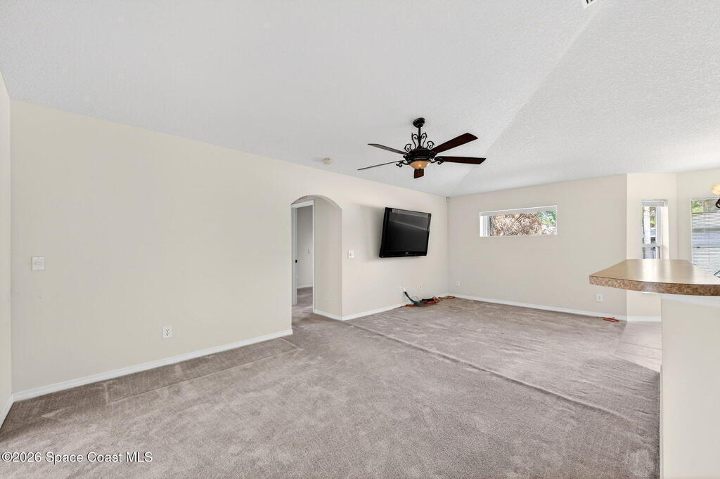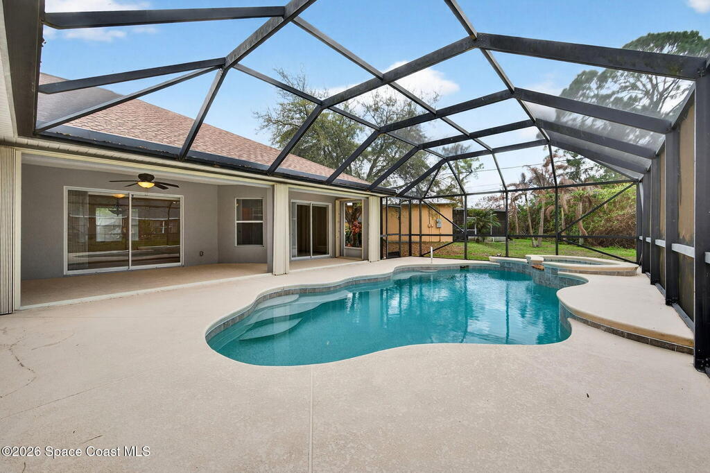 This 3 bedroom, 2 bath home features a desirable split floor plan & is located on a cul-de-sac. Designed with functionality & entertaining in mind, the home offers a dining area & two separate living spaces. All bedrooms include walk-in closets for ample storage. Numerous windows throughout the home bring in abundant natural light. Recent updates include a 2023 roof, 2024 exterior paint, full gutters installed in 2023 & a 2018 A/C. Additional features include a water softener system, washer & dryer, and a TV connected to speakers throughout the home.Enjoy outdoor living with a screened-in heated pool and spa, perfect for relaxing or entertaining. The garage door also includes a screen enclosure for added flexibility, and a backyard shed provides additional storage space. Conveniently positioned close to shopping, dining, parks, and schools, this home offers easy access to everyday essentials while maintaining a quiet cul-de-sac setting.